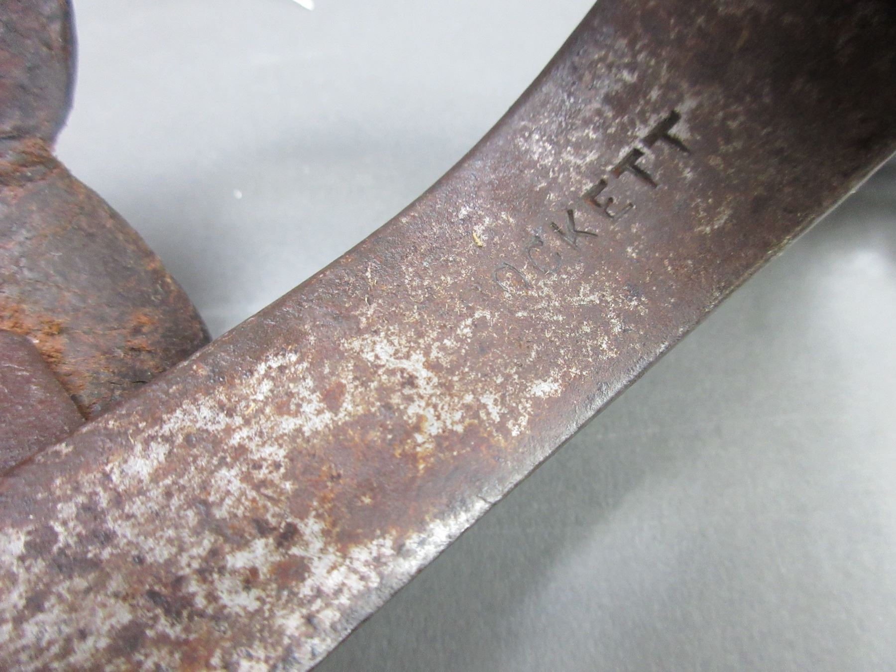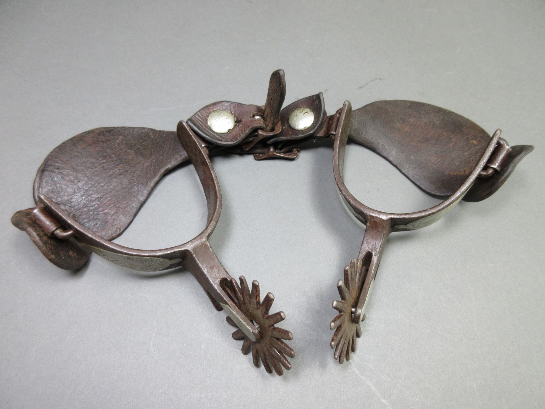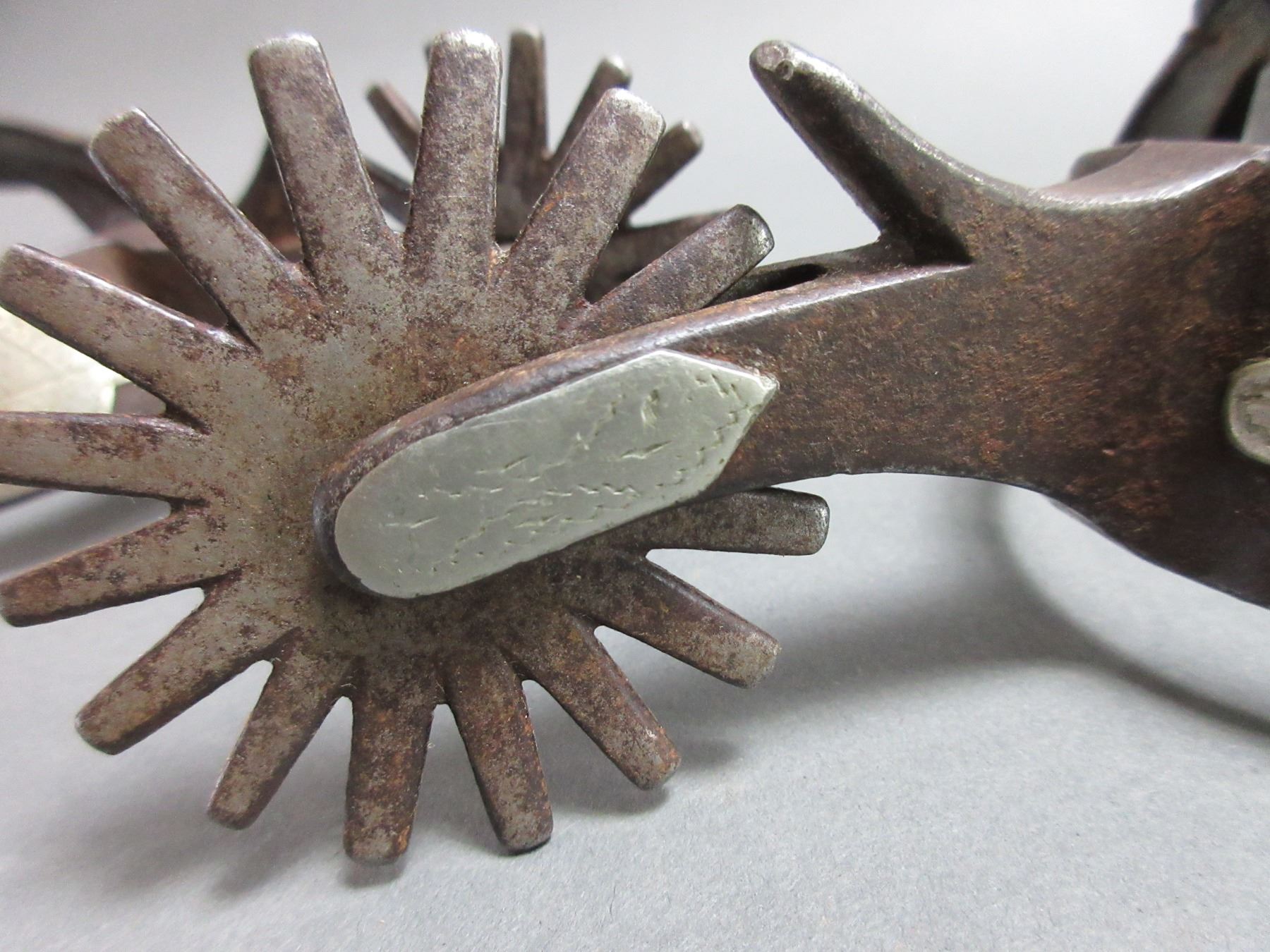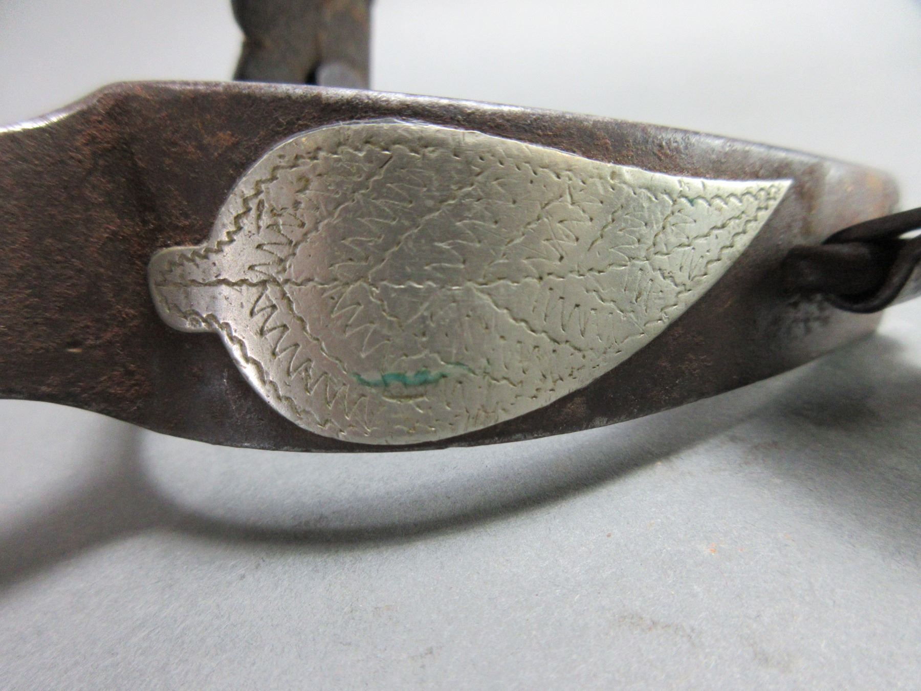 Marked O Crockett Inside The Band Silver Overlaid Double Mounted Spurs- 1.2" Heavy Bands- 2.5" Shanks- 2.25" 16 Point Rowels- Tooled Straps- Decent Condition