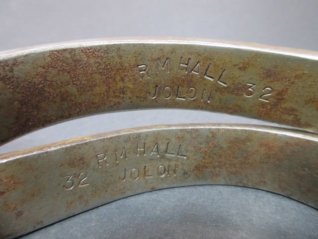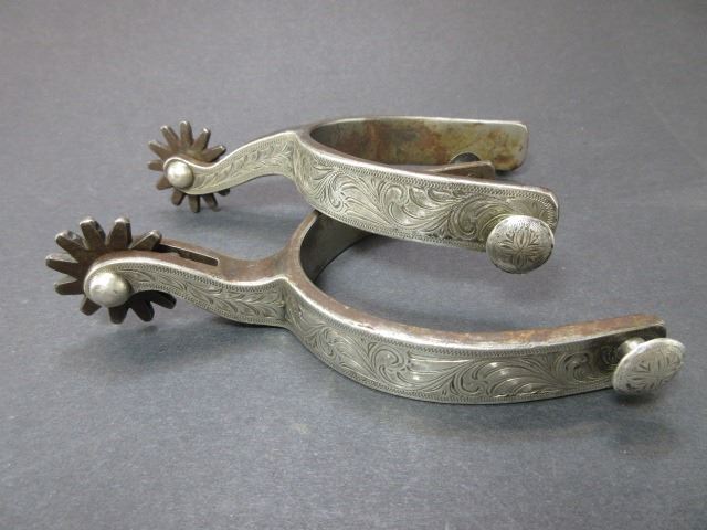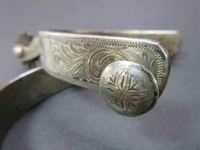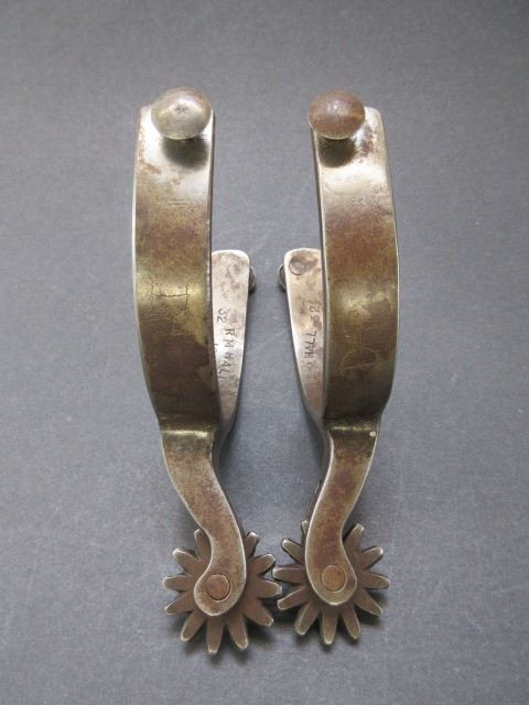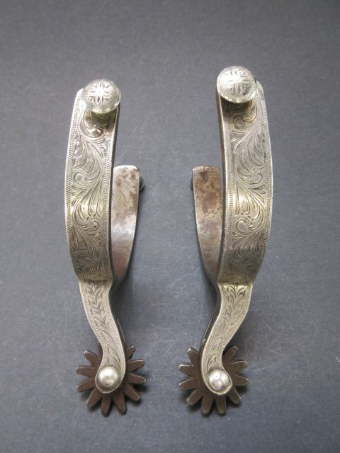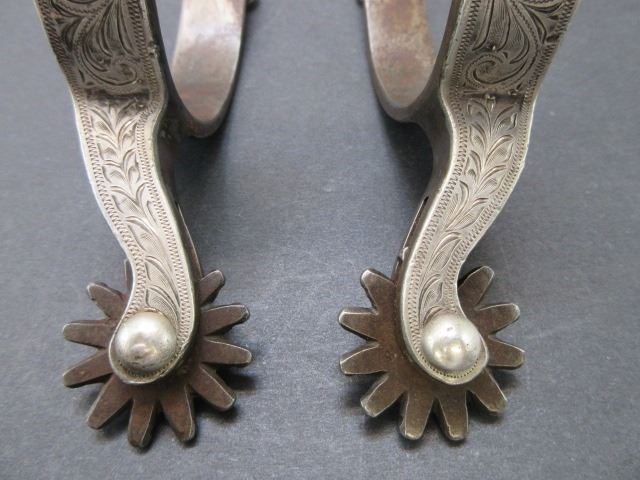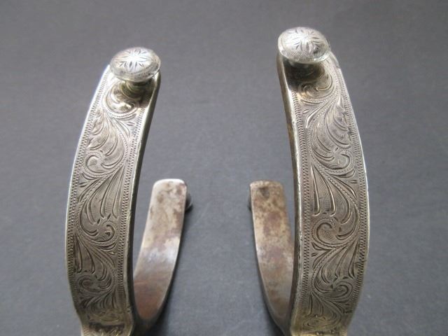 Marked RM Hall Jolon 32 Silver Overlaid Spurs- .75" Bands- 2" Shanks- 12 Point Rowels