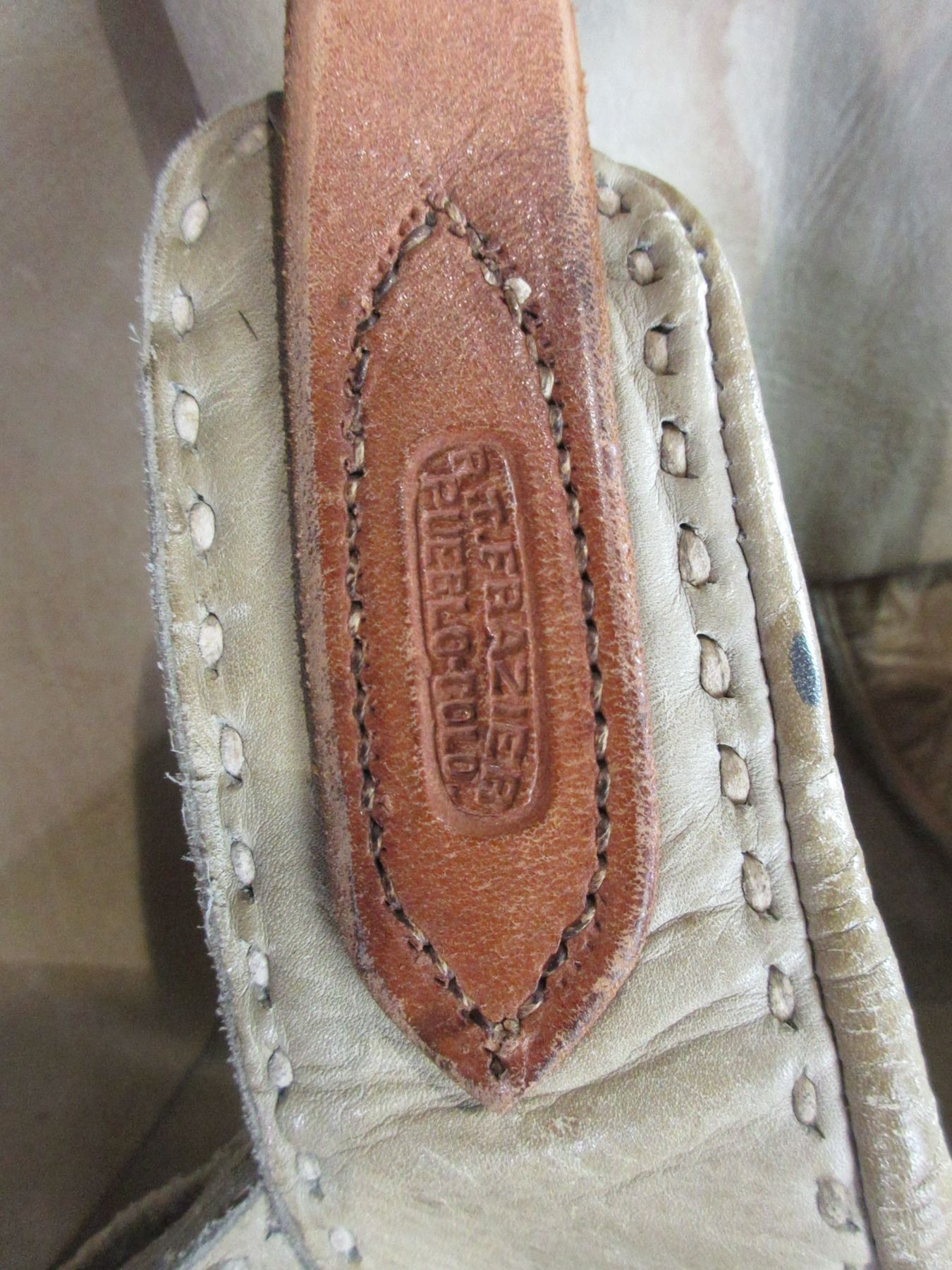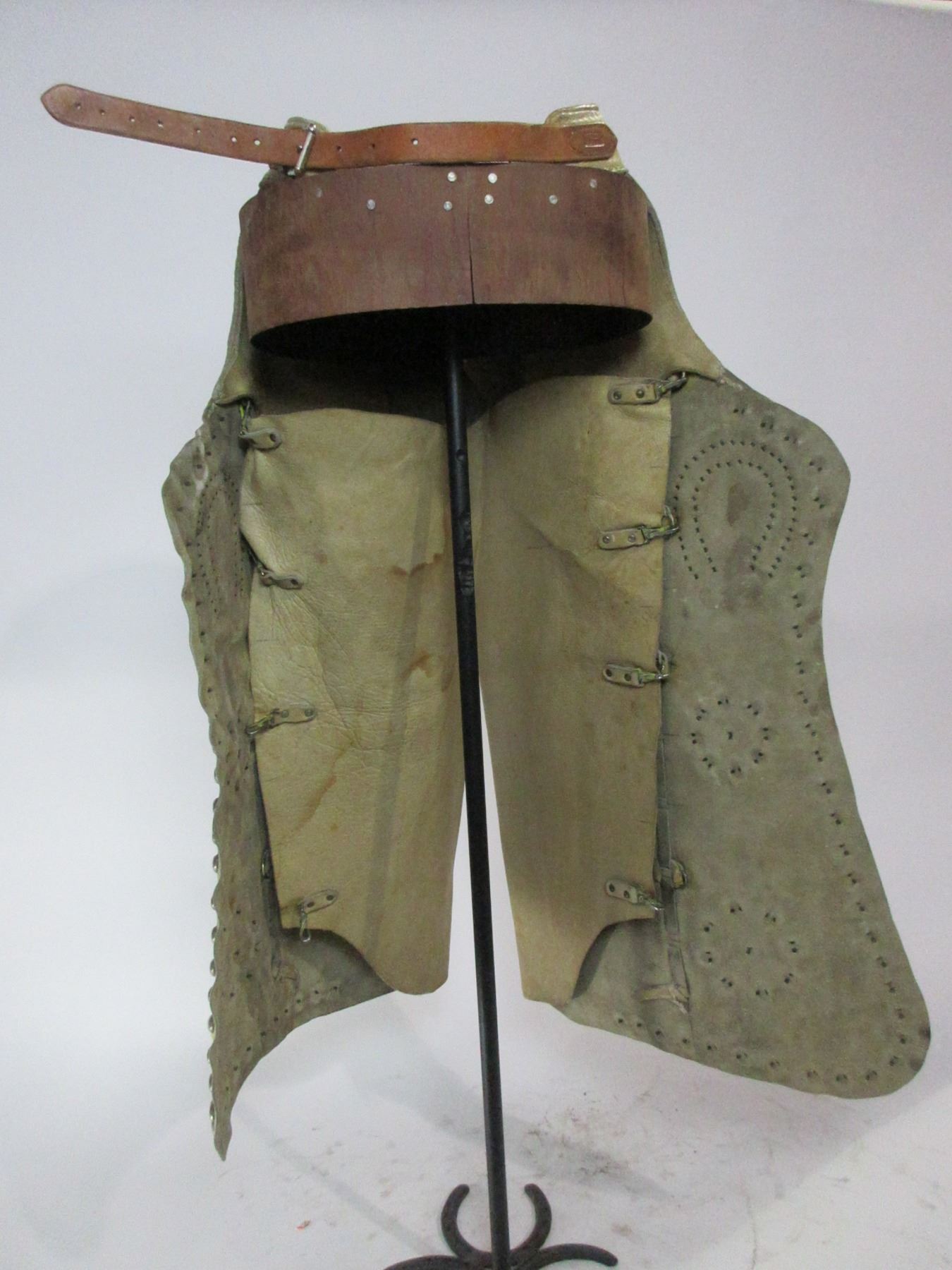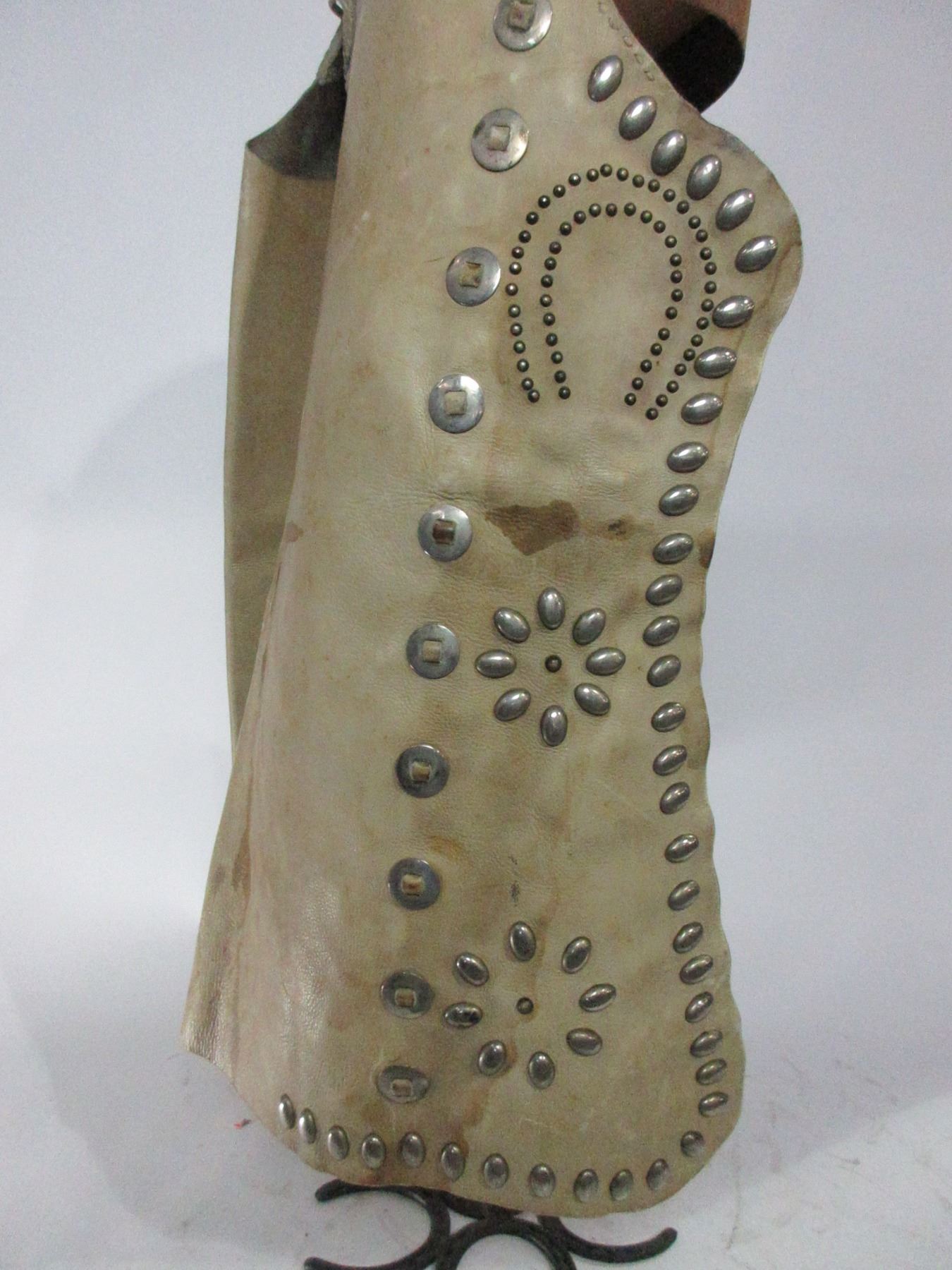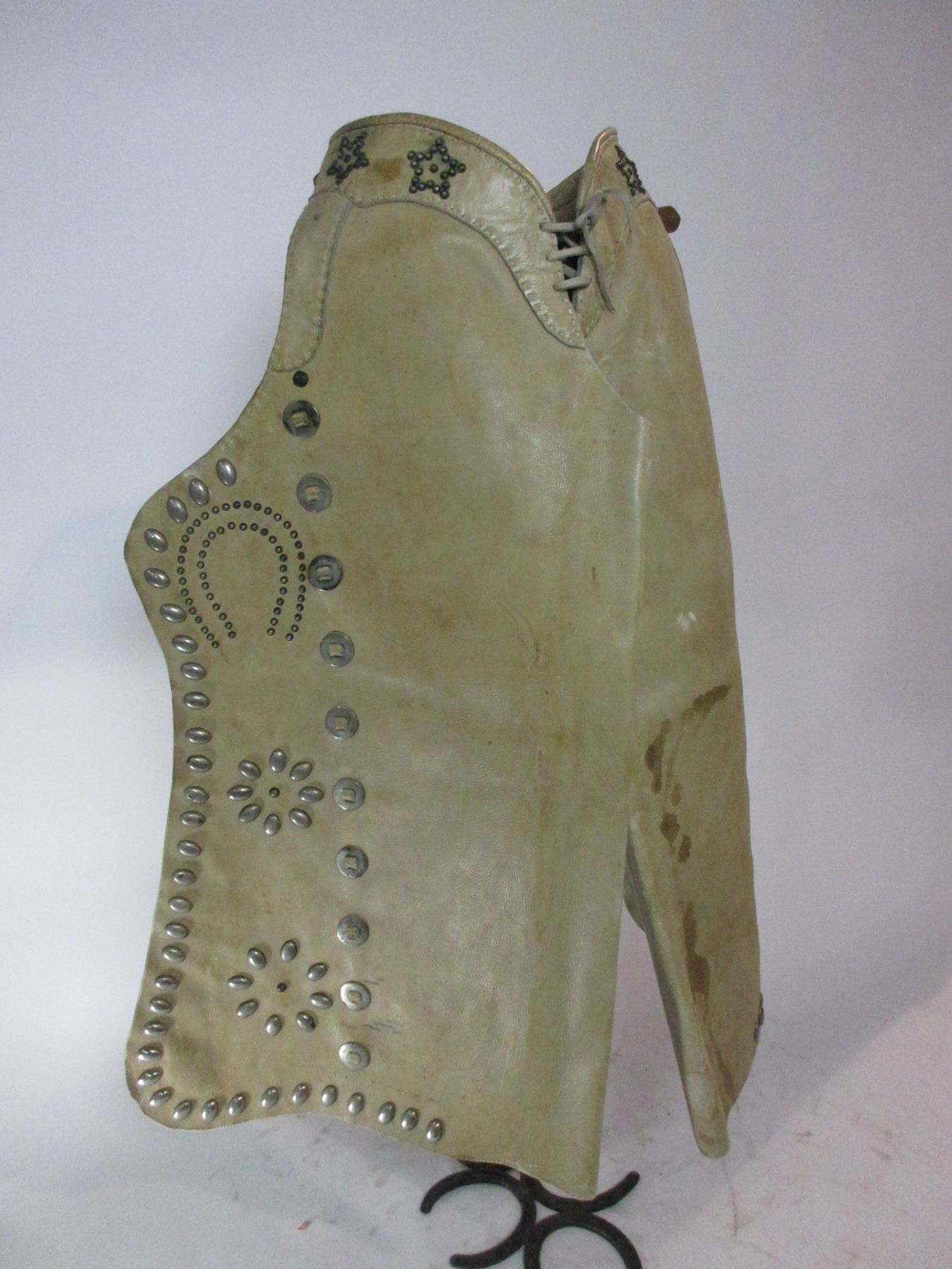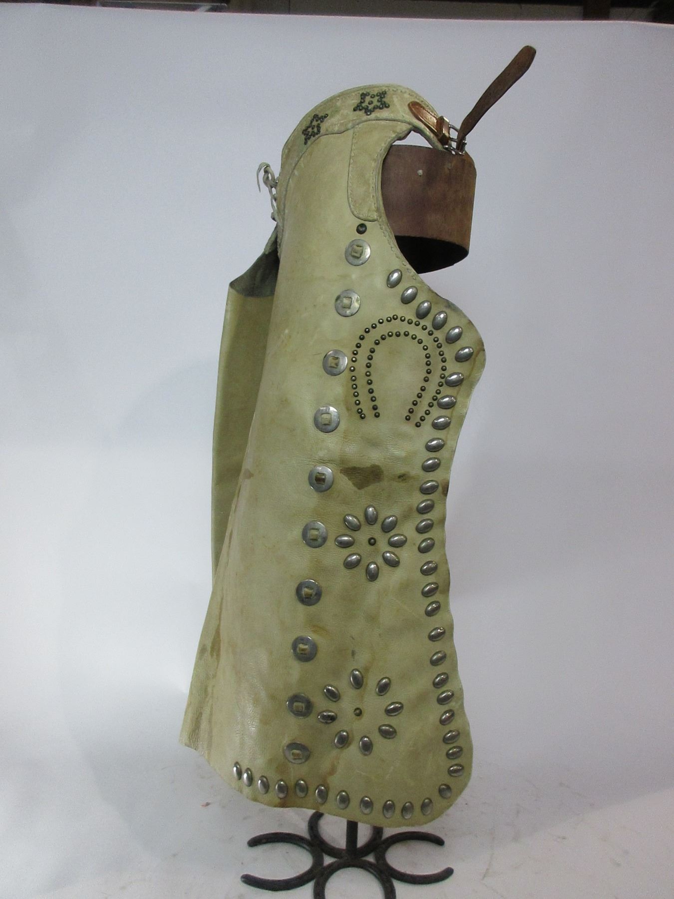 Marked RT Frazier Pueblo Colo Batwing Chaps- Rare Large Peanut Spots- Dotted Horseshoes- Dotted Hearts- 20 1.25" Conchos- 36"L- Some Staining On Leather- Finest Pair Of Frazier Chaps We Have Ever Sold
