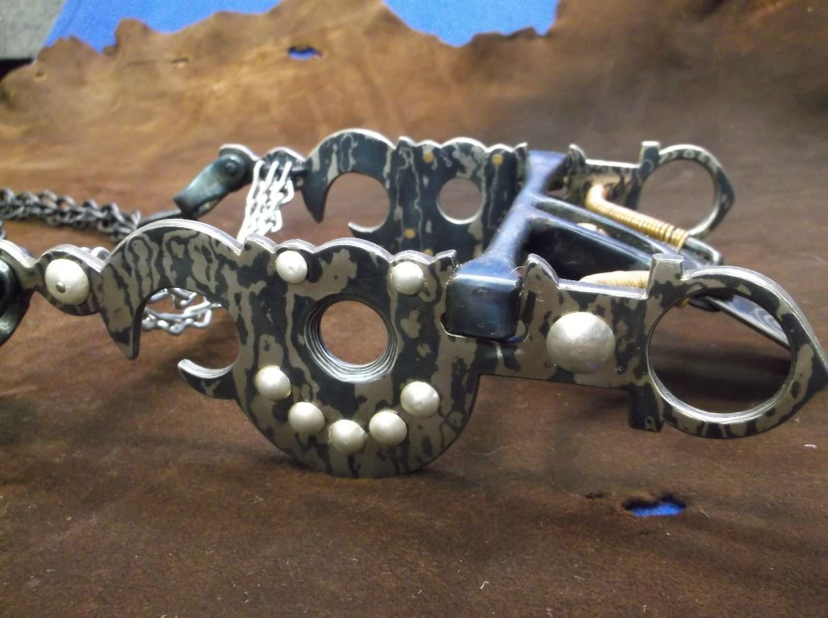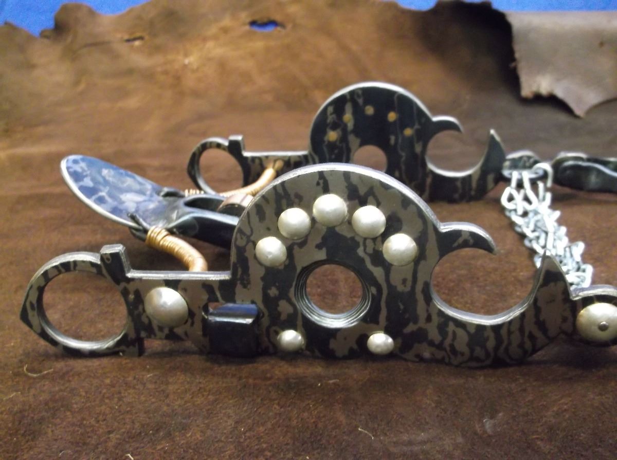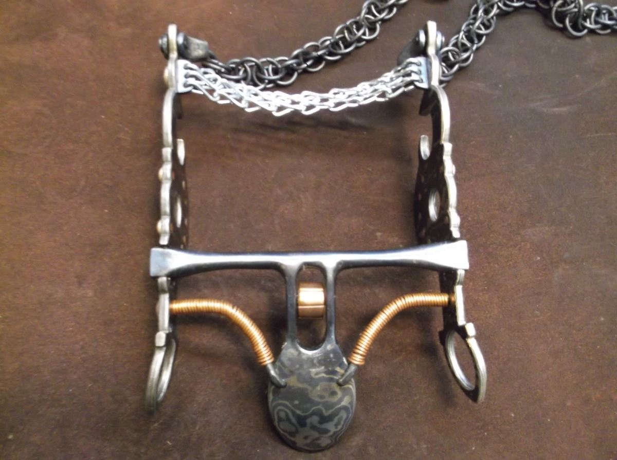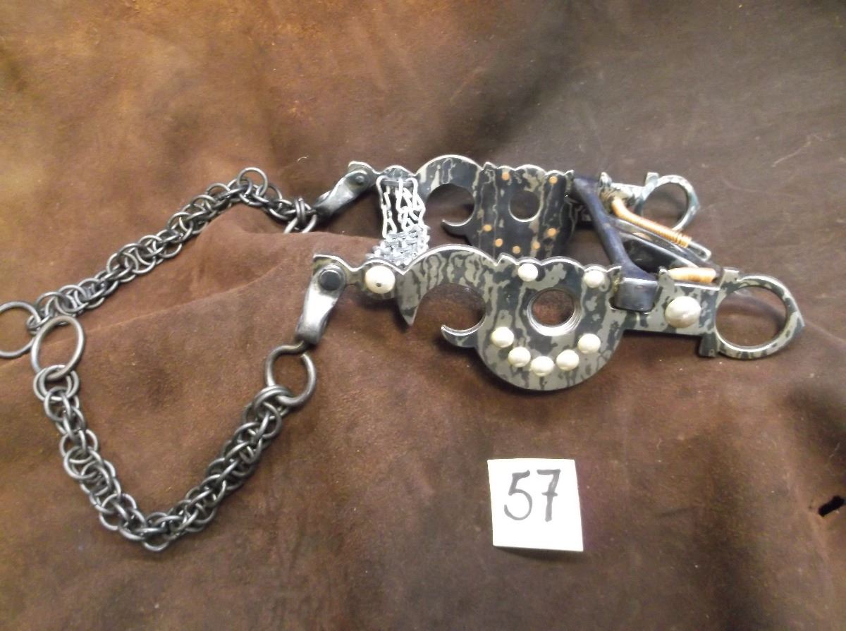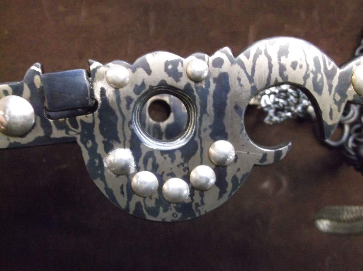 Marked Rowdy 8, Silver and Damascus Bit, Santa Barbara Cheek –Spoon Mouth, Rowdy Gingerich of Victor, Mt is one of the only bit makers combining Damascus and Silver. A young upcoming maker. Triple Slobber Chains –Rein Chains