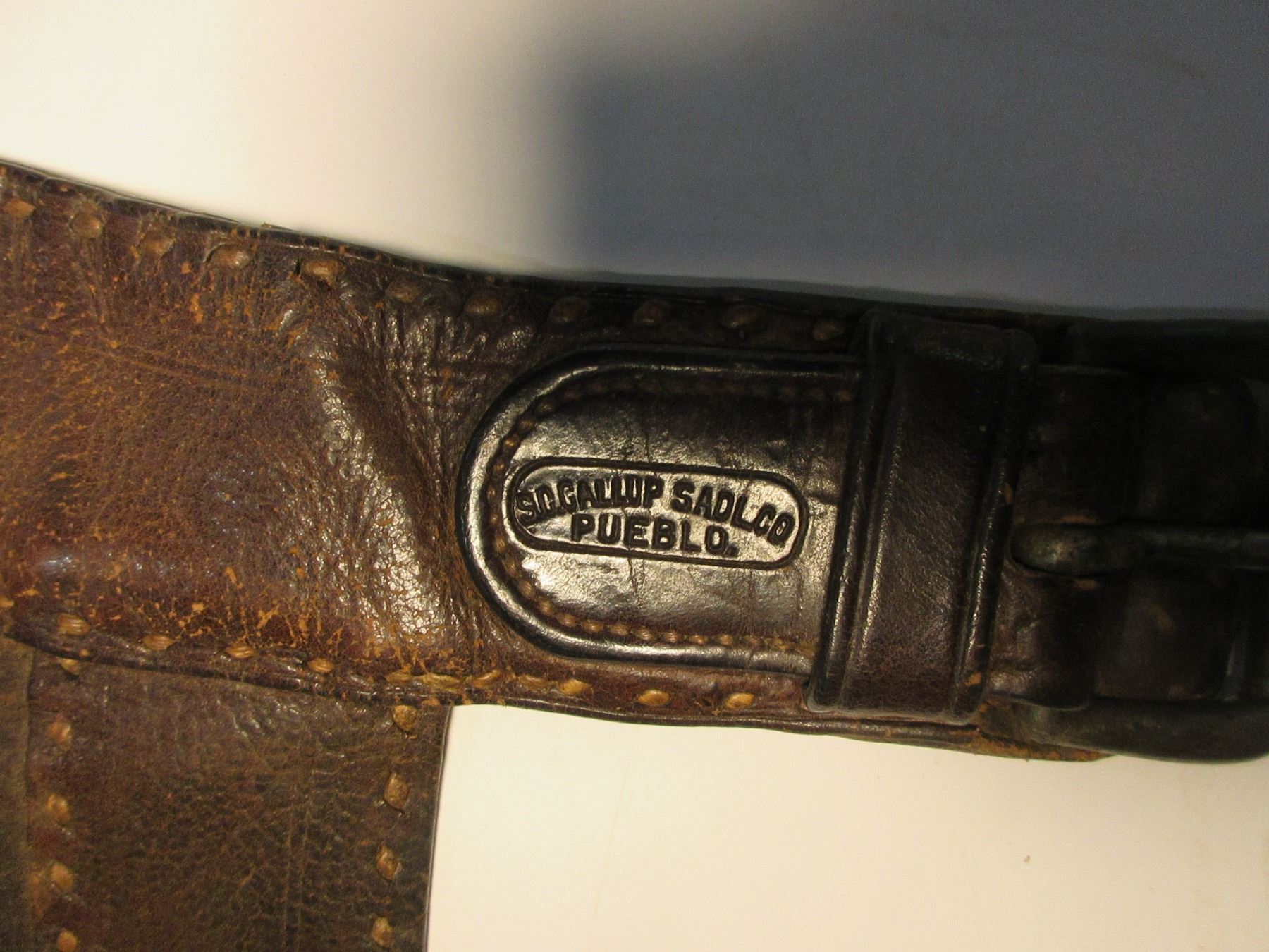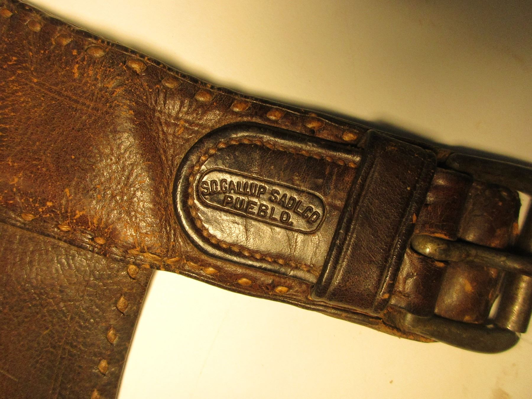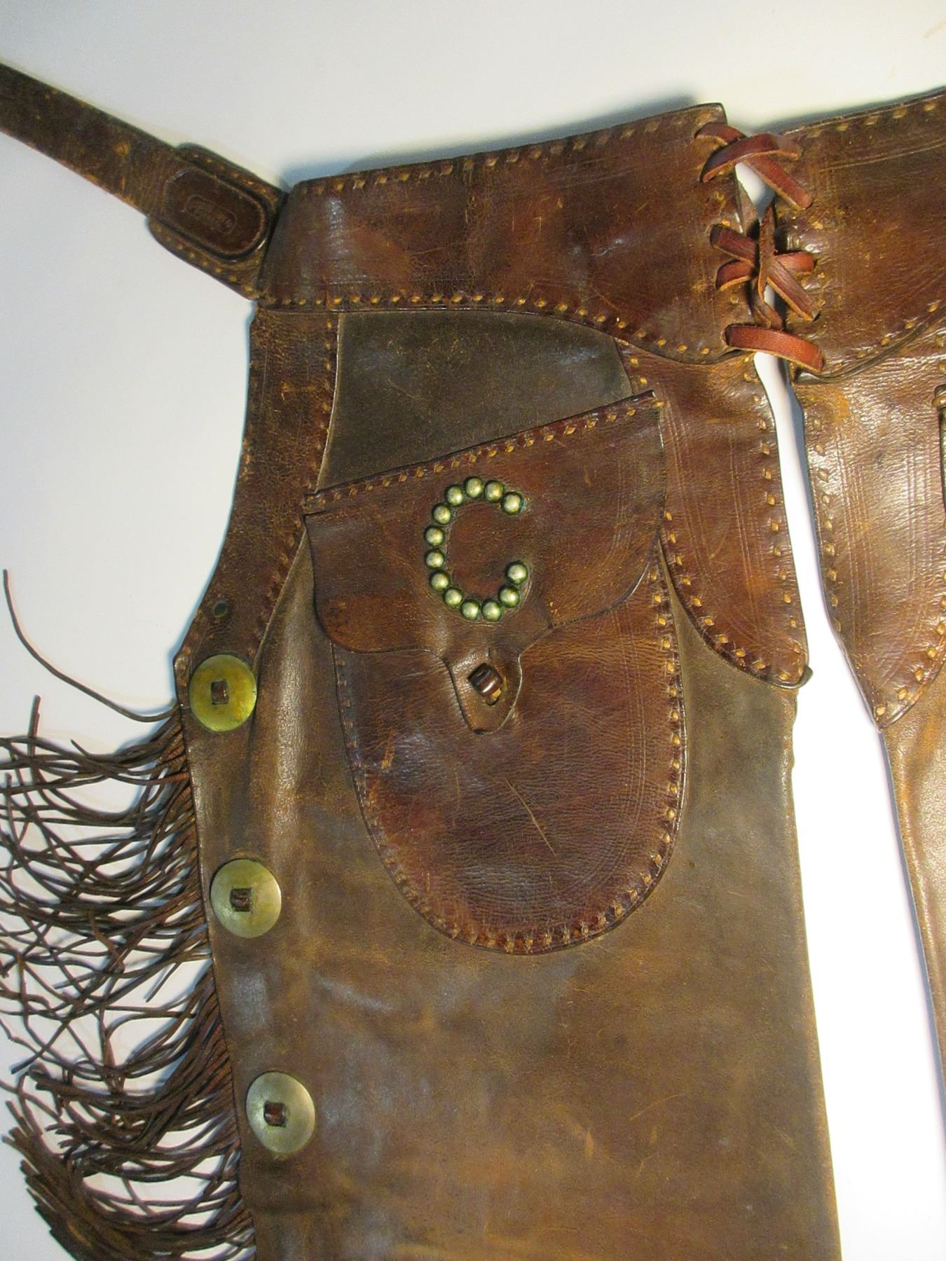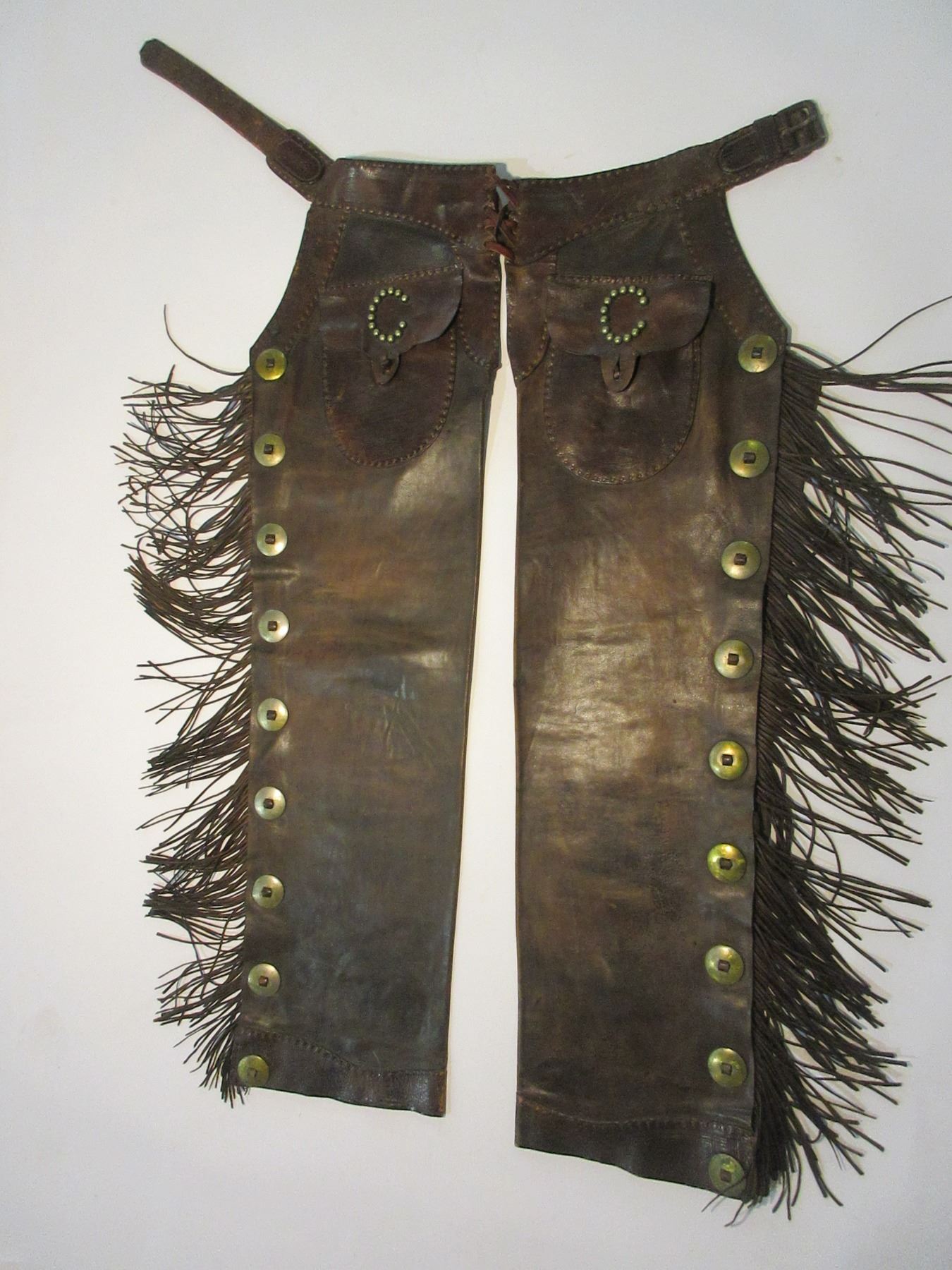 Marked S C Gallip Saddle Co Pueblo Step In Chaps- Dotted Pockets- 16 1.5" Conchos- Long Fringe- Buckstitched- 41"- Pretty Good Condition