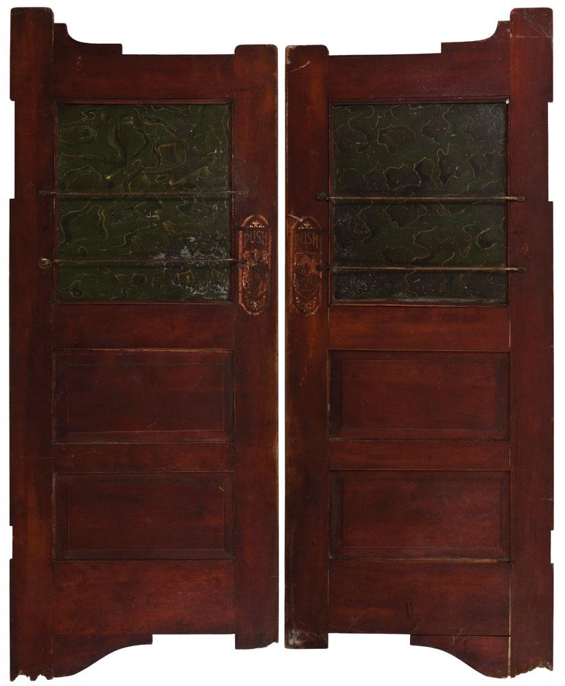 Early saloon style swinging doors by “The Brunswick Balke Collender Co. Makers Co.” on push plate area, both sides. Double brass bars one side. Inserts are decorative mottled green tin. 5’ tall by 2’ wide each. Paint on wood is raised and bubbling. Great vintage look, the authentic style of door used in the west.