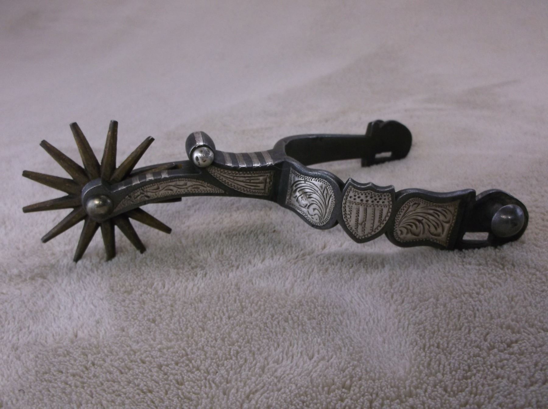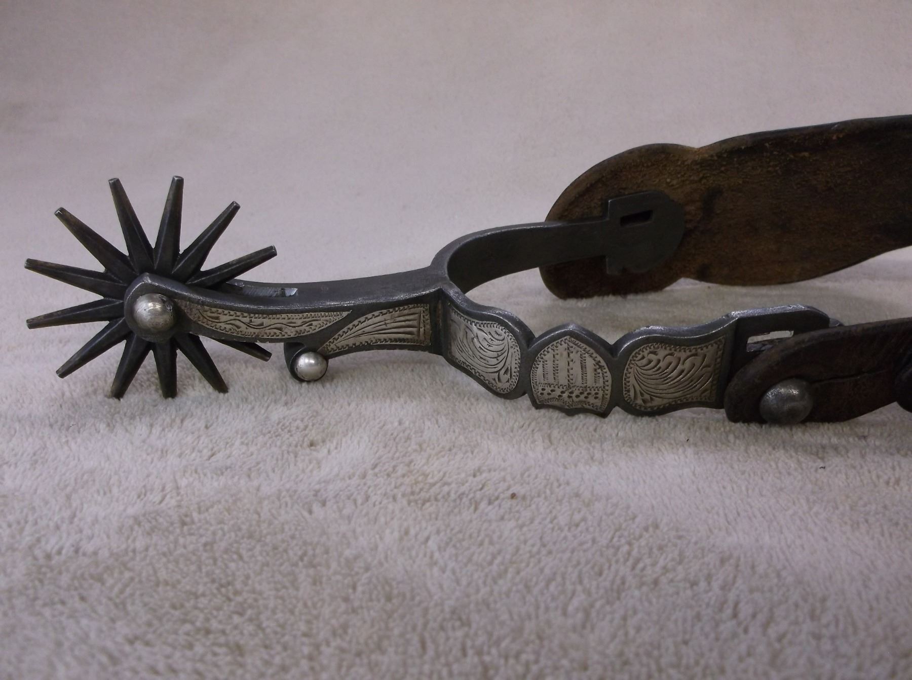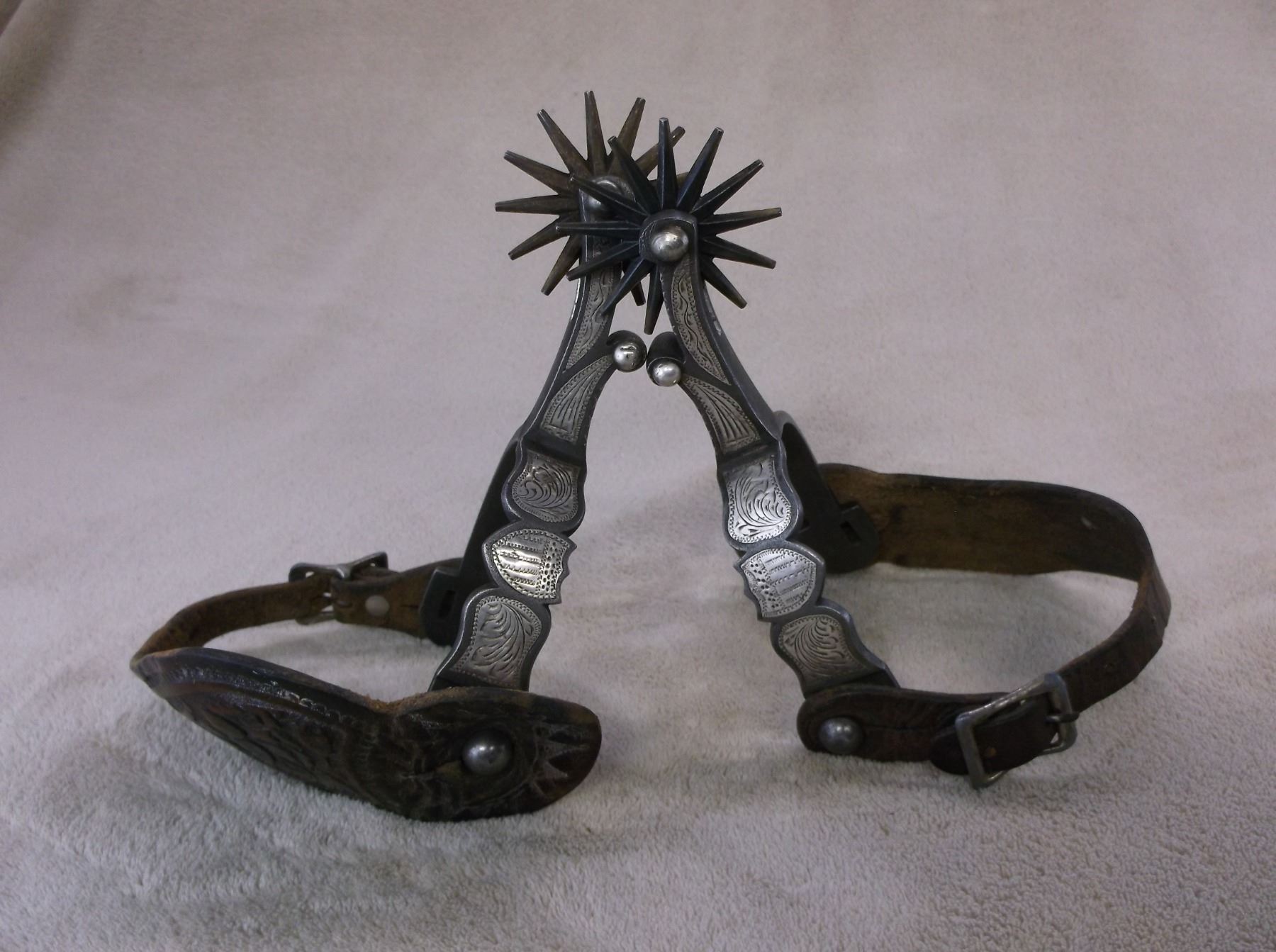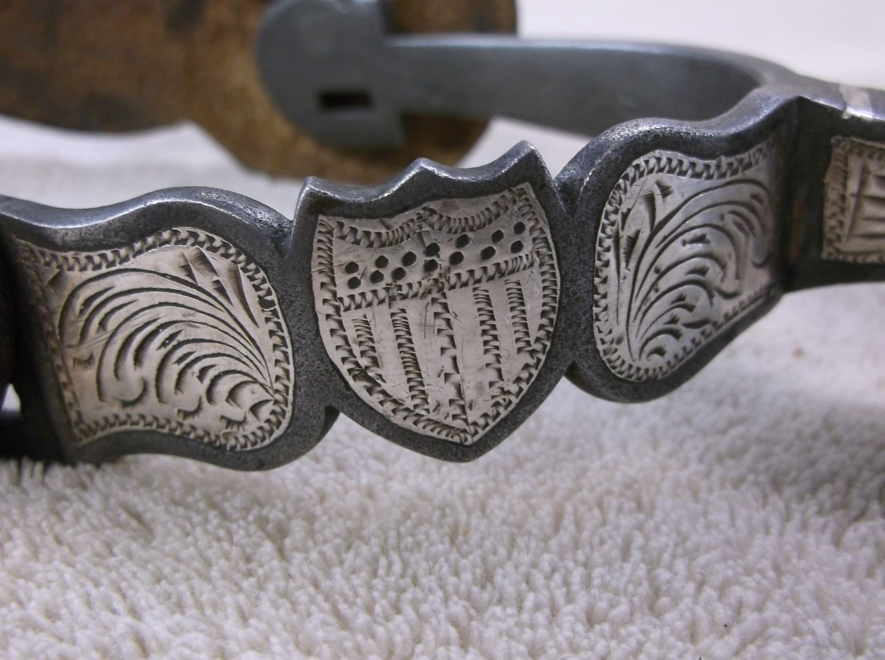 Marked Squashed M's Hand Crafted Silver Inlaid Spurs- Shield Pattern- Barrel Chap Guards- 13 Point Rowels- .75" Bands 2.75" Shanks- Stamped Straps