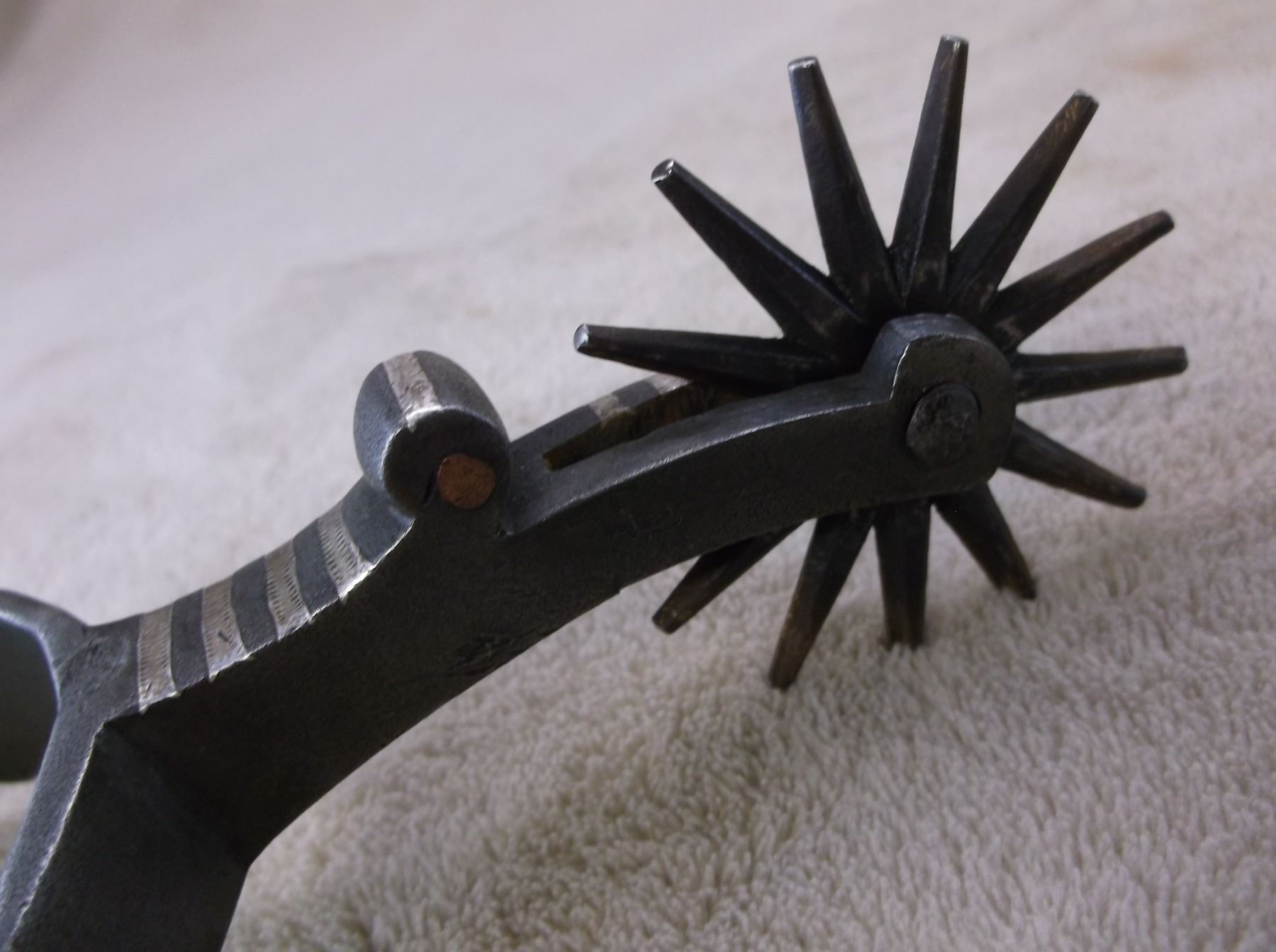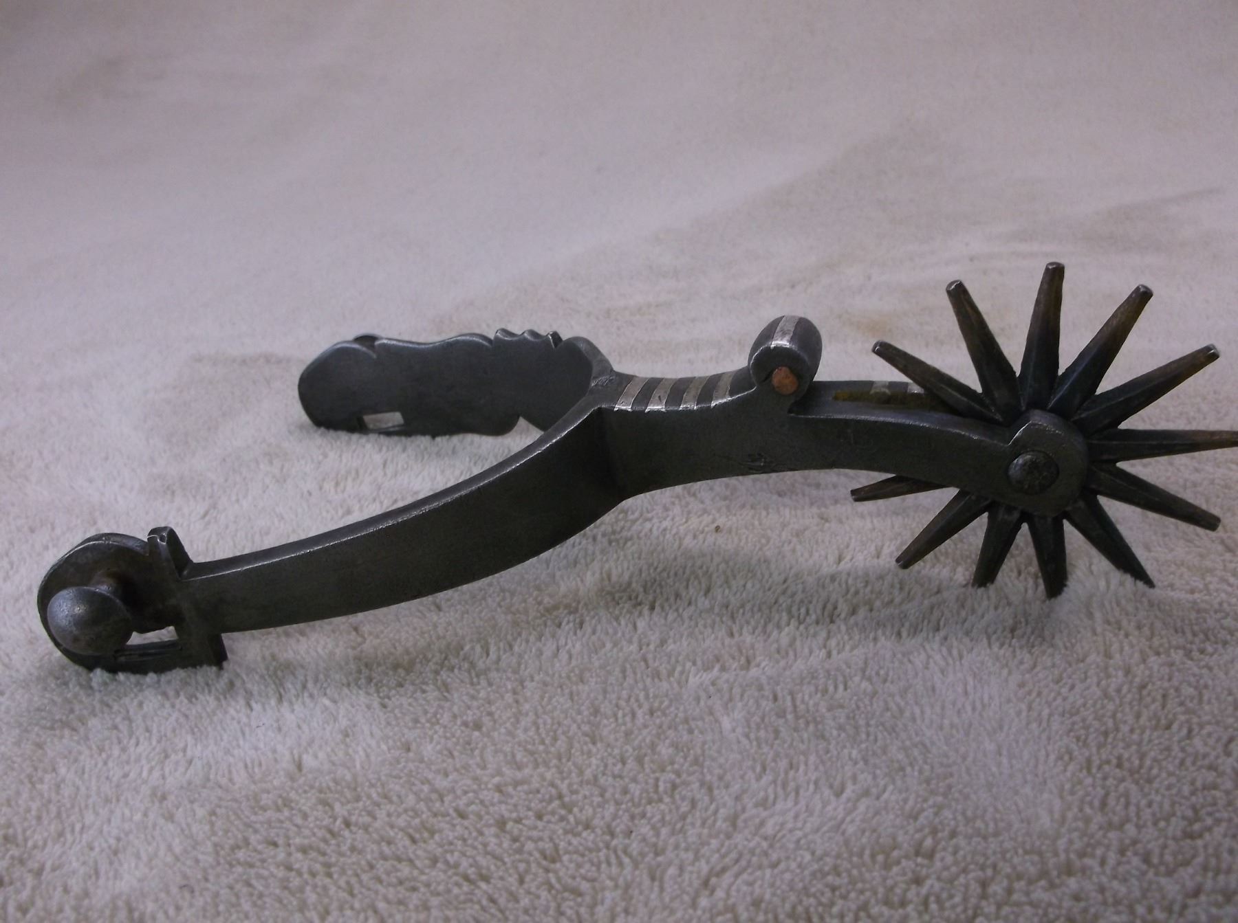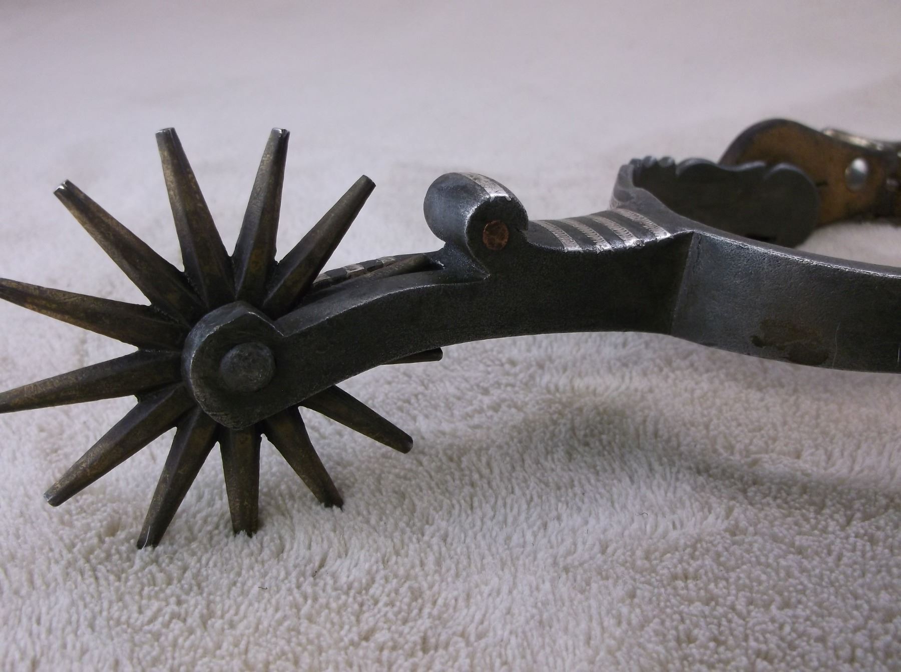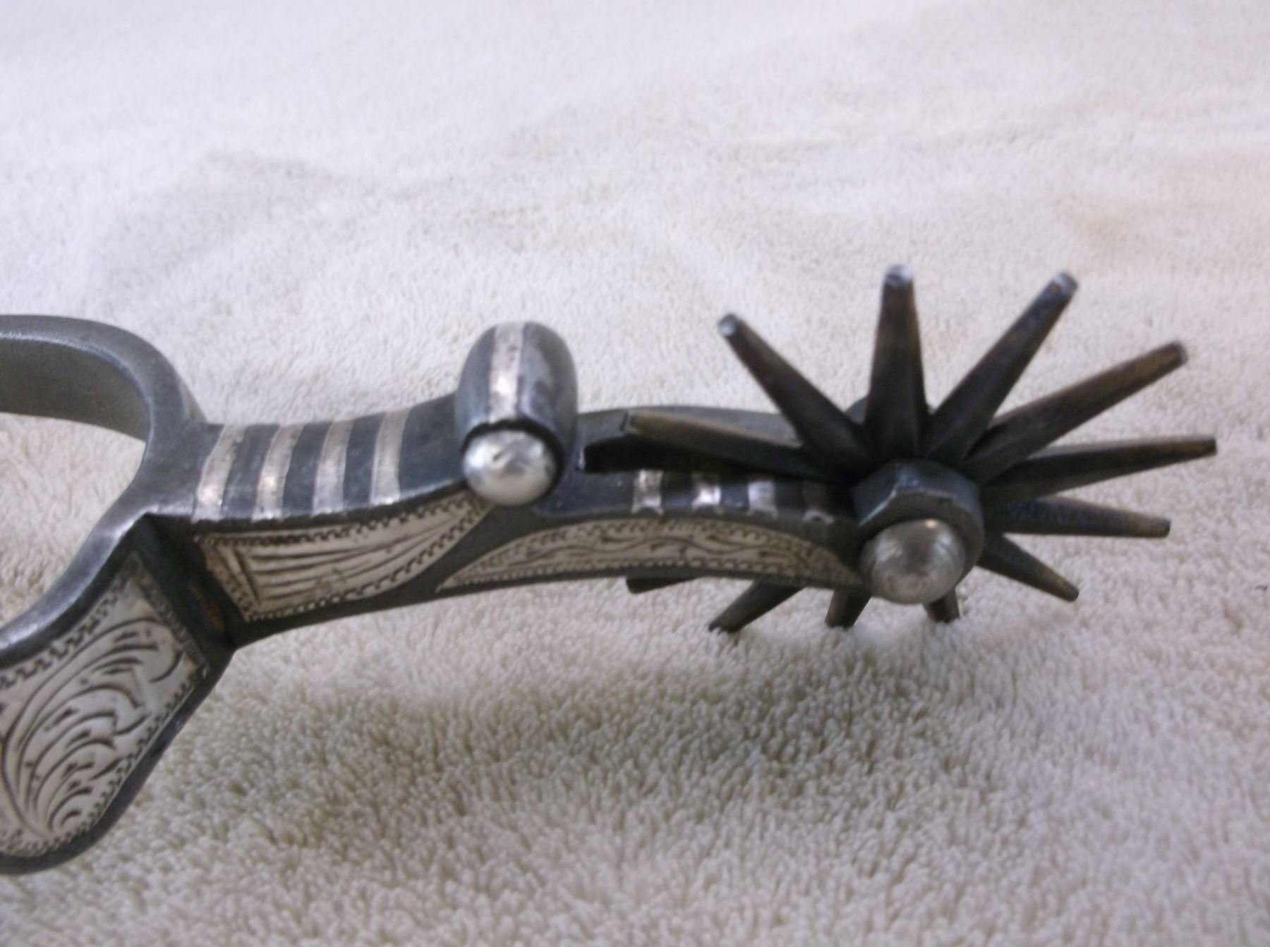 Marked Squashed M's Hand Crafted Silver Inlaid Spurs- Shield Pattern- Barrel Chap Guards- 13 Point Rowels- .75" Bands 2.75" Shanks- Stamped Straps