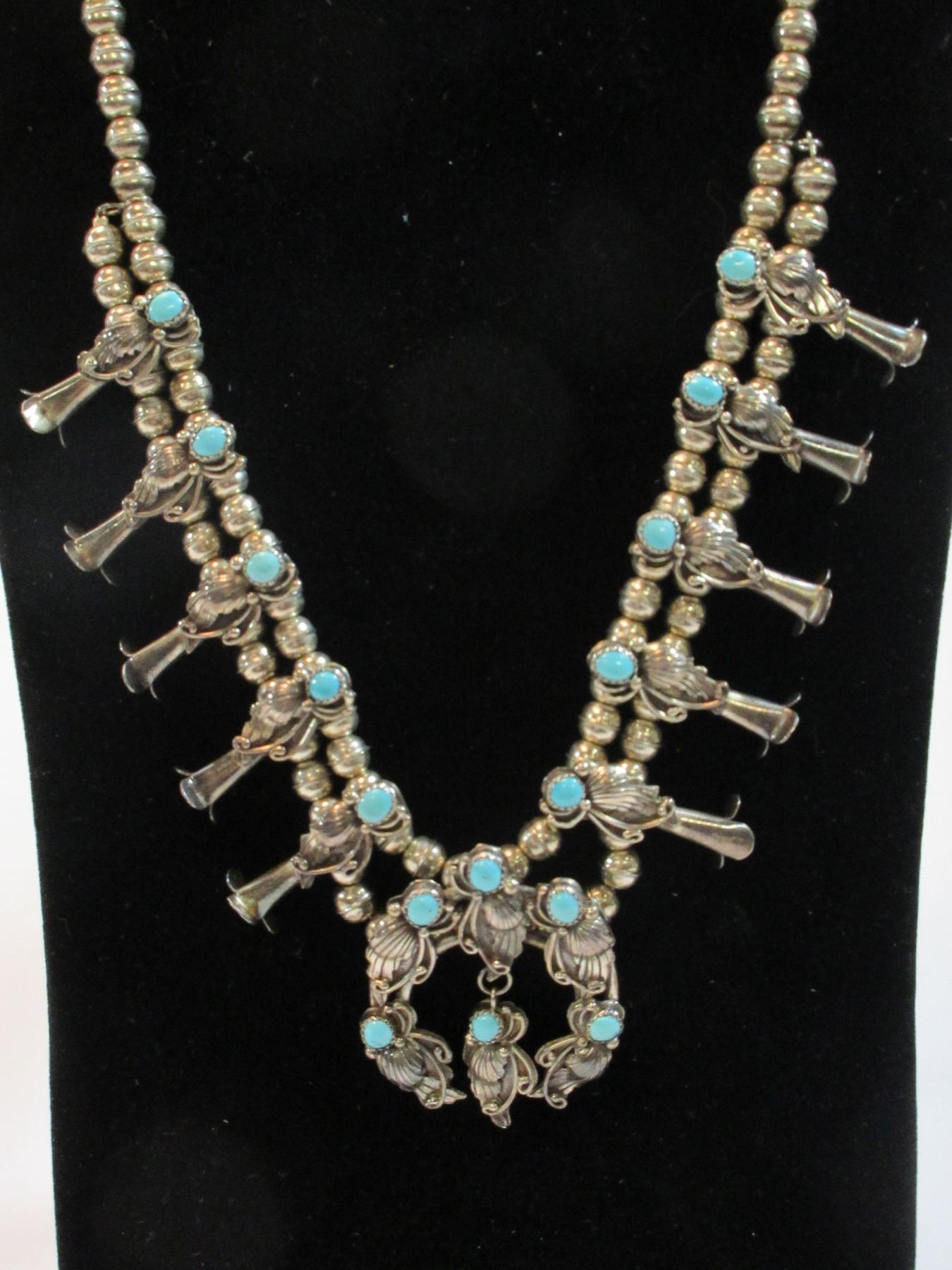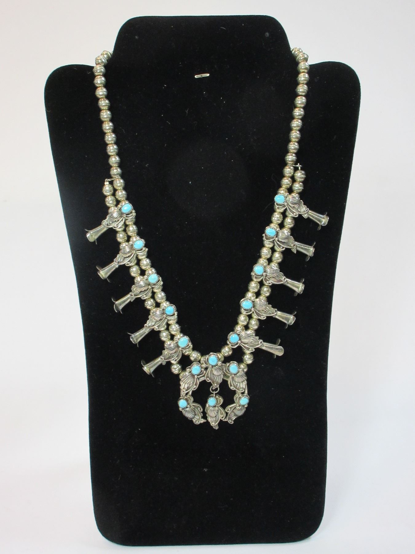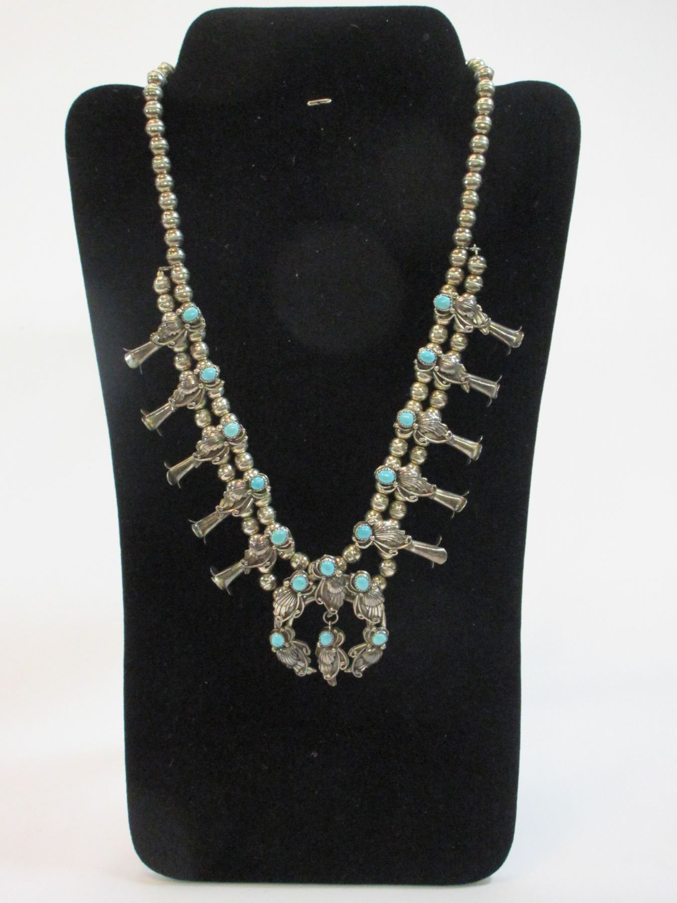 Marked Sterling 89 Squash Blossom Necklace- Turquoise and Sterling- 12"