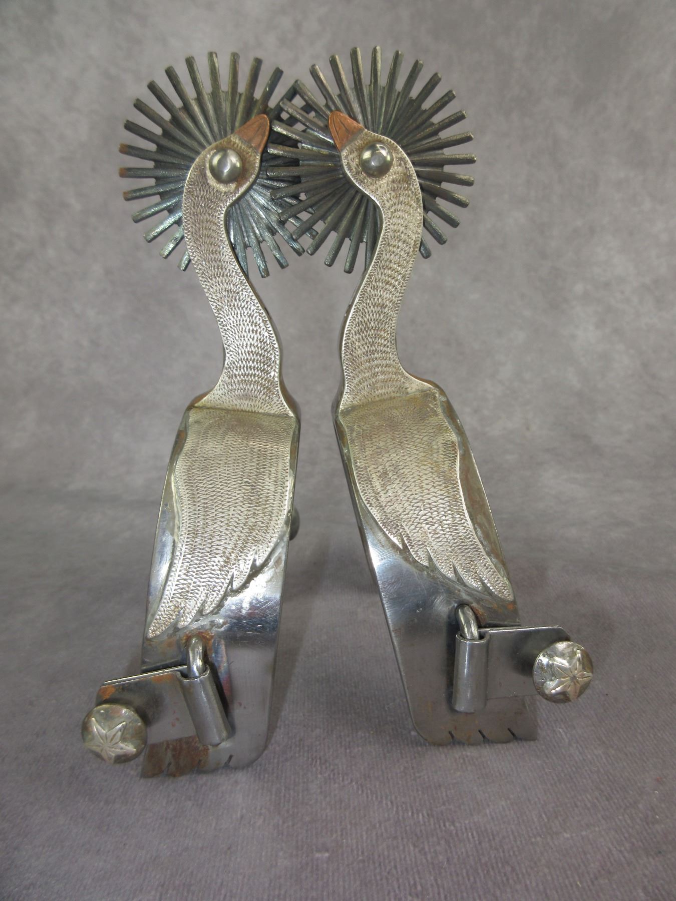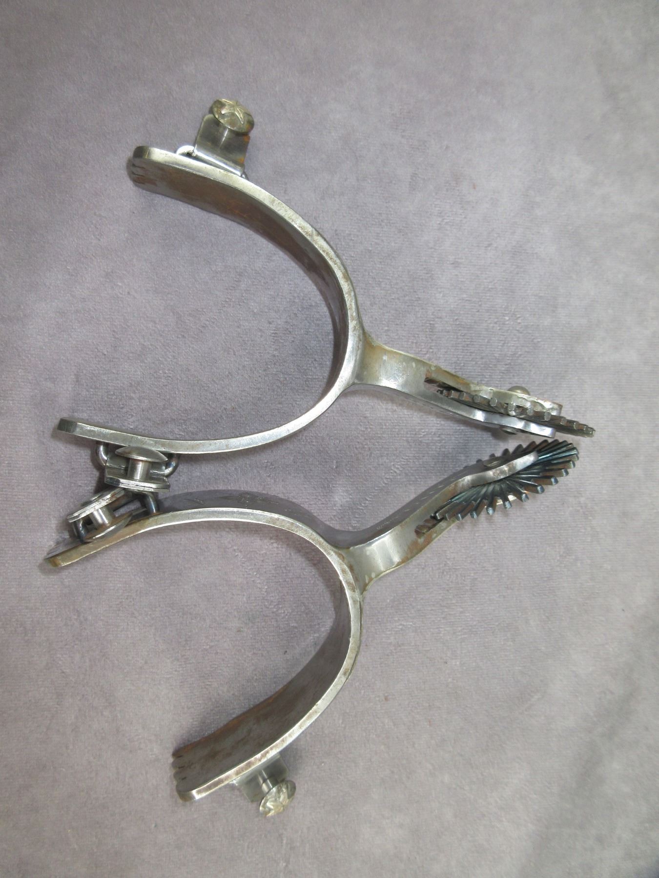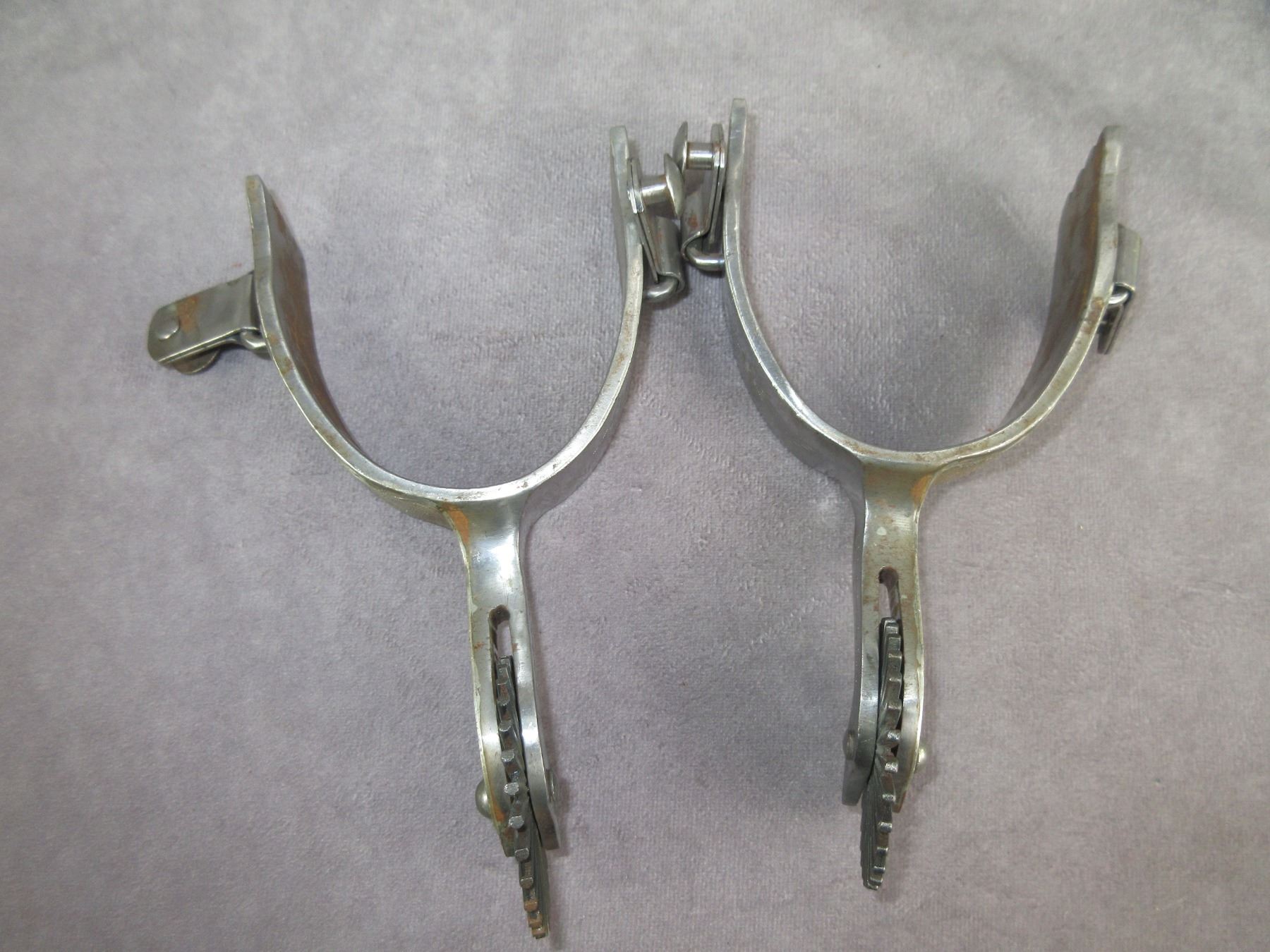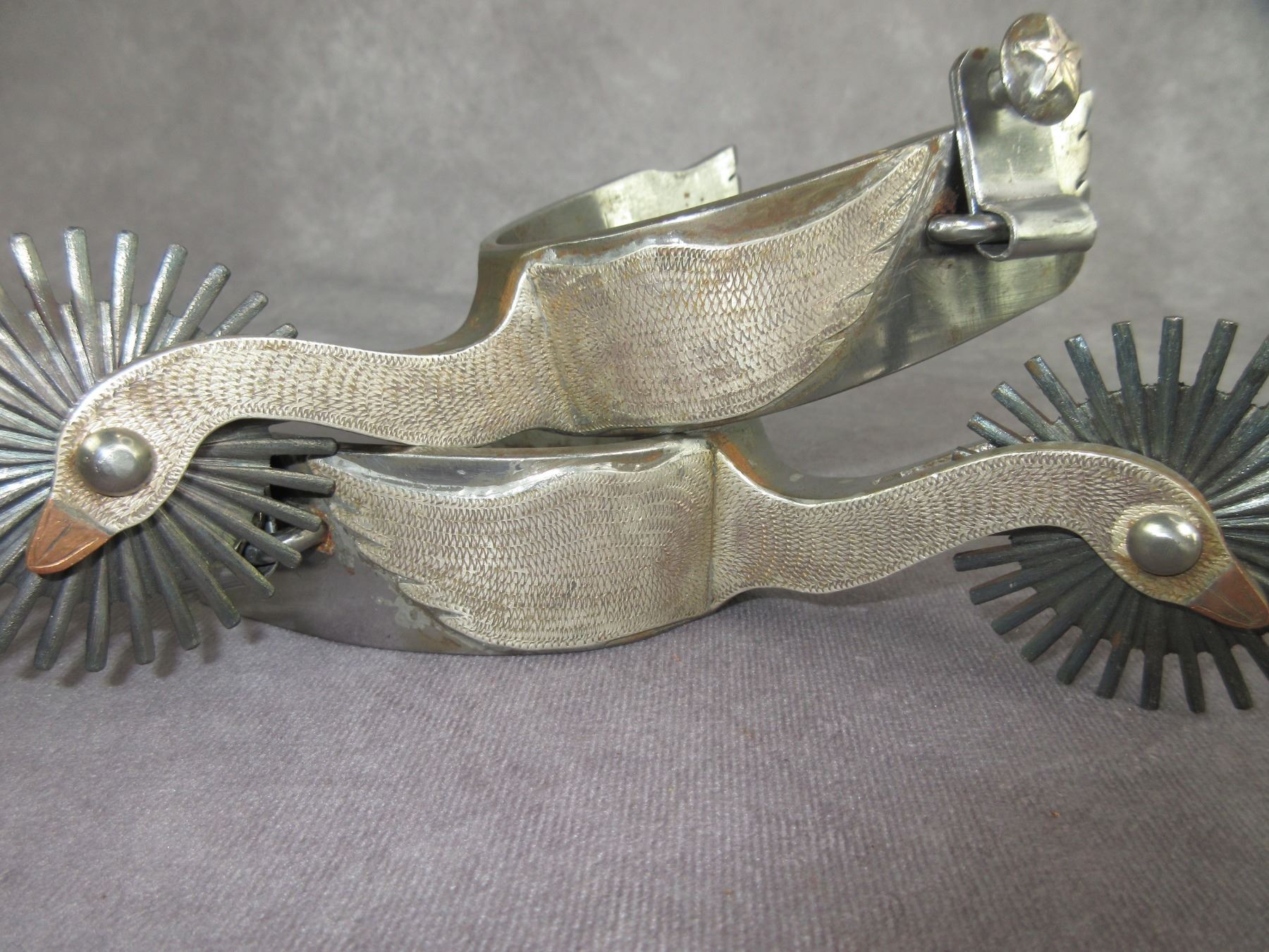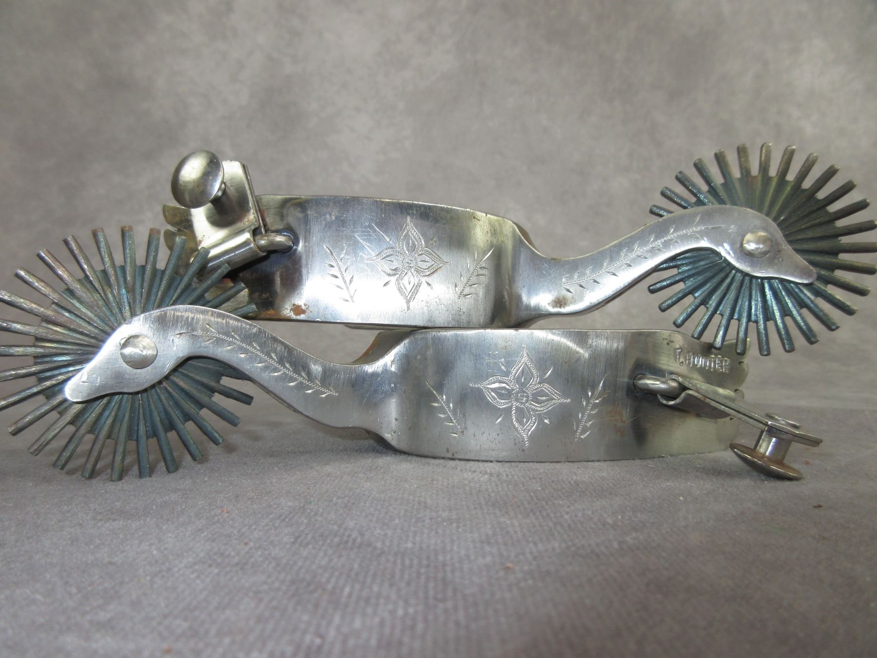 Marked T Hunter Silver Overlaid Gooseneck Spurs- Engraved Inside- 1.3" Bands- 3" Shanks- 2.5" 30 Point Rowels- Pretty Good Condition- Heavy Duty