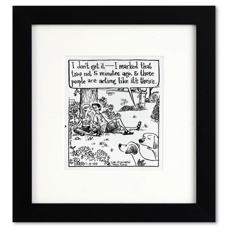 Enter a surreal and satirical world of twisted imagination and award winning creativity. "Marked Tree" is an original pen & ink drawing on paper by Dan Piraro, creator of the critically acclaimed and award winning comic strip, Bizarro. This piece is hand signed, comes custom framed and includes a letter of authenticity. Measures approximately 12" x 11" (frame), 6" x 5.5" (image). This item requires special handling and may have a longer than usual turnaround.