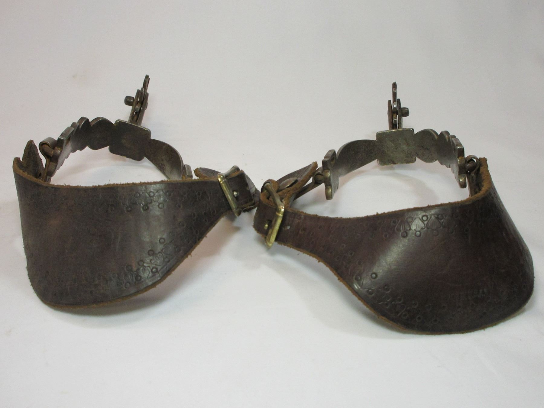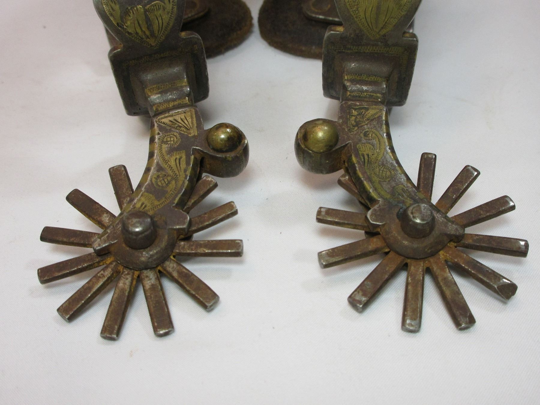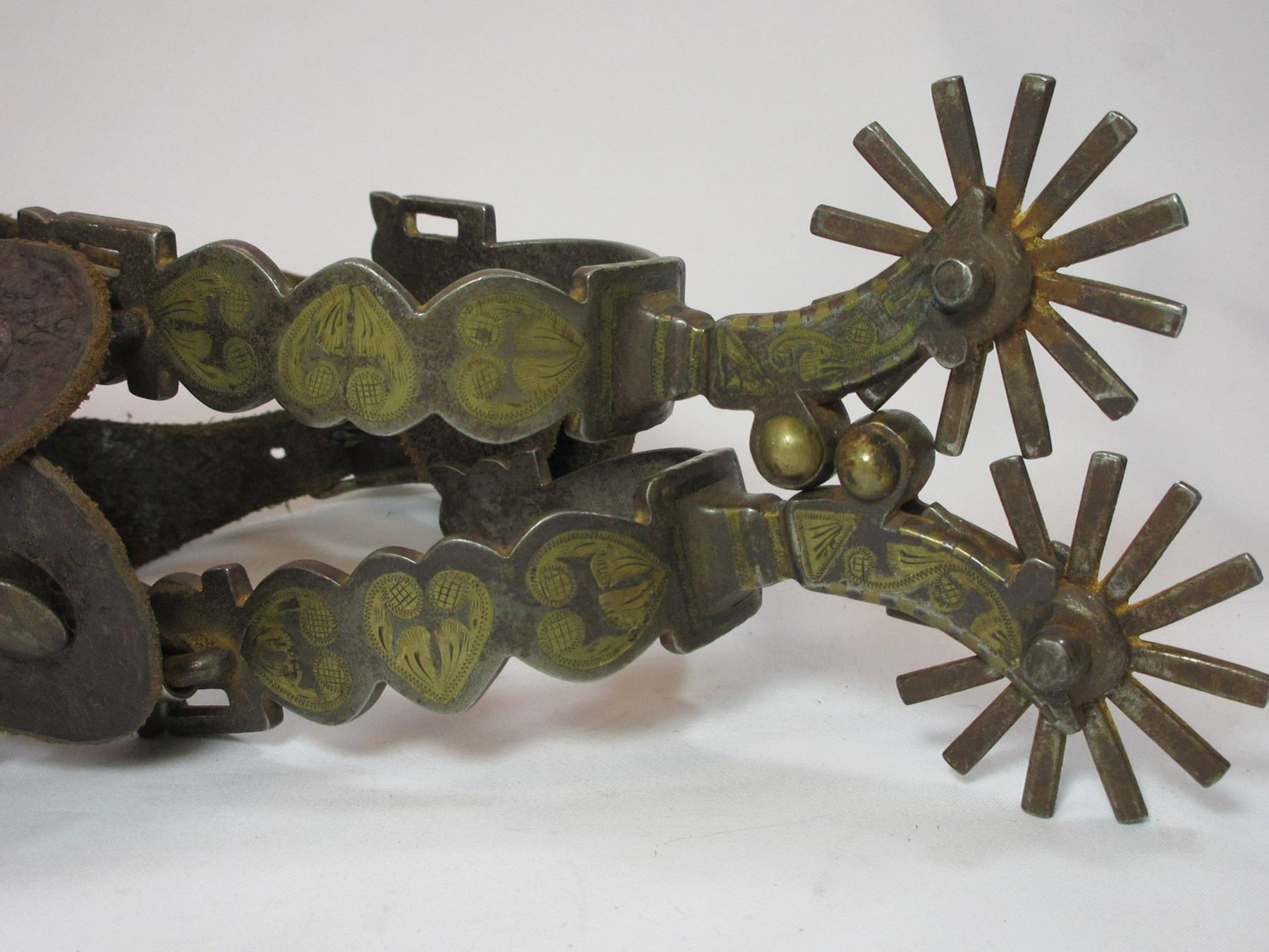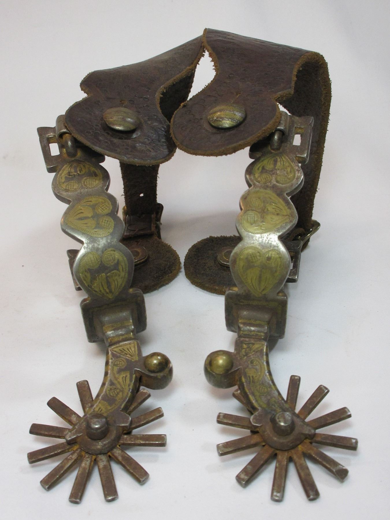 Marked Visalia Saddle Co SF Cal Brass Inlaid Spurs- Heart Pattern- 1" Bands- 2.5" Shanks- 12 Point Rowels- Barrel Chap Guards- Marked Stamped Straps
