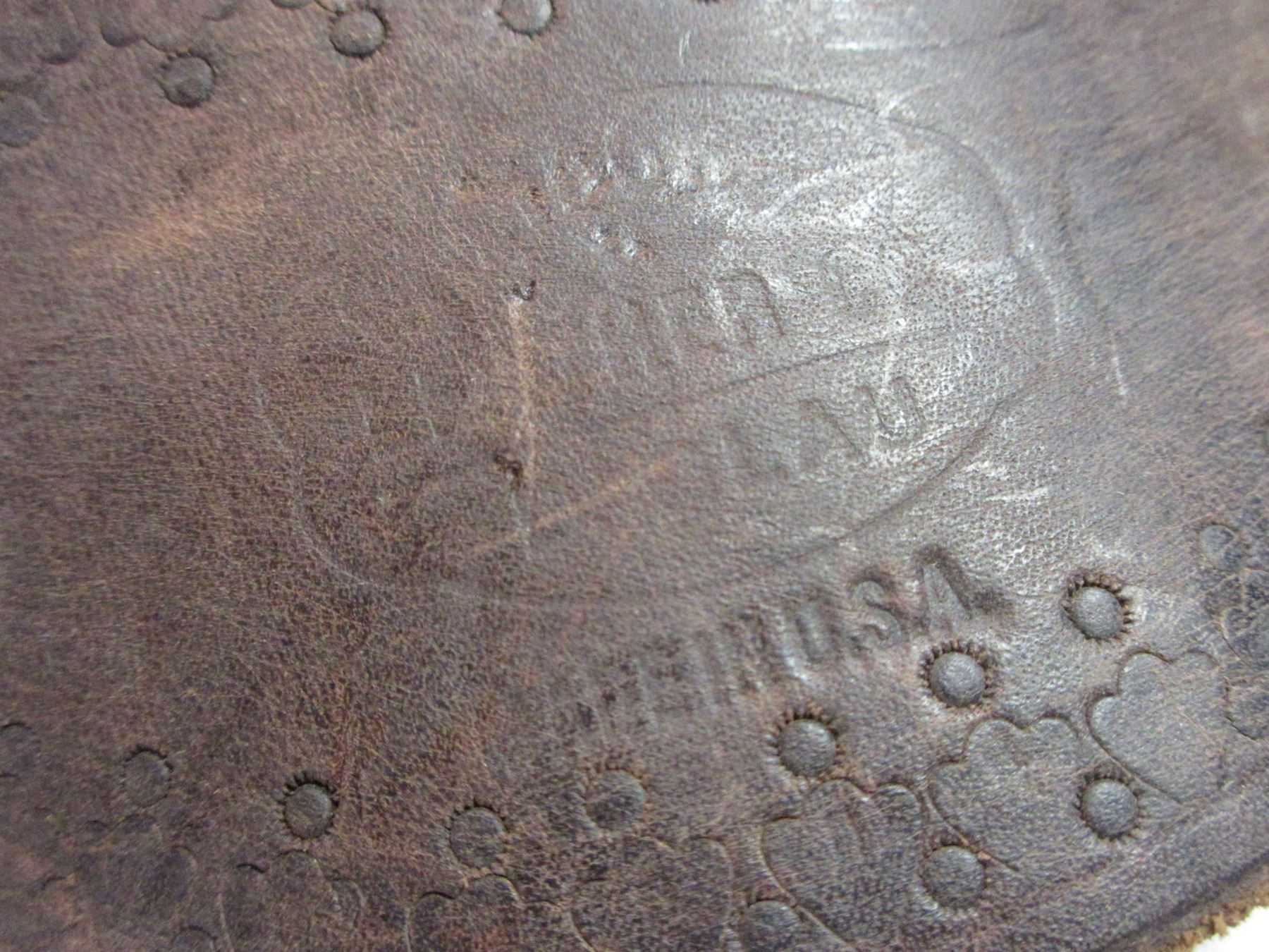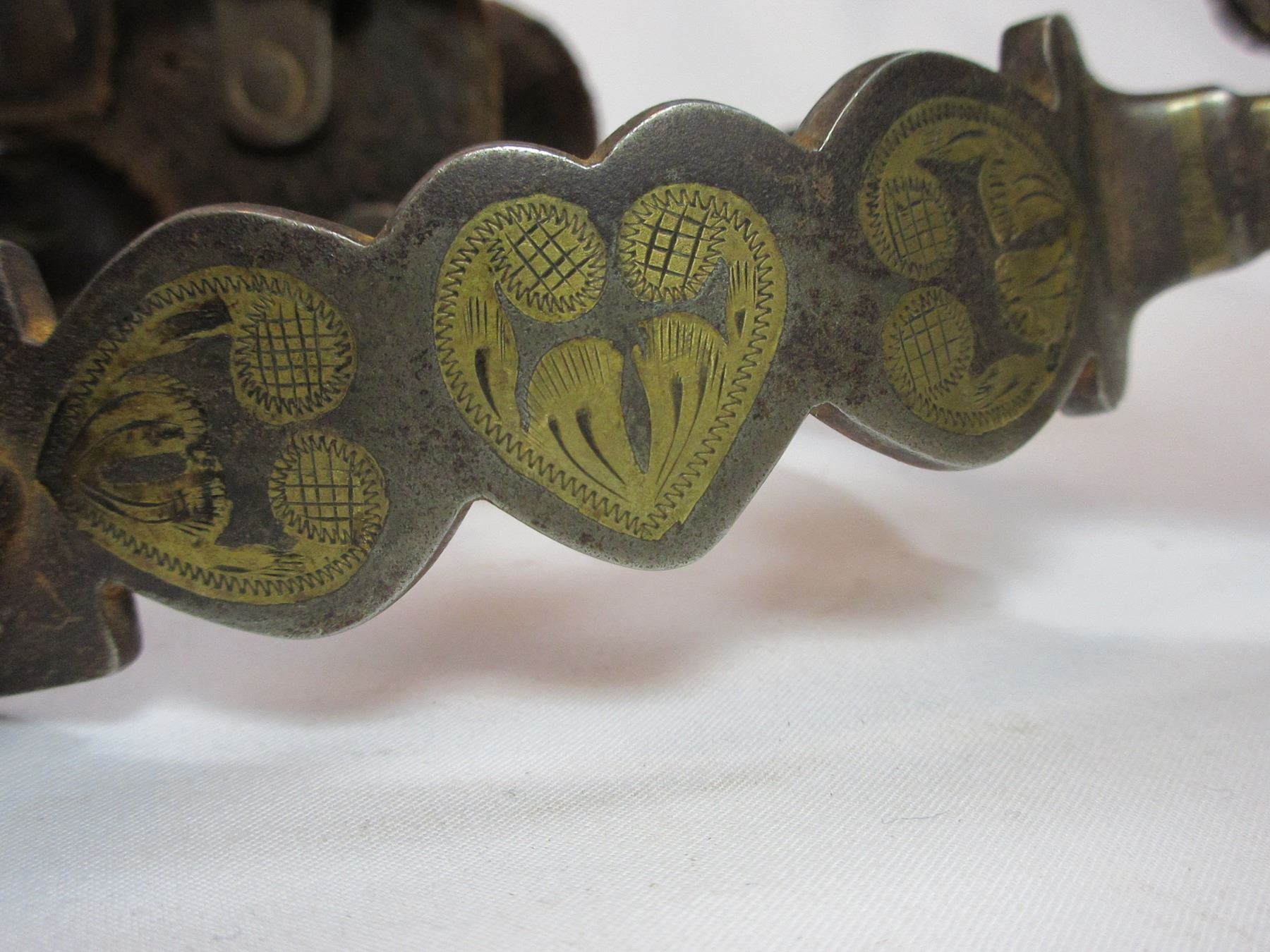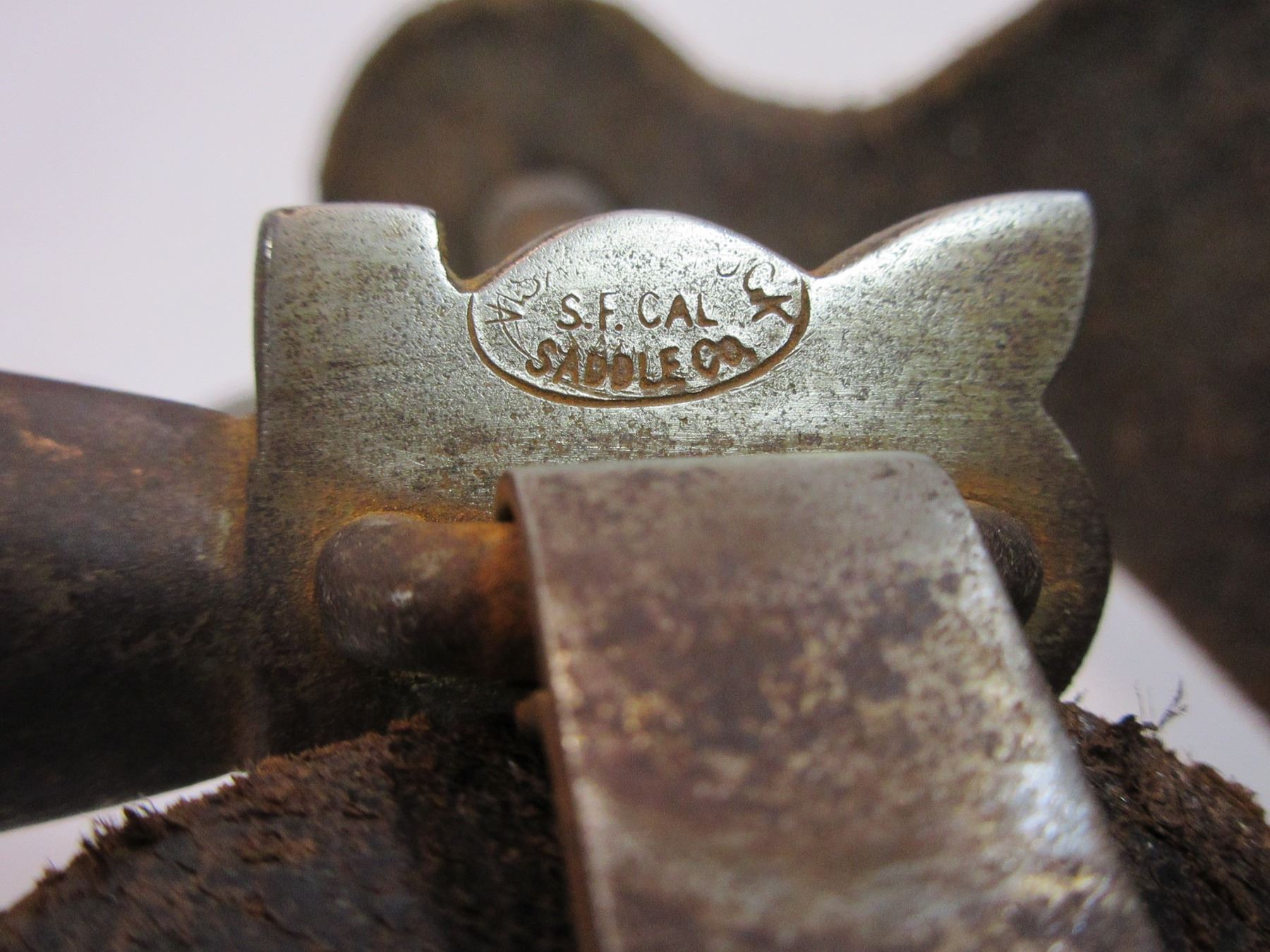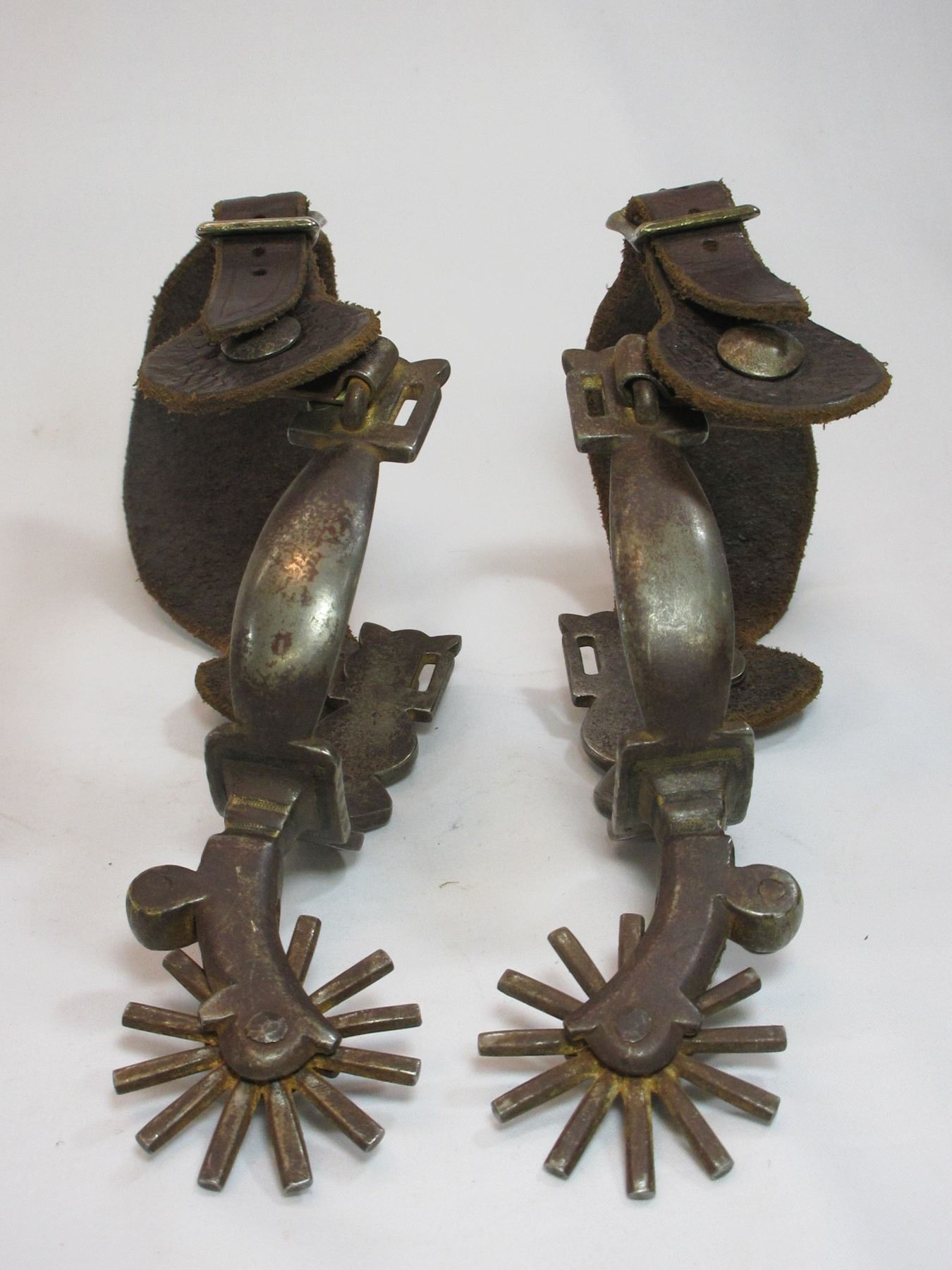 Marked Visalia Saddle Co SF Cal Brass Inlaid Spurs- Heart Pattern- 1" Bands- 2.5" Shanks- 12 Point Rowels- Barrel Chap Guards- Marked Stamped Straps