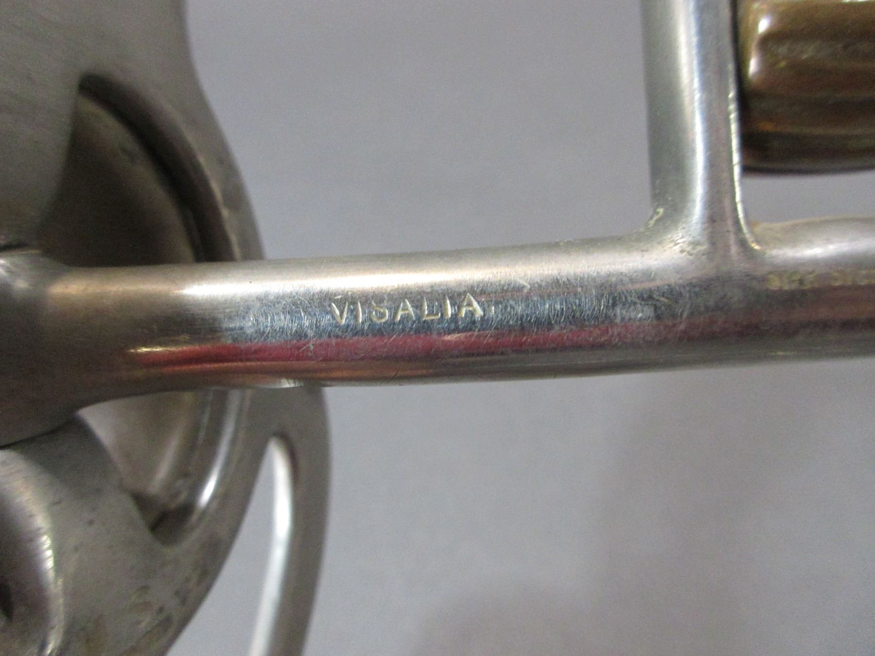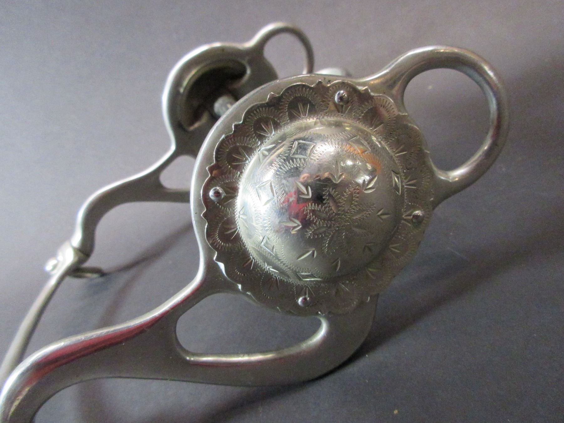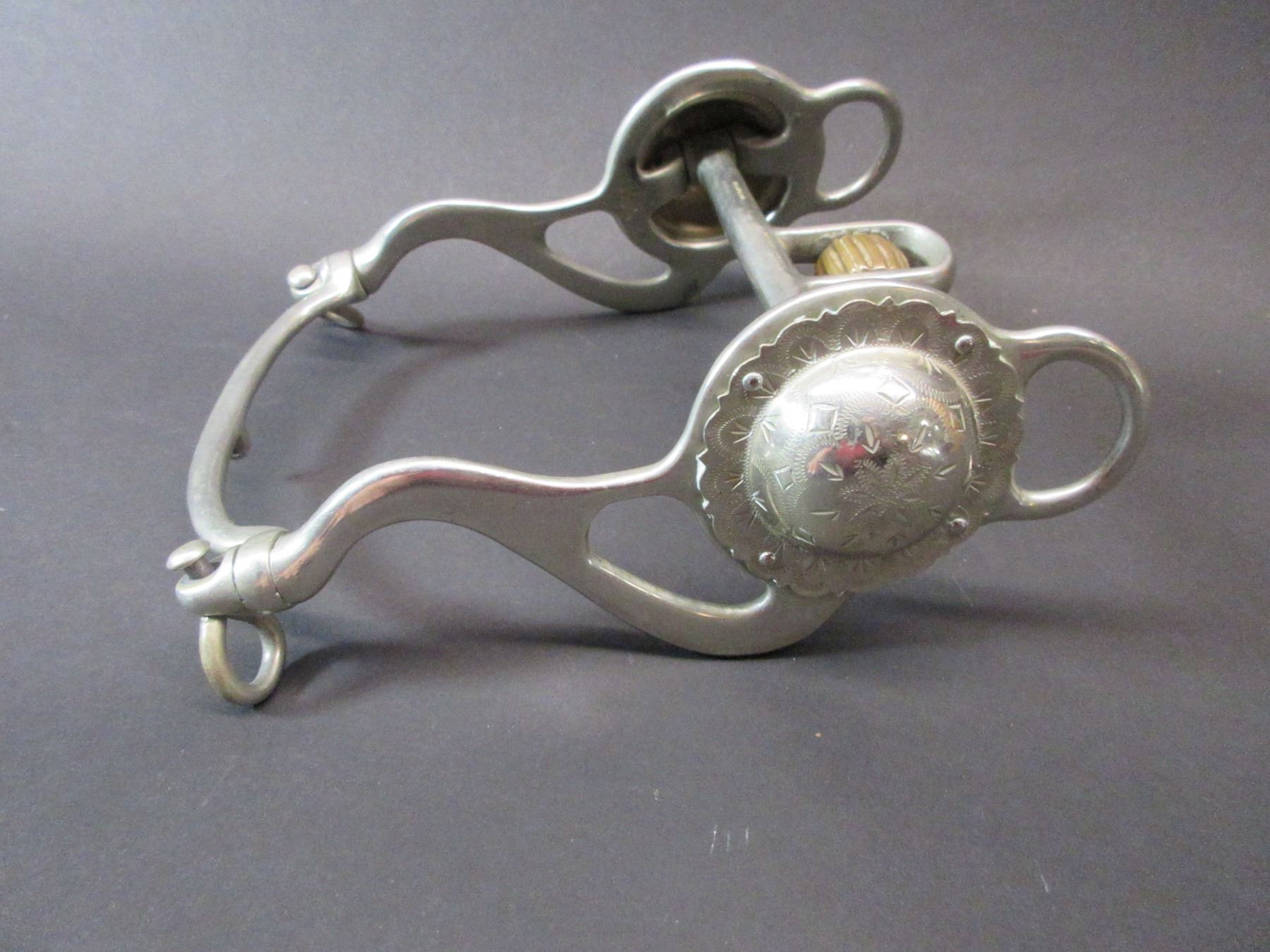 Marked Visalia Stock Saddle Co Bit- Star Steel Silver Humane- Ortega Cheek Halfbreed Mouth- Slobber Bar- 2.4" Domed Engraved Scalloped Conchos- Rein Chain Swivels- Very Good Condition