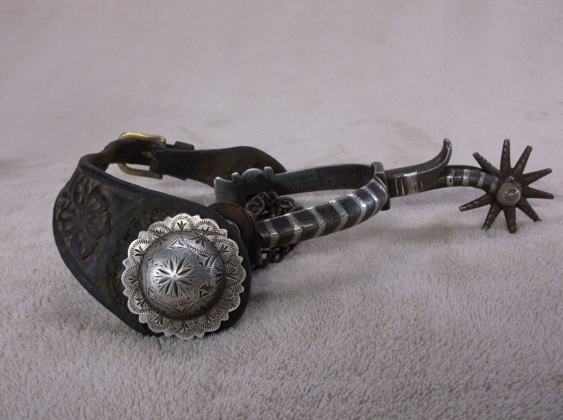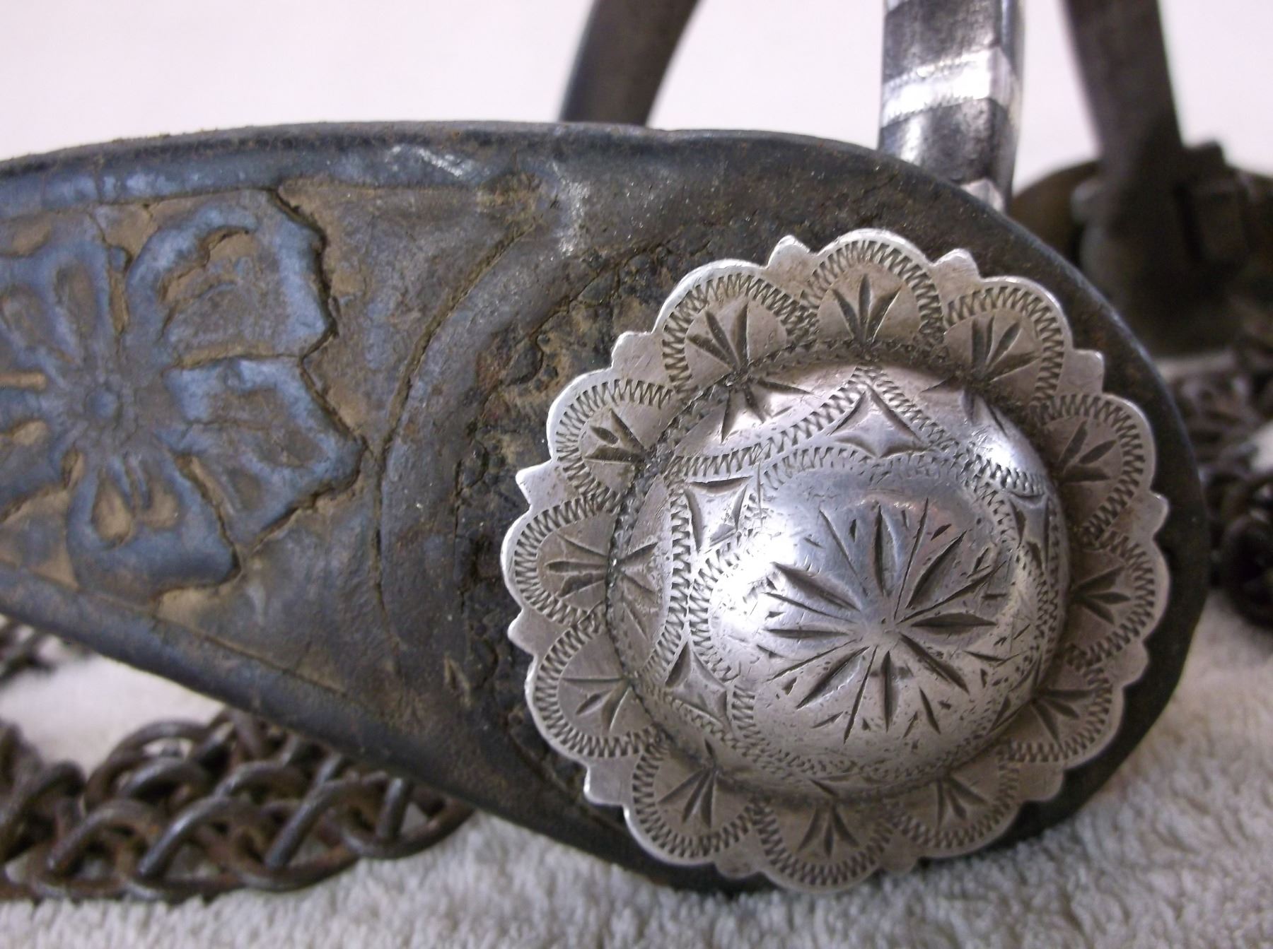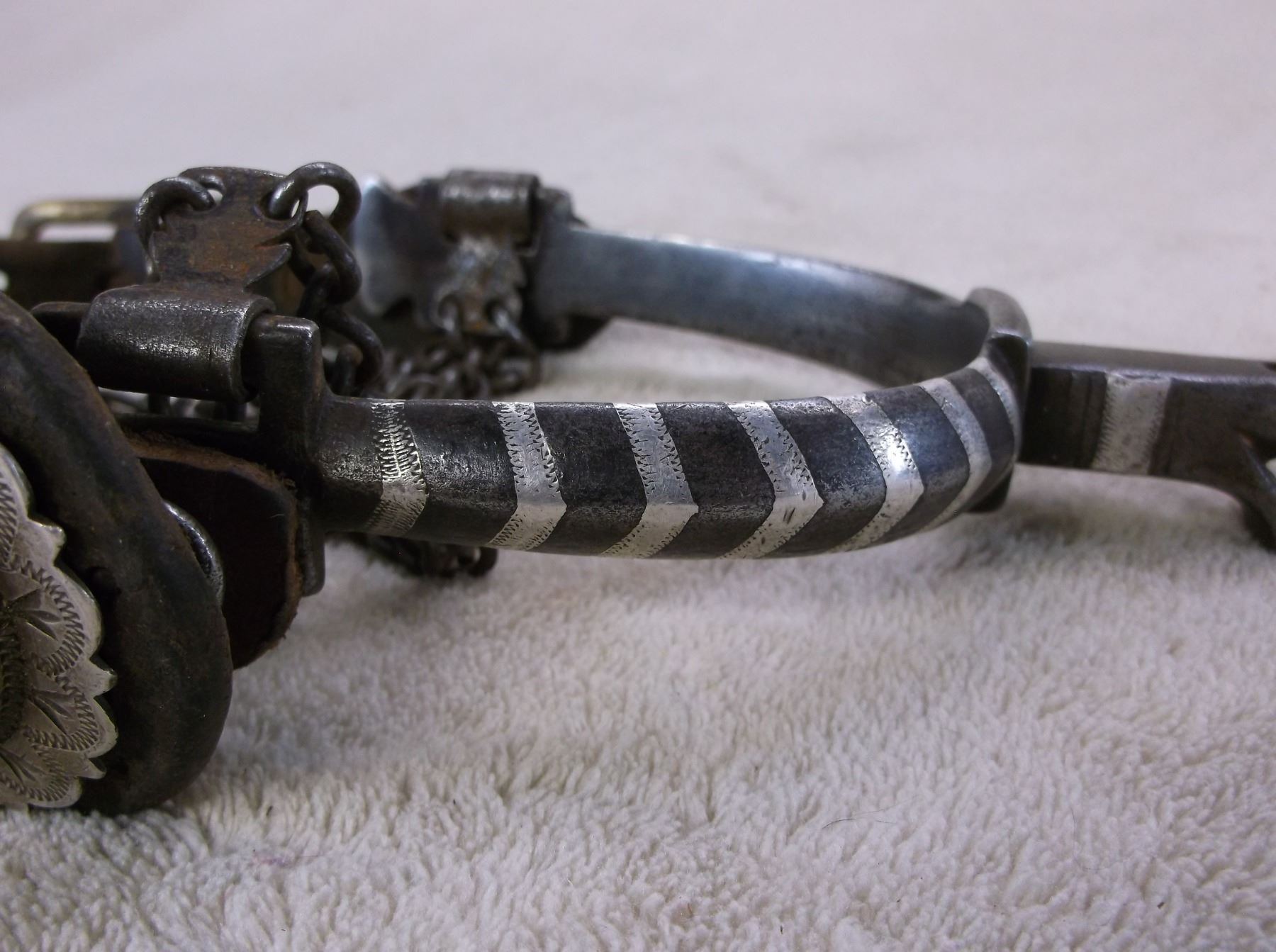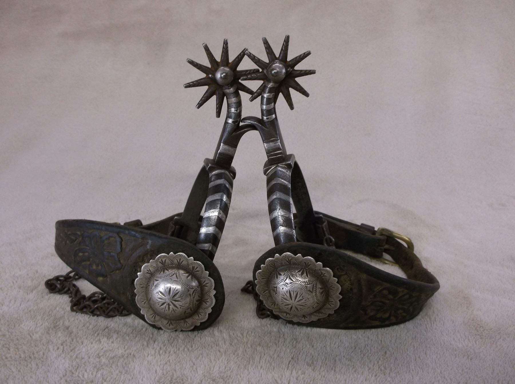 Marked Visalia Stock Saddle Co San Fran- Silver Inlaid and Etched Spurs- Chevron Pattern- Chap Guards- 10 Point Rowels- .5" Bands 2.25" Shanks- Unmarked Silver Visalia Conchos On Stamped Straps