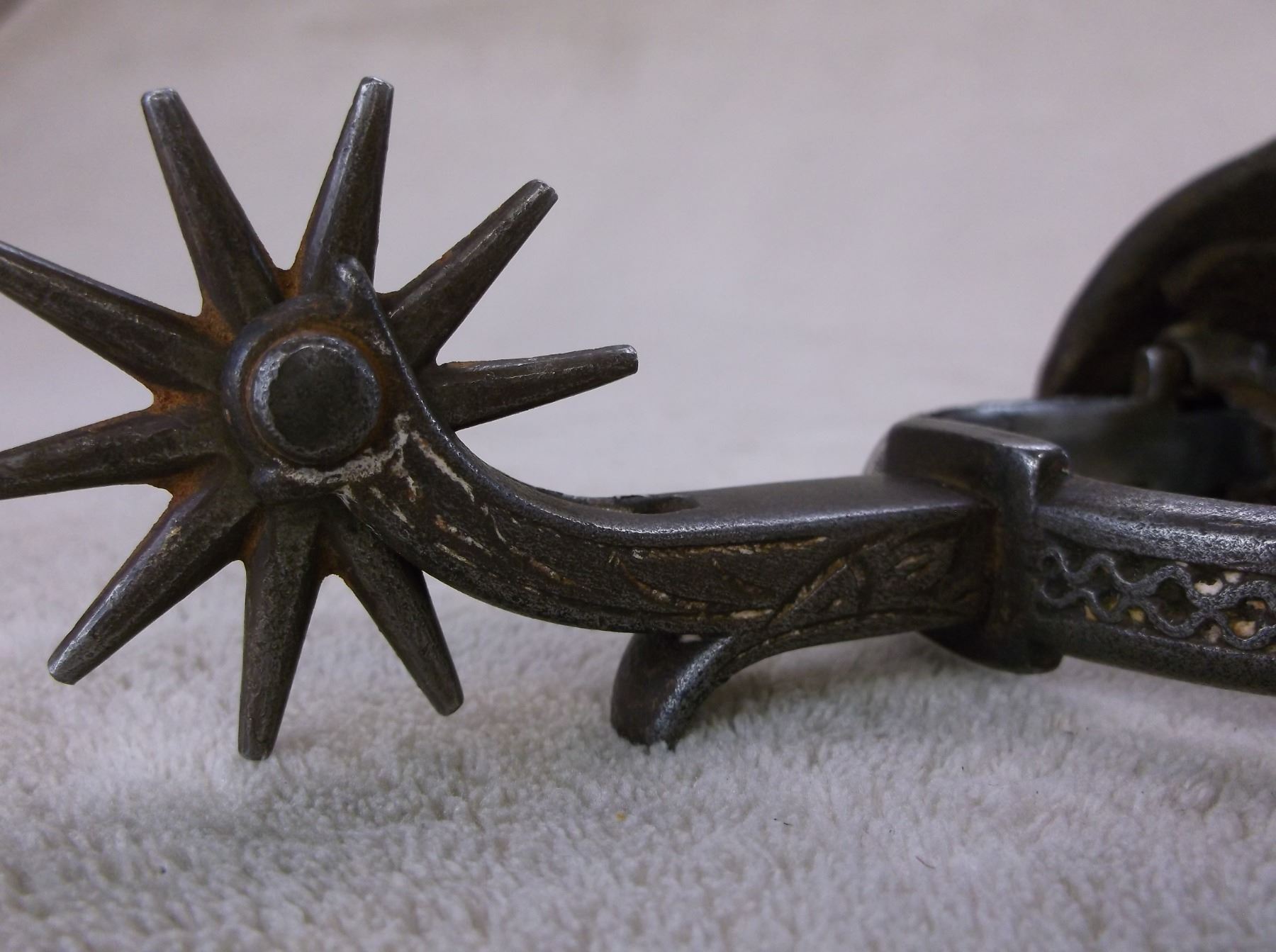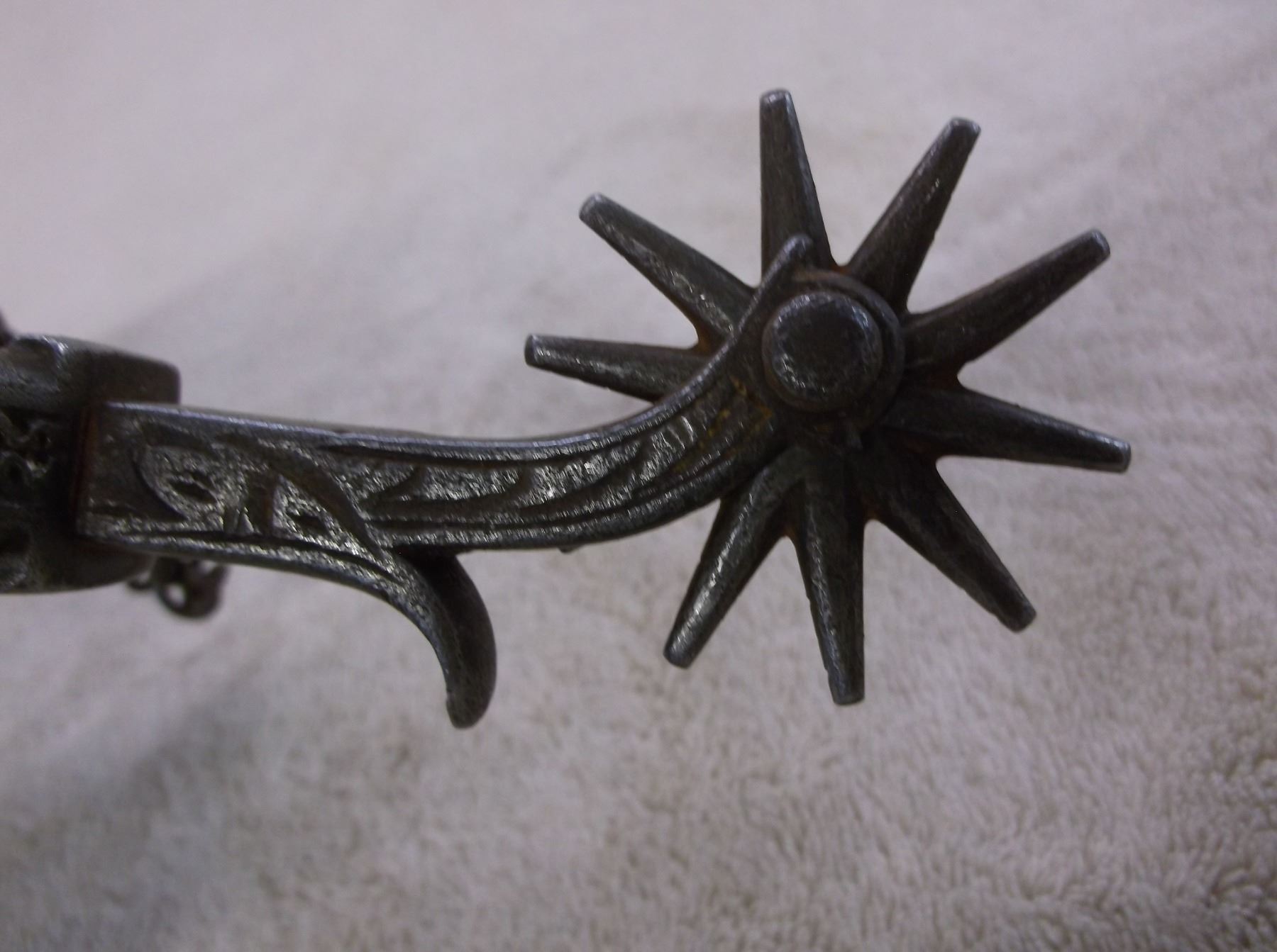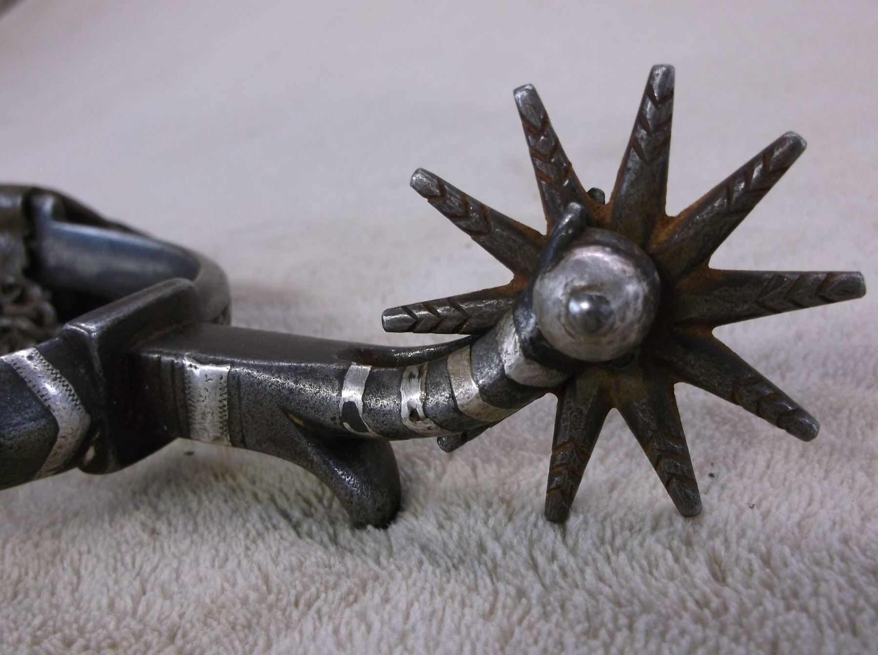 Marked Visalia Stock Saddle Co San Fran- Silver Inlaid and Etched Spurs- Chevron Pattern- Chap Guards- 10 Point Rowels- .5" Bands 2.25" Shanks- Unmarked Silver Visalia Conchos On Stamped Straps