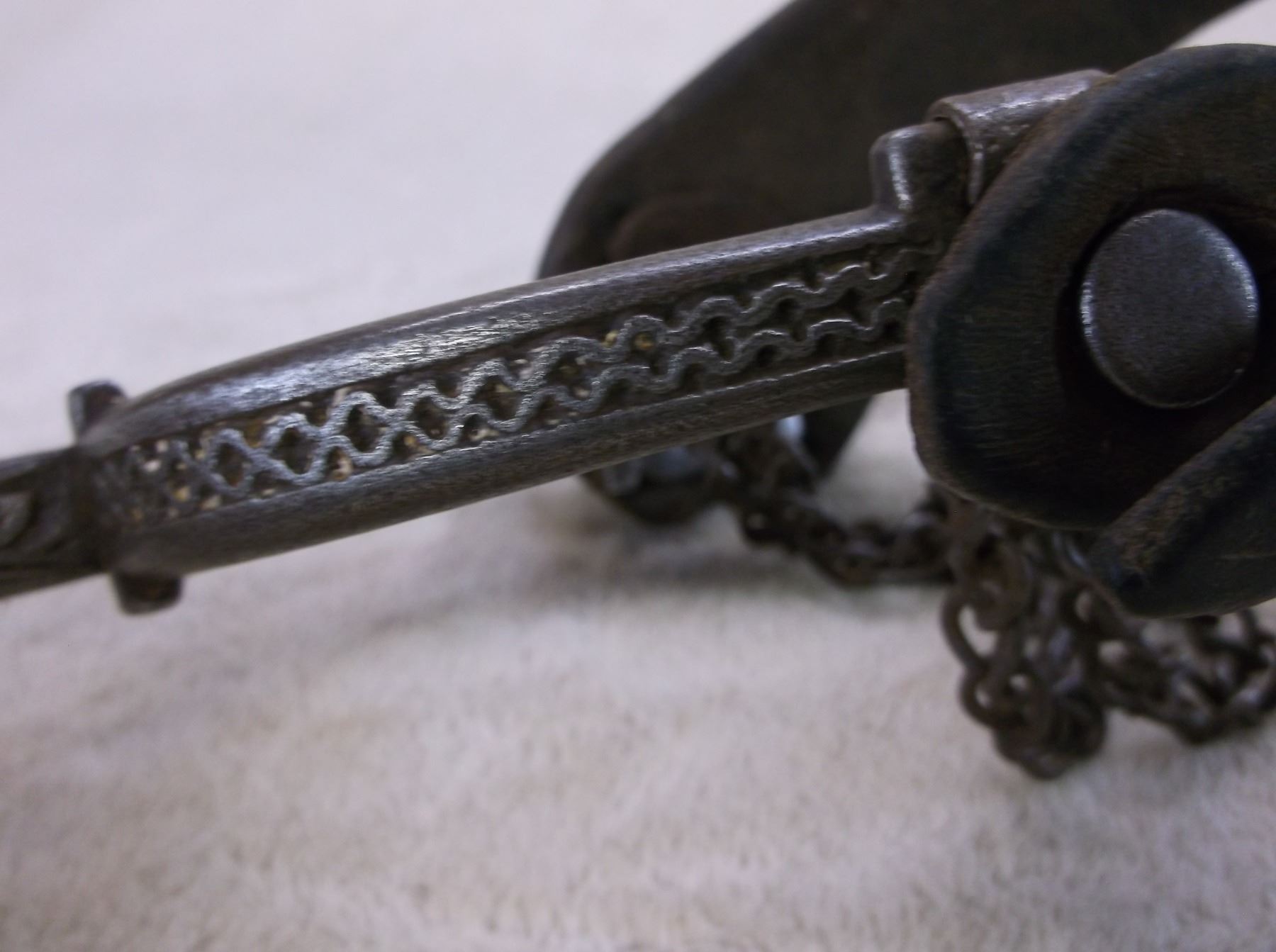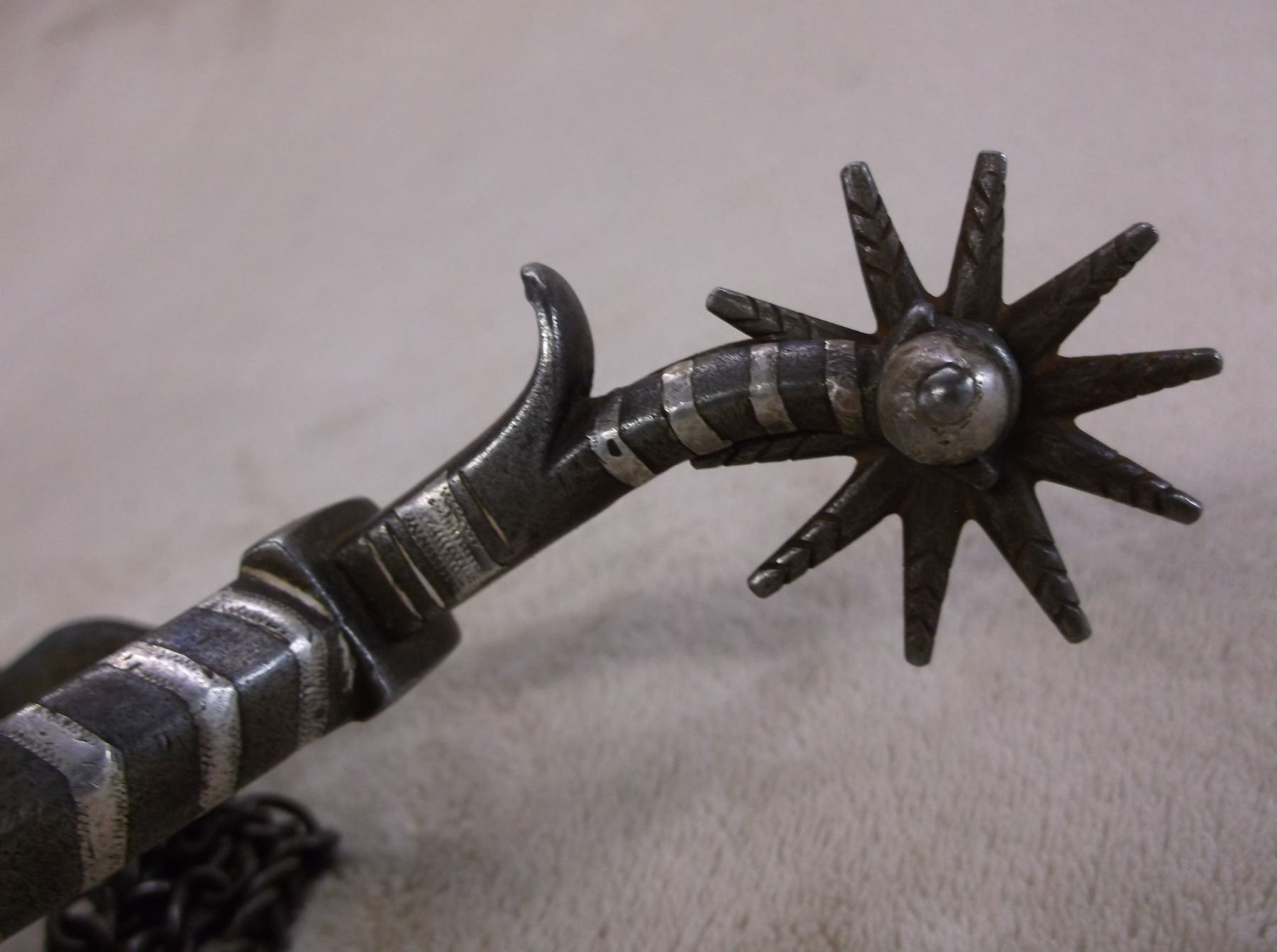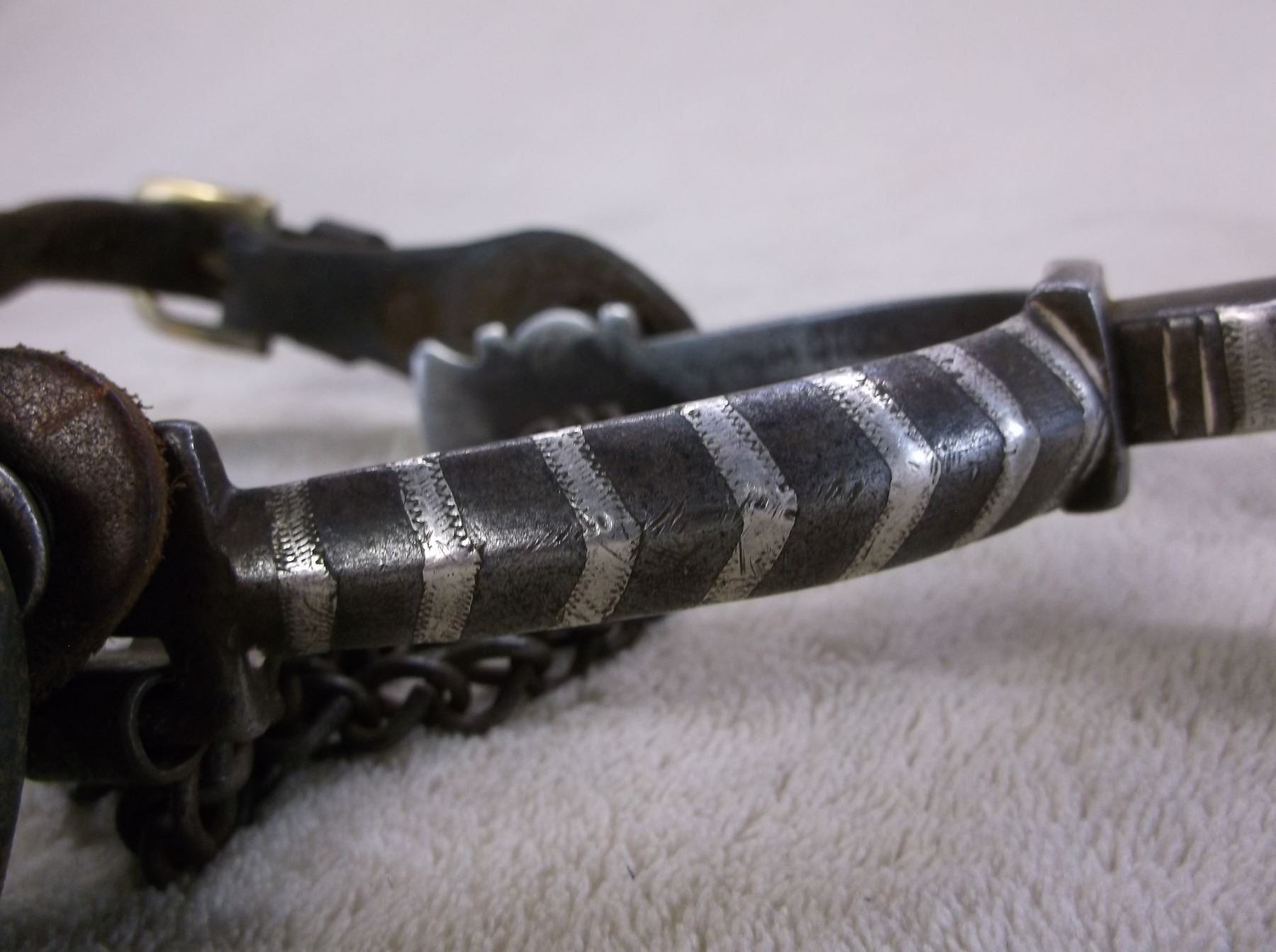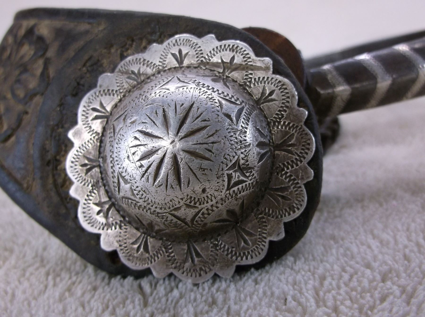 Marked Visalia Stock Saddle Co San Fran- Silver Inlaid and Etched Spurs- Chevron Pattern- Chap Guards- 10 Point Rowels- .5" Bands 2.25" Shanks- Unmarked Silver Visalia Conchos On Stamped Straps