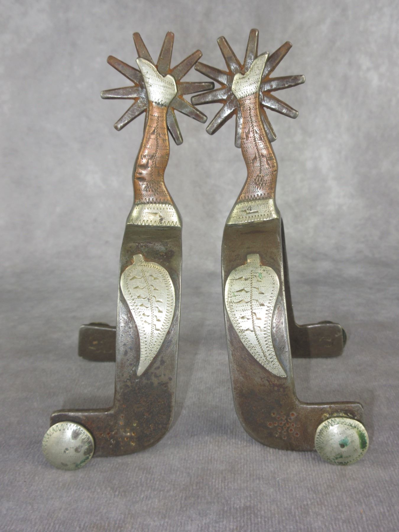 Marked With Dots Double Mounted Silver And Copper Overlaid Lady Legs Spurs- 1" Bands- 2.5" Shanks- 1.75" 10 Point Rowels- Decent Condition