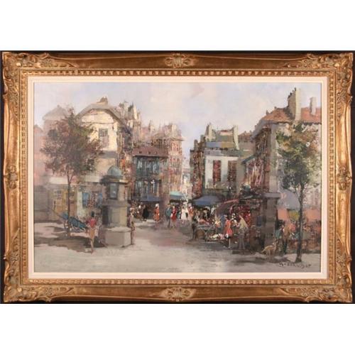 This original, signed oil painting is an impressive 30.5x42.5. The signature on the work is thought to be Tbvoorschor. Reminiscent of post impressionism the subject comes to us in a number of rich tones and expressive strokes. Already a popular subject the street scene is reinvented with a limited earth toned palette that the artist uses as a backdrop to the vibrantly colored people. A skilled use of perspective allows us to wander the streets and creates a calming and nostalgic sense. The piece is paired with an elegant wooden frame, carved with fine details both at the corners and edges.