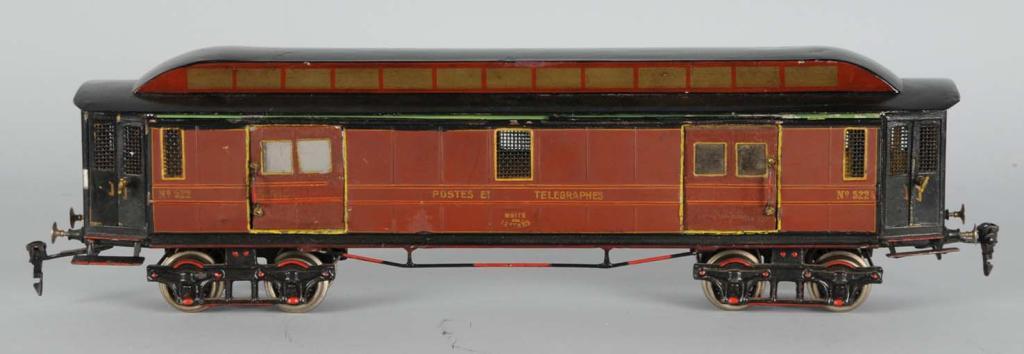 Marked "Postess Et Telegraphies" on both sides of car. Stamped early Marklin shield stamp on the bottom of the car. Crazing to the roof. Car is partially restored. Early Pre-War Train Size 18"L.
