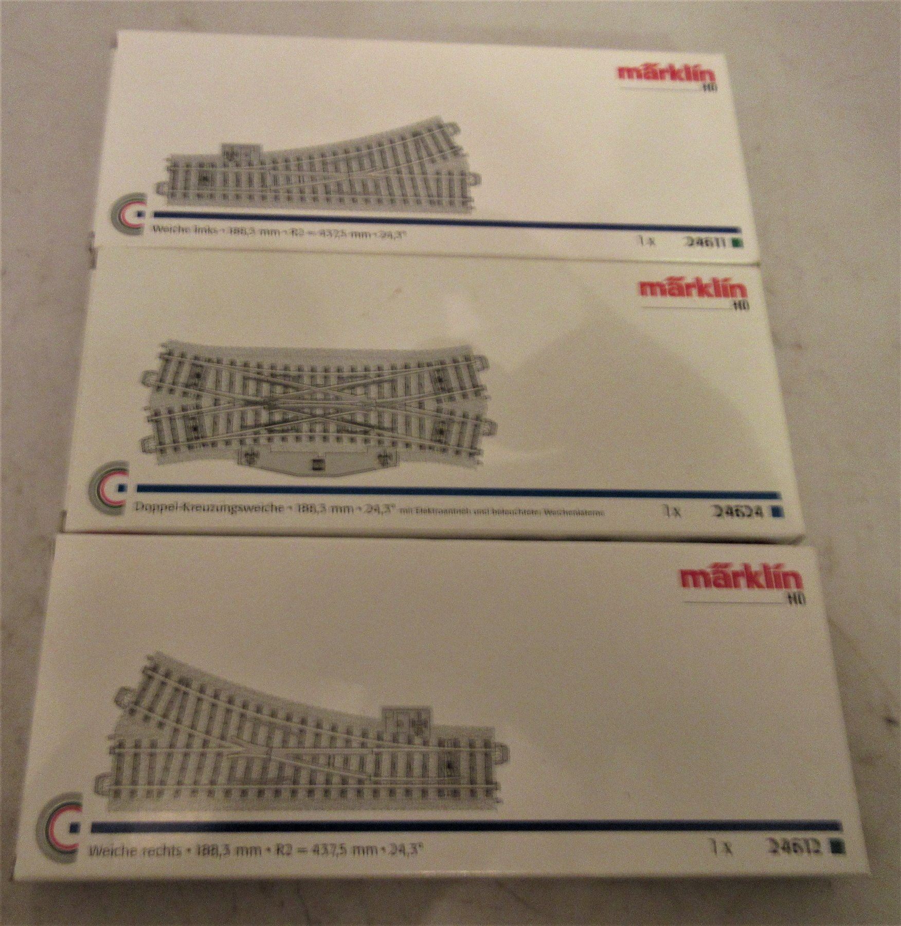 An assortment of Marklin HO scale switches in the original boxes. There is a 24624 double slip switch, a 24612 right hand switch, and a 24611 left hand switch. Excellent condition.