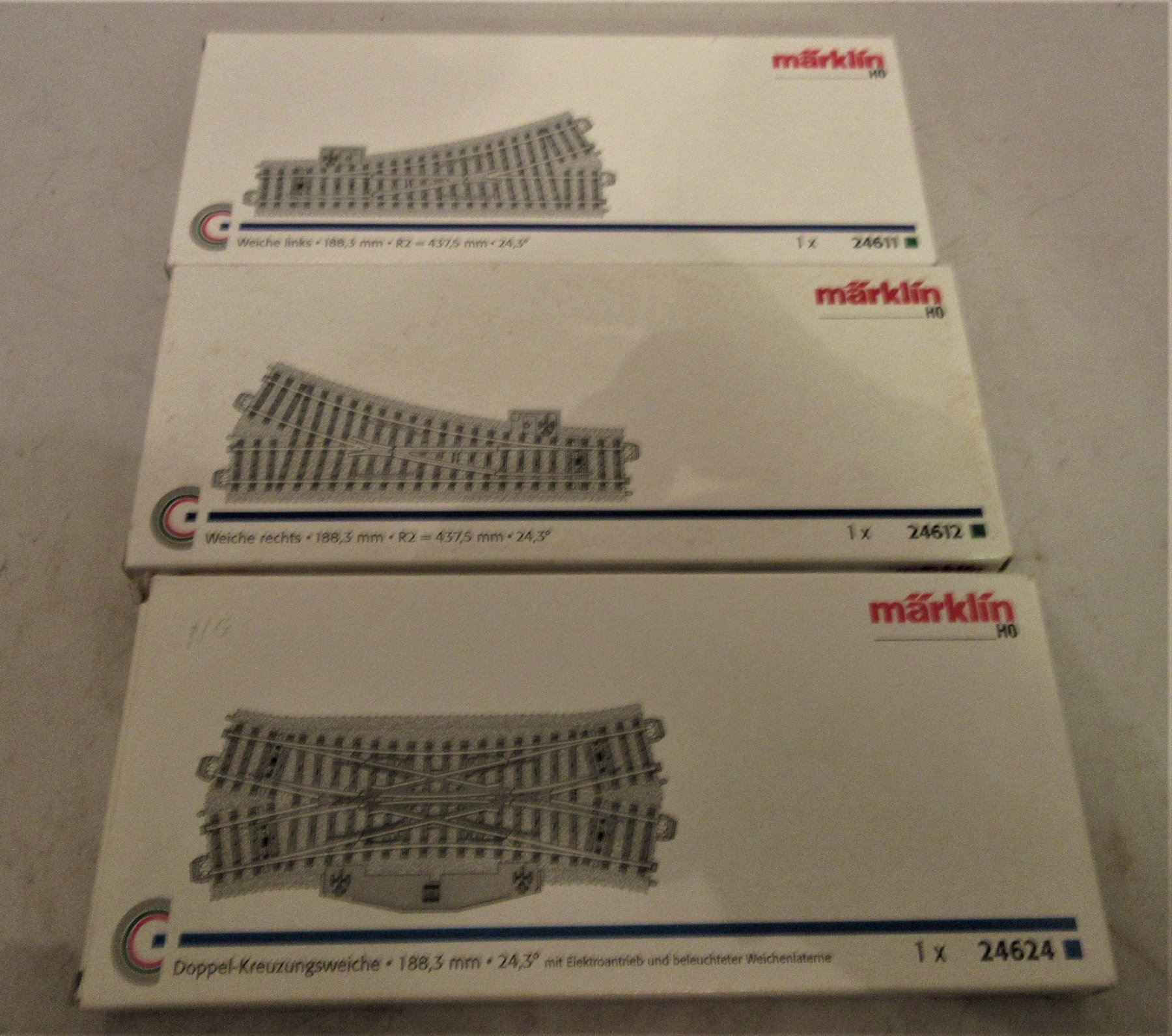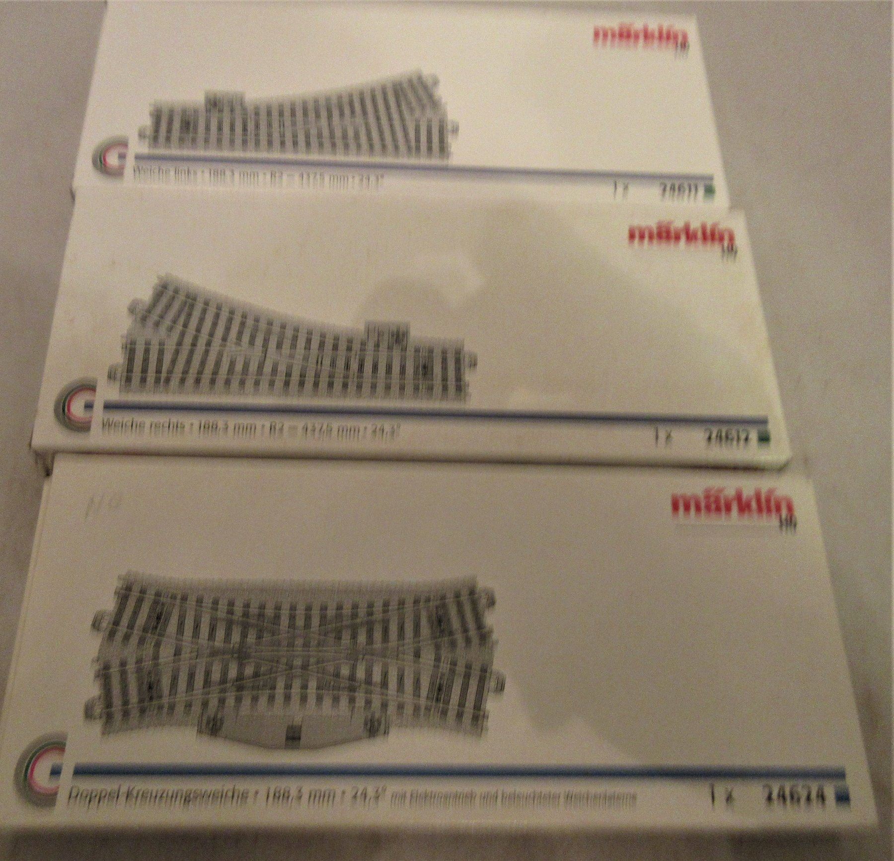 An assortment of Marklin HO scale switches in the original boxes. There is a 24624 double slip switch, a 24612 right hand switch, and a 24611 left hand switch. Excellent condition.