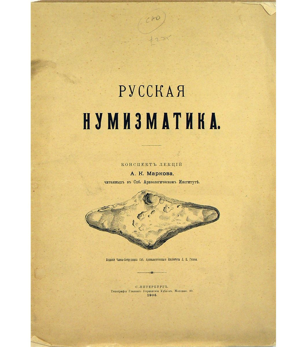 Markov, A.K. РУССКАЯ НУМИЗМАТИКА. . Saint Petersburg, 1905. Large 4to [31 by 22.5 cm], original printed wraps. 36, ii pages; 2 very fine plates of early Russian coins; 1 lithographic plate depicting several silver grivna. Untrimmed and unopened. Near fine. Lectures on Russian pre-Petrine numismatics read by the author at the St. Petersburg Imperial Archaeological Institute. Aleksei Konstantinovich Markov (1858-1920) was from 1888 the chief curator and director of the Department of Numismatics at the Hermitage. A professor at the St. Petersburg Imperial Archaeological Institute, he was a specialist in Russian and Islamic numismatics. He authored numerous entries on numismatic subjects in Russia's premiere multivolume reference Энциклопедический словарь Брокгауза и Ефрона. A trimmed copy of this work brought $850 hammer in our 2012 New York Book Auction. Clain-Stefanelli 11175. Mayer 1133.