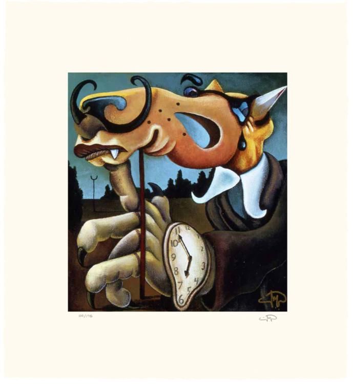 Artist: Markus PiersonTitle: Coyote Portrait of DaliMedium: Serigraph on PaperOrientation: verticalImage Size: 10 x 11.5 inchesPaper Size: 17 x 18 inchesEdition Size: 175: Hand-deckled edges, Signed by the artist, individually numbered, accompanied by certificate of authenticity signed by the publisher.Excerpts from his book, But I Digress, A Coyote's View of Art History * SALVADOR DALI * Salvador Dali was one of the pioneers and the undisputed star of the art movement called Surrealism. It was supposed to be sort of a bridge between conscious and unconscious, between reality and dreaming. He's also the primary reason most people think I get ideas while dreaming when, in fact, I never do. I once had a dream back when I was a teenager and I still remember it: I was motocross racing (when I was young, I ate, slept, drank and dated racing motorcycles) and the bike I was riding was a Husqvarna 360 with a purple gas tank! Weird city! Everyone knows the Husqvarna 360 has a maroon gas tank! Purple? It's nuts! My point here is simple: if Dali's dreams looked like his paintings . . . Whoa! No more pickles after eleven o'clock! That's one wacky conductor he's got on his dream-weaver train. I mean, can't you see it? Dali and his wife in bed sleeping, and Dali jumps up and says, "Wow, I just had the strangest dream!" And his wife says, "Oh good. I've had my eye on this beautiful Chanel suit and now I can get it!" But I digress. Let's talk about his work. * Salvador Dali was a masterful painter, a true technician. Not that you'd know if he weren't because, well, it's surreal and so it's supposed to look wrong. Still, there's an obvious genius to his paintings, in particular the really huge ones and the really tiny ones. Very cool. What I like best about it is the obvious effort he put in. Man, that is real work! Anybody who works that hard honors his canvases that way - you've got to take your hat off to him. As for the validity of Surrealism, I once saw a hypnotized guy act like a chicken without his knowledge, so I don't trust the subconscious - it's too tricky. How could you even really know when it wasn't bluffing? So no, I don't put much stock in Surrealism. World's weird enough when you're awake, that's what I think. But again, you've got to admire Dali's work ethic. And, as you've probably already noticed, nothing in the world of fine arts gets more respect from me than good, old-fashioned elbow grease. It's the primary flaw in art education today: they just don't put enough emphasis on the kind of flat-out effort you can see in a Dali canvas. And so these misled art students think they need only sneeze at a blank canvas to be considered a competent painter! It makes me nuts! But I digress. * Biography * Markus Pierson was born in 1961 and raised in the small farming town of Grand Ledge, Michigan, where his father owned a popular restaurant. A self-proclaimed reckless "racer", Markus was the youngest and most challenging of the four Pierson children. * While a student, an encouraging art teacher swung wide the door to Markus' talent and profoundly moved him. However, the Grand Ledge art scene was somewhat lacking, leading Markus to take on a number of odd jobs before accidentally stumbling upon accounting as a means to making a living. After a near-fatal bout with Crohn's Disease in early 1985, he declared that the accountant was "dead" and in his place was a man pursuing his dream of becoming a successful artist. * The Coyote Series was born in June of 1986, after Markus heard the Joni Mitchell song, "Coyote." He loved it, played it often and memorized the words. The focus of the song, a guy referred to as "Coyote," is a reckless, footloose Casanova type fellow - Pierson aspired to be the carefree romancer described in those lyrics. Then he did something he'd never done before or since: Markus made a drawing of a song. * Over the next six months Markus painted billboards by day for a living and drew his Coyotes into the night. To the wall above his desk he taped these words, "No one works this hard and this smart - and has it come to nothing." Within a year, he walked out of Artexpo in New York City with commitments from 110 art galleries who sought to represent his work. * In the decades that followed, Pierson's work has evolved to include a vast array of paintings, drawings, sculpture, hand-pulled serigraphs and original found-object works. Over time, the metaphor of the Coyote has taken on a more poignant and profound purpose. At its essence, the work urges us to pursue our dreams, wear our hearts on our sleeves, and to celebrate all of life's ups and downs. He has had nearly one hundred solo exhibitions in galleries across America, Australia and New Zealand, while also being featured at various prestigious international fairs including Art Miami, Artexpo New York, Sofa Chicago, Chicago Contemporary & Classic, and palmbeach3. Markus has amassed a collector base which includes Heads of State, major corporations and celebrities worldwide. * Markus' wife and muse is artist, Sheryl Pierson. The two live and work in a converted loft in Kansas City, Missouri. * "There's no doubt in my mind that my success has more to do with luck than talent, more to do with stubbornness than vision, more to do with ignorance than insight, but the fact remains that I pursued my dream and attained it against staggering odds. I say this now to anyone who will listen: even if I had failed, it would have been worth it. Better to face a brutal truth than to grow old wondering what might have been. " Markus Pierson *