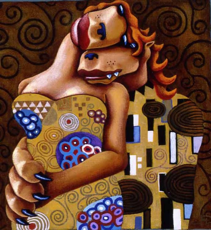 Artist: Markus PiersonTitle: Coyote Portrait of KlimtMedium: Canvas SerigraphOrientation: verticalImage Size: 10 x 11.5 inchesPaper Size: 10 x 11.5 inchesEdition Size: 175: Signed by the artist, individually numbered, accompanied by certificate of authenticity signed by the publisher.Excerpts from his book, But I Digress, A Coyote's View of Art History * * GUSTAV KLIMT * * When I was twenty, living in Milwaukee, I had a new apartment and a dog named Zeke. The night I got the apartment, I positioned all my paintings on the floor beneath the place I intended to hang them. That night as I slept, Zeke made his mark on every single one. Thank heavens for two things: 1) They were acrylic. 2) They were lousy. Gustav Klimt, a master of twentieth-century art, had cats. Dozens of cats, all of which had to "go." He made thousands of beautiful drawings. He laid them on the floor . . . with all the cats . . . * * Somewhere an art dealer is weeping . . . * * Let's not talk about his drawings anymore, shall we? Yes, fine, the paintings then. We are entering a glacial shift here now, new notions about art and how far you can tweak it are popping up like lost relatives at a millionaire's wake. Gustav was right there, melting the glacier with a gold-gilded blowtorch. He decided he didn't need to show the shape of a garment, or even show where the garment stops and the background starts. He just painted these lovely decorative swirls and patterns in blues and yellows and reds, and then applied gold all around them. How cool. And the farther out there he got, the more rules he forgot, the more interesting his world became. * * Many of Klimt's paintings had a sexual quality to them and, as you might guess, it put some noses out of joint. Almost all of his paintings of men and women have the woman as the bright shining star and the man as the groping also-ran. That put noses askew as well. And so whenever he looked about and saw a sea of mangled noses, he packed a bag and did some landscapes. Smart guy. * * He died at age fifty-five, orphaning about 268 cats and leaving fatherless more than a few little boys and girls all around Vienna. He was frisky, just like those cats. * Biography * * Markus Pierson was born in 1961 and raised in the small farming town of Grand Ledge, Michigan, where his father owned a popular restaurant. A self-proclaimed reckless "racer", Markus was the youngest and most challenging of the four Pierson children. * * While a student, an encouraging art teacher swung wide the door to Markus' talent and profoundly moved him. However, the Grand Ledge art scene was somewhat lacking, leading Markus to take on a number of odd jobs before accidentally stumbling upon accounting as a means to making a living. After a near-fatal bout with Crohn's Disease in early 1985, he declared that the accountant was "dead" and in his place was a man pursuing his dream of becoming a successful artist. * * The Coyote Series was born in June of 1986, after Markus heard the Joni Mitchell song, "Coyote." He loved it, played it often and memorized the words. The focus of the song, a guy referred to as "Coyote," is a reckless, footloose Casanova type fellow - Pierson aspired to be the carefree romancer described in those lyrics. Then he did something he'd never done before or since: Markus made a drawing of a song. * * Over the next six months Markus painted billboards by day for a living and drew his Coyotes into the night. To the wall above his desk he taped these words, "No one works this hard and this smart - and has it come to nothing." Within a year, he walked out of Artexpo in New York City with commitments from 110 art galleries who sought to represent his work. * * In the decades that followed, Pierson's work has evolved to include a vast array of paintings, drawings, sculpture, hand-pulled serigraphs and original found-object works. Over time, the metaphor of the Coyote has taken on a more poignant and profound purpose. At its essence, the work urges us to pursue our dreams, wear our hearts on our sleeves, and to celebrate all of life's ups and downs. He has had nearly one hundred solo exhibitions in galleries across America, Australia and New Zealand, while also being featured at various prestigious international fairs including Art Miami, Artexpo New York, Sofa Chicago, Chicago Contemporary & Classic, and palmbeach3. Markus has amassed a collector base which includes Heads of State, major corporations and celebrities worldwide. * * Markus' wife and muse is artist, Sheryl Pierson. The two live and work in a converted loft in Kansas City, Missouri. * * "There's no doubt in my mind that my success has more to do with luck than talent, more to do with stubbornness than vision, more to do with ignorance than insight, but the fact remains that I pursued my dream and attained it against staggering odds. I say this now to anyone who will listen: even if I had failed, it would have been worth it. Better to face a brutal truth than to grow old wondering what might have been. " Markus Pierson *