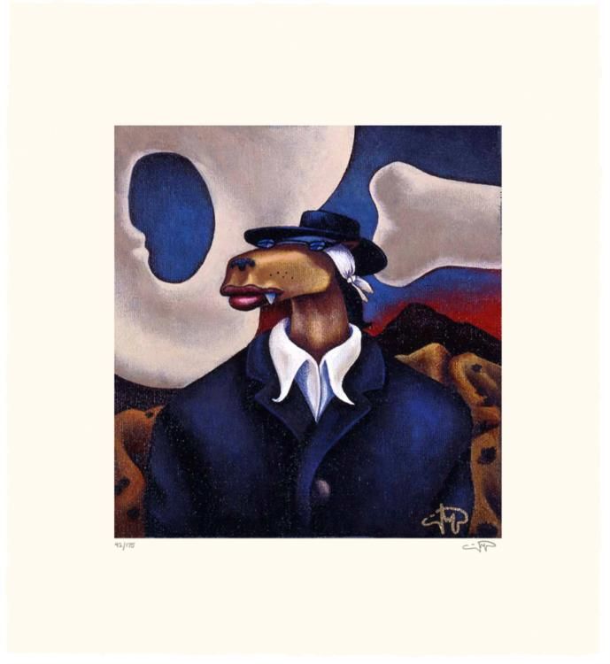 Artist: Markus PiersonTitle: Coyote Portrait of O'KeefeMedium: Serigraph on PaperOrientation: verticalImage Size: 10 x 11.5 inchesPaper Size: 17 x 18 inchesEdition Size: 175: Hand-deckled edges, Signed by the artist, individually numbered, accompanied by certificate of authenticity signed by the publisher.Excerpts from his book, But I Digress, A Coyote's View of Art History GEORGIA O'KEEFFE Hundreds and hundreds of years ago, rogue pirates sailed the seas, pillaging and murdering, eating meat, not brushing their teeth and smelling horrible. By the time Georgia O'Keeffe grew up, the pirates were long gone, and so we will never know who had more willpower. What we do know is that no one who knew her could match her in this regard. Things went well for you at Georgia's ghost ranch as long as you wanted to do everything Georgia wanted to do at the precise millisecond she decided she wanted to do it and only for as long. Otherwise, watch that cactus thorn, buster, its needle goes in and stays in. But I ask: Who cares? Let's talk art. Georgia started out in Manhattan painting flowers and abstracts and the coolest New York cityscapes you ever saw. She's a young raven-haired beauty when she meets gallery owner/photographer, Alfred Stieglitz, who promptly boots his wife and starts clicking his quivering shutter about a billion times. The subject? Her naked body in all its splendor. Whoops, I stopped talking about her art. She painted flowers like my mom folds towels, with exacting precision and intense passion, painted them in extreme close-up views that seem like abstract masterpieces to some and female anatomy lessons to others. In 1929 she cruised past New Mexico and the land of the giant watermelon (the Sandia Mountain Range - believe it or not, that's what they're named for) drew her like a cash-starved Democrat Pol to a shifty Indonesian billionaire (oooh, how topical for now). She moved there for good after Stieglitz died, and she painted what she wanted, when she wanted, how she wanted till she died. She painted New Mexico, an enchanted land, at its most mystical. And it is mystical. Stand outside at midnight on the outskirts of Taos - something lingers in the air. Georgia took deep, gulping gasps of that air and held it in, then let it come out and fairly engulf her work. Someone who hasn't been there never quite gets this, and someone who has, grows an abiding love for her stuff. Add me to that list. I painted some bones floating in the air behind her in my portrait of her. Some ninny looked at it and asked me if that was a sexual innuendo. I mean, hey, are you nuts? Absolutely not. Biography Markus Pierson was born in 1961 and raised in the small farming town of Grand Ledge, Michigan, where his father owned a popular restaurant. A self-proclaimed reckless "racer", Markus was the youngest and most challenging of the four Pierson children. While a student, an encouraging art teacher swung wide the door to Markus' talent and profoundly moved him. However, the Grand Ledge art scene was somewhat lacking, leading Markus to take on a number of odd jobs before accidentally stumbling upon accounting as a means to making a living. After a near-fatal bout with Crohn's Disease in early 1985, he declared that the accountant was "dead" and in his place was a man pursuing his dream of becoming a successful artist. The Coyote Series was born in June of 1986, after Markus heard the Joni Mitchell song, "Coyote." He loved it, played it often and memorized the words. The focus of the song, a guy referred to as "Coyote," is a reckless, footloose Casanova type fellow - Pierson aspired to be the carefree romancer described in those lyrics. Then he did something he'd never done before or since: Markus made a drawing of a song. Over the next six months Markus painted billboards by day for a living and drew his Coyotes into the night. To the wall above his desk he taped these words, "No one works this hard and this smart - and has it come to nothing." Within a year, he walked out of Artexpo in New York City with commitments from 110 art galleries who sought to represent his work. In the decades that followed, Pierson's work has evolved to include a vast array of paintings, drawings, sculpture, hand-pulled serigraphs and original found-object works. Over time, the metaphor of the Coyote has taken on a more poignant and profound purpose. At its essence, the work urges us to pursue our dreams, wear our hearts on our sleeves, and to celebrate all of life's ups and downs. He has had nearly one hundred solo exhibitions in galleries across America, Australia and New Zealand, while also being featured at various prestigious international fairs including Art Miami, Artexpo New York, Sofa Chicago, Chicago Contemporary & Classic, and palmbeach3. Markus has amassed a collector base which includes Heads of State, major corporations and celebrities worldwide. Markus' wife and muse is artist, Sheryl Pierson. The two live and work in a converted loft in Kansas City, Missouri. "There's no doubt in my mind that my success has more to do with luck than talent, more to do with stubbornness than vision, more to do with ignorance than insight, but the fact remains that I pursued my dream and attained it against staggering odds. I say this now to anyone who will listen: even if I had failed, it would have been worth it. Better to face a brutal truth than to grow old wondering what might have been. " Markus Pierson