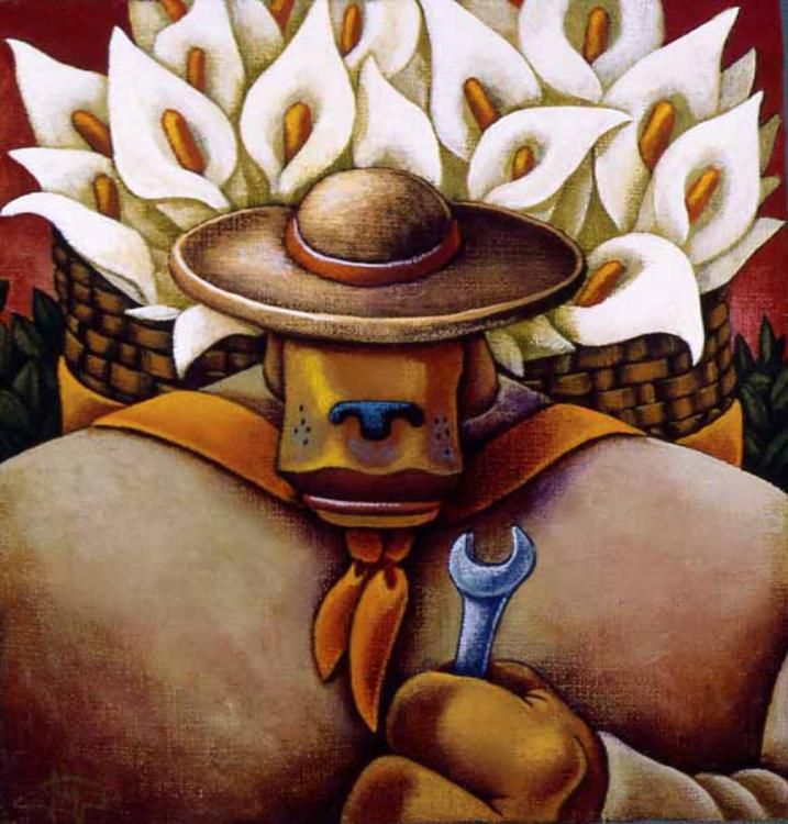 Artist: Markus PiersonTitle: Coyote Portrait of RiveraMedium: Canvas SerigraphOrientation: verticalImage Size: 10 x 11.5 inchesPaper Size: 10 x 11.5 inchesEdition Size: 175: Signed by the artist, individually numbered, accompanied by certificate of authenticity signed by the publisher.Excerpts from his book, But I Digress, A Coyote's View of Art History * * DIEGO RIVERA * * Don't get a vegetarian chef to run your steakhouse's kitchen, and don't hire an atheist to interpret your Bible, and don't hire a Communist to paint a mural about the joys of Capitalism. A certain Mr. Rockefeller skipped that third rule when he hired Diego Rivera to paint a mural in the foyer of Thirty Rock (30 Rockefeller Center, NYC). Uh oh. Many coats of gesso and a litany of cuss words later, the Rivera mural is gone, with a proper pro-industry image replacing it (which, incidentally, is an image I adore . . . it is the single coolest thing in all of Manhattan). Lump it, Diego. * * He wasn't handsome. His bulging eyes looked in two directions, he was obese, had bad skin, and his hair was a mess. No matter, the gals dug him, and he was a sex machine. Richard Roundtree's Shaft character is actually Diego Rivera with a car and a gun. Okay, I'm stretching, but I'm right on the mark when I say Diego Rivera was easily as socially successful as Paul Gauguin. Gauguin, as we know, caught syphilis; Diego Rivera had cancer of the, um, winkle. Some might see instruction in this information, others not. I'm not touching it. * * What a lovely painter. He knew his people, Mexicans toiling humbly, working quietly and diligently. He loved them, and that love comes through so eloquently in his canvases. He saw these workers as heroic, regardless of their task, saw the work they do carrying flowers or tooling machines just as important as the work of any law-making bureaucrat or corporate CEO. Almost makes me want to turn Marxist and I would, if not for currently having a job as the CEO of my own corporation. * * Diego was married to Frida Kahlo, whom I'll tell you about next. He put her in some of his murals, depicting her handing out guns and knives to the Revolutionaries. How sweet. Diego, unlike, say, those wimpy Impressionists, was not into nicey-nicey stuff. He would have just as soon pistol-whipped Renoir as look at him. Rivera wanted his art to tell a tale, to send a message, to cause a revolution, to unite the workers and overthrow the man! Fight the power! Lenin lives! Trotsky's a putz! Murals rule! Government for the muralist, by the muralist! A muralist in every pot! We have nothing to paint but paint itself! * * It's just not right that I make fun this way, but you know, paintings don't overthrow governments any more than dancers win fights. It only happens in the movies. That fact, however, does in no way alter the beauty, the importance, the power, or the artistic splendor of the paintings and murals of Diego Rivera. * Biography * * Markus Pierson was born in 1961 and raised in the small farming town of Grand Ledge, Michigan, where his father owned a popular restaurant. A self-proclaimed reckless "racer", Markus was the youngest and most challenging of the four Pierson children. * * While a student, an encouraging art teacher swung wide the door to Markus' talent and profoundly moved him. However, the Grand Ledge art scene was somewhat lacking, leading Markus to take on a number of odd jobs before accidentally stumbling upon accounting as a means to making a living. After a near-fatal bout with Crohn's Disease in early 1985, he declared that the accountant was "dead" and in his place was a man pursuing his dream of becoming a successful artist. * * The Coyote Series was born in June of 1986, after Markus heard the Joni Mitchell song, "Coyote." He loved it, played it often and memorized the words. The focus of the song, a guy referred to as "Coyote," is a reckless, footloose Casanova type fellow - Pierson aspired to be the carefree romancer described in those lyrics. Then he did something he'd never done before or since: Markus made a drawing of a song. * * Over the next six months Markus painted billboards by day for a living and drew his Coyotes into the night. To the wall above his desk he taped these words, "No one works this hard and this smart - and has it come to nothing." Within a year, he walked out of Artexpo in New York City with commitments from 110 art galleries who sought to represent his work. * * In the decades that followed, Pierson's work has evolved to include a vast array of paintings, drawings, sculpture, hand-pulled serigraphs and original found-object works. Over time, the metaphor of the Coyote has taken on a more poignant and profound purpose. At its essence, the work urges us to pursue our dreams, wear our hearts on our sleeves, and to celebrate all of life's ups and downs. He has had nearly one hundred solo exhibitions in galleries across America, Australia and New Zealand, while also being featured at various prestigious international fairs including Art Miami, Artexpo New York, Sofa Chicago, Chicago Contemporary & Classic, and palmbeach3. Markus has amassed a collector base which includes Heads of State, major corporations and celebrities worldwide. * * Markus' wife and muse is artist, Sheryl Pierson. The two live and work in a converted loft in Kansas City, Missouri. * * "There's no doubt in my mind that my success has more to do with luck than talent, more to do with stubbornness than vision, more to do with ignorance than insight, but the fact remains that I pursued my dream and attained it against staggering odds. I say this now to anyone who will listen: even if I had failed, it would have been worth it. Better to face a brutal truth than to grow old wondering what might have been. " Markus Pierson *
