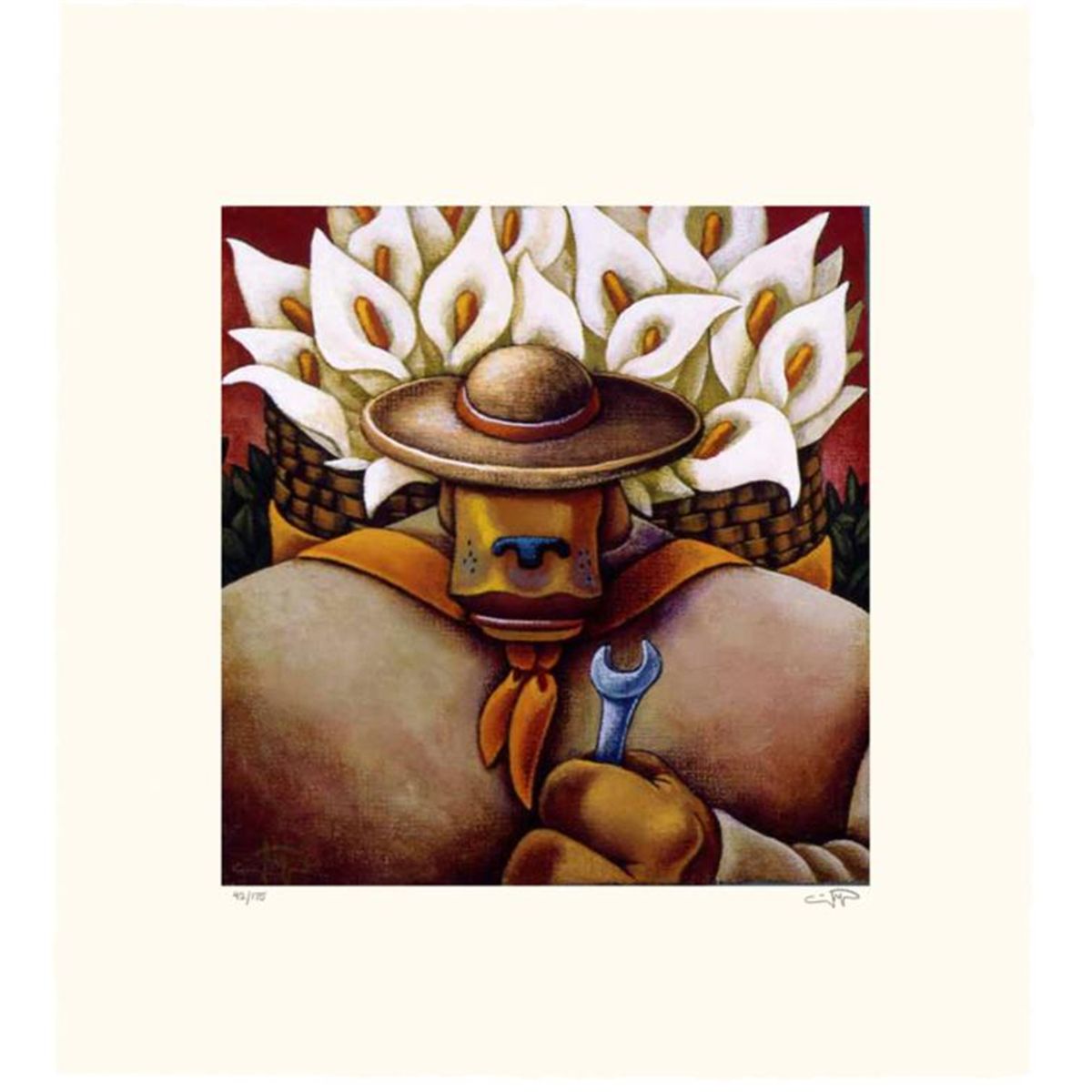 Artist: Markus PiersonTitle: Coyote Portrait of RiveraMedium: Serigraph on PaperOrientation: verticalImage Size: 10 x 11.5 inchesPaper Size: 17 x 18 inchesEdition Size: 175: Hand-deckled edges, Signed by the artist, individually numbered, accompanied by certificate of authenticity signed by the publisher.Excerpts from his book, But I Digress, A Coyote's View of Art History * * DIEGO RIVERA * * Don't get a vegetarian chef to run your steakhouse's kitchen, and don't hire an atheist to interpret your Bible, and don't hire a Communist to paint a mural about the joys of Capitalism. A certain Mr. Rockefeller skipped that third rule when he hired Diego Rivera to paint a mural in the foyer of Thirty Rock (30 Rockefeller Center, NYC). Uh oh. Many coats of gesso and a litany of cuss words later, the Rivera mural is gone, with a proper pro-industry image replacing it (which, incidentally, is an image I adore . . . it is the single coolest thing in all of Manhattan). Lump it, Diego. * * He wasn't handsome. His bulging eyes looked in two directions, he was obese, had bad skin, and his hair was a mess. No matter, the gals dug him, and he was a sex machine. Richard Roundtree's Shaft character is actually Diego Rivera with a car and a gun. Okay, I'm stretching, but I'm right on the mark when I say Diego Rivera was easily as socially successful as Paul Gauguin. Gauguin, as we know, caught syphilis; Diego Rivera had cancer of the, um, winkle. Some might see instruction in this information, others not. I'm not touching it. * * What a lovely painter. He knew his people, Mexicans toiling humbly, working quietly and diligently. He loved them, and that love comes through so eloquently in his canvases. He saw these workers as heroic, regardless of their task, saw the work they do carrying flowers or tooling machines just as important as the work of any law-making bureaucrat or corporate CEO. Almost makes me want to turn Marxist and I would, if not for currently having a job as the CEO of my own corporation. * * Diego was married to Frida Kahlo, whom I'll tell you about next. He put her in some of his murals, depicting her handing out guns and knives to the Revolutionaries. How sweet. Diego, unlike, say, those wimpy Impressionists, was not into nicey-nicey stuff. He would have just as soon pistol-whipped Renoir as look at him. Rivera wanted his art to tell a tale, to send a message, to cause a revolution, to unite the workers and overthrow the man! Fight the power! Lenin lives! Trotsky's a putz! Murals rule! Government for the muralist, by the muralist! A muralist in every pot! We have nothing to paint but paint itself! * * It's just not right that I make fun this way, but you know, paintings don't overthrow governments any more than dancers win fights. It only happens in the movies. That fact, however, does in no way alter the beauty, the importance, the power, or the artistic splendor of the paintings and murals of Diego Rivera. * Biography * * Markus Pierson was born in 1961 and raised in the small farming town of Grand Ledge, Michigan, where his father owned a popular restaurant. A self-proclaimed reckless "racer", Markus was the youngest and most challenging of the four Pierson children. * * While a student, an encouraging art teacher swung wide the door to Markus' talent and profoundly moved him. However, the Grand Ledge art scene was somewhat lacking, leading Markus to take on a number of odd jobs before accidentally stumbling upon accounting as a means to making a living. After a near-fatal bout with Crohn's Disease in early 1985, he declared that the accountant was "dead" and in his place was a man pursuing his dream of becoming a successful artist. * * The Coyote Series was born in June of 1986, after Markus heard the Joni Mitchell song, "Coyote." He loved it, played it often and memorized the words. The focus of the song, a guy referred to as "Coyote," is a reckless, footloose Casanova type fellow - Pierson aspired to be the carefree romancer described in those lyrics. Then he did something he'd never done before or since: Markus made a drawing of a song. * * Over the next six months Markus painted billboards by day for a living and drew his Coyotes into the night. To the wall above his desk he taped these words, "No one works this hard and this smart - and has it come to nothing." Within a year, he walked out of Artexpo in New York City with commitments from 110 art galleries who sought to represent his work. * * In the decades that followed, Pierson's work has evolved to include a vast array of paintings, drawings, sculpture, hand-pulled serigraphs and original found-object works. Over time, the metaphor of the Coyote has taken on a more poignant and profound purpose. At its essence, the work urges us to pursue our dreams, wear our hearts on our sleeves, and to celebrate all of life's ups and downs. He has had nearly one hundred solo exhibitions in galleries across America, Australia and New Zealand, while also being featured at various prestigious international fairs including Art Miami, Artexpo New York, Sofa Chicago, Chicago Contemporary & Classic, and palmbeach3. Markus has amassed a collector base which includes Heads of State, major corporations and celebrities worldwide. * * Markus' wife and muse is artist, Sheryl Pierson. The two live and work in a converted loft in Kansas City, Missouri. * * "There's no doubt in my mind that my success has more to do with luck than talent, more to do with stubbornness than vision, more to do with ignorance than insight, but the fact remains that I pursued my dream and attained it against staggering odds. I say this now to anyone who will listen: even if I had failed, it would have been worth it. Better to face a brutal truth than to grow old wondering what might have been. " Markus Pierson *