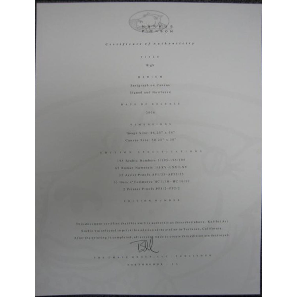 This art print portrays a couple of dogs getting "high" together in the best way they know how-- on a high tree branch.Artist: Markus Pierson Signed and numbered in pencilTitle: High Medium: Serigraph on CanvasImage size: 46.25 x 34 inchesCanvas size: 50.25 x 38 inches Edition size: 195Biography * Markus Pierson was born in 1961 and raised in the small farming town of Grand Ledge, Michigan, where his father owned a popular restaurant. A self-proclaimed reckless "racer", Markus was the youngest and most challenging of the four Pierson children. * While a student, an encouraging art teacher swung wide the door to Markus' talent and profoundly moved him. However, the Grand Ledge art scene was somewhat lacking, leading Markus to take on a number of odd jobs before accidentally stumbling upon accounting as a means to making a living. After a near-fatal bout with Crohn's Disease in early 1985, he declared that the accountant was "dead" and in his place was a man pursuing his dream of becoming a successful artist. * The Coyote Series was born in June of 1986, after Markus heard the Joni Mitchell song, "Coyote." He loved it, played it often and memorized the words. The focus of the song, a guy referred to as "Coyote," is a reckless, footloose Casanova type fellow - Pierson aspired to be the carefree romancer described in those lyrics. Then he did something he'd never done before or since: Markus made a drawing of a song. * Over the next six months Markus painted billboards by day for a living and drew his Coyotes into the night. To the wall above his desk he taped these words, "No one works this hard and this smart - and has it come to nothing." Within a year, he walked out of Artexpo in New York City with commitments from 110 art galleries who sought to represent his work. * In the decades that followed, Pierson's work has evolved to include a vast array of paintings, drawings, sculpture, hand-pulled serigraphs and original found-object works. Over time, the metaphor of the Coyote has taken on a more poignant and profound purpose. At its essence, the work urges us to pursue our dreams, wear our hearts on our sleeves, and to celebrate all of life's ups and downs. He has had nearly one hundred solo exhibitions in galleries across America, Australia and New Zealand, while also being featured at various prestigious international fairs including Art Miami, Artexpo New York, Sofa Chicago, Chicago Contemporary & Classic, and palmbeach3. Markus has amassed a collector base which includes Heads of State, major corporations and celebrities worldwide. * Markus' wife and muse is artist, Sheryl Pierson. The two live and work in a converted loft in Kansas City, Missouri. * "There's no doubt in my mind that my success has more to do with luck than talent, more to do with stubbornness than vision, more to do with ignorance than insight, but the fact remains that I pursued my dream and attained it against staggering odds. I say this now to anyone who will listen: even if I had failed, it would have been worth it. Better to face a brutal truth than to grow old wondering what might have been. " Markus Pierson *