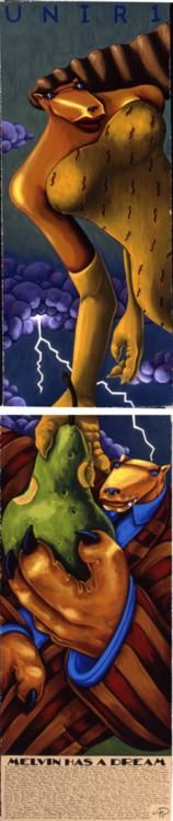Artist: Markus PiersonTitle: Melvin Has a Dream, DiptychMedium: Serigraph on PaperOrientation: verticalImage Size: 12.5 total x 64 total inchesPaper Size: 12.5 ea x 30 ea inchesEdition Size: 175: Signed by the artist, individually numbered, accompanied by certificate of authenticity signed by the publisher.Markus Pierson: Original Stories Melvin Has a Dream A little after eleven Melvin set down his book, closed his eyes and settled in for a good night's sleep, unaware, that the next eight or so hours would change his life. Melvin was a true bachelor, and though he loved his gal Elena very much, he let her know he was not the marrying kind. "Marriage," he told her, "is like cutting off my arms and handing them to you. Yes, the arms can hold you and keep you safe, but I can no longer use them myself to reach for the sky. From that point on I must focus my gaze on the foreground, and leave the horizon to others. I don't want this, and I doubt you would either." This was before the dream that would change his life. It began with Melvin standing in a field. In the sky above him this appeared: "Unir 1." Melvin couldn't make sense of it. Then Elena appeared, floating slowly across the sky toward him. In his hand was a huge pear. She took a bite of it as she neared him, then handed it to him and said, "Partake, my love, and clear the path. Soon the way will come to you." Melvin took a bite. It was delicious. He handed it back up to her and as she took it she said, "An old proverb will lead you to where I shall be waiting." Melvin spoke, "An old proverb? What, like "You are what you eat?" "And so it shall be," Elena began, "Tell me now, what have you partaken, what shall you be?" "I - we - ate part of a big pear," Melvin replied, "Then we are both parts of a big pair, are we not?" Elena asked. "Uh, yeah. Okay I get it," Melvin said. "And ever shall be. You and I are one, and we are each made larger and more complete by out pairing." With that Elena began to float away, but Melvin stopped her, "What does 'Unir 1' mean?" he asked. "I already told you, my love, fear not, it will come back to you, only slow down." The next day Melvin saw Elena and he promptly proposed. She was more than a little bit surprised, especially after she said yes and he offered her a pear instead of a ring. He said, "It'll come to you." She replied, "It better."Biography Markus Pierson was born in 1961 and raised in the small farming town of Grand Ledge, Michigan, where his father owned a popular restaurant. A self-proclaimed reckless "racer", Markus was the youngest and most challenging of the four Pierson children. While a student, an encouraging art teacher swung wide the door to Markus' talent and profoundly moved him. However, the Grand Ledge art scene was somewhat lacking, leading Markus to take on a number of odd jobs before accidentally stumbling upon accounting as a means to making a living. After a near-fatal bout with Crohn's Disease in early 1985, he declared that the accountant was "dead" and in his place was a man pursuing his dream of becoming a successful artist. The Coyote Series was born in June of 1986, after Markus heard the Joni Mitchell song, "Coyote." He loved it, played it often and memorized the words. The focus of the song, a guy referred to as "Coyote," is a reckless, footloose Casanova type fellow - Pierson aspired to be the carefree romancer described in those lyrics. Then he did something he'd never done before or since: Markus made a drawing of a song. Over the next six months Markus painted billboards by day for a living and drew his Coyotes into the night. To the wall above his desk he taped these words, "No one works this hard and this smart - and has it come to nothing." Within a year, he walked out of Artexpo in New York City with commitments from 110 art galleries who sought to represent his work. In the decades that followed, Pierson's work has evolved to include a vast array of paintings, drawings, sculpture, hand-pulled serigraphs and original found-object works. Over time, the metaphor of the Coyote has taken on a more poignant and profound purpose. At its essence, the work urges us to pursue our dreams, wear our hearts on our sleeves, and to celebrate all of life's ups and downs. He has had nearly one hundred solo exhibitions in galleries across America, Australia and New Zealand, while also being featured at various prestigious international fairs including Art Miami, Artexpo New York, Sofa Chicago, Chicago Contemporary & Classic, and palmbeach3. Markus has amassed a collector base which includes Heads of State, major corporations and celebrities worldwide. Markus' wife and muse is artist, Sheryl Pierson. The two live and work in a converted loft in Kansas City, Missouri. "There's no doubt in my mind that my success has more to do with luck than talent, more to do with stubbornness than vision, more to do with ignorance than insight, but the fact remains that I pursued my dream and attained it against staggering odds. I say this now to anyone who will listen: even if I had failed, it would have been worth it. Better to face a brutal truth than to grow old wondering what might have been. " Markus Pierson