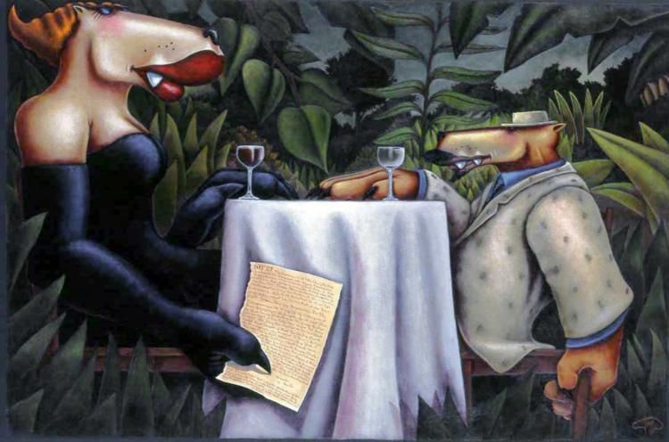 Artist: Markus PiersonTitle: The Last Known Journal EntryMedium: Serigraph on PanelOrientation: horizontalImage Size: 36 x 24 inchesPaper Size: 36 x 24 inchesEdition Size: 195: Signed by the artist, individually numbered, accompanied by certificate of authenticity signed by the publisher.Markus Pierson: Original Stories * * Last Known Journal Entry * * Day 23 * * My experience with "Mia Likey," the high Coyotess of the Amazonian all-female Prodogucci Tribe, becomes more compelling each day. A huge and fierce red-haired warrior, her milky white skin covering more curves than a child's drawing of the ocean, Mia Likey has proven to be a worthy adversary. She's quite reluctant to give up information about the tribe, but I am now quite certain they are responsible for the disappearance of many of my colleagues. I have recognized the laughter, or at least one of them, coming from deep in the jungle bushes late at night. I can only hope they're not being tortured. Mia Likey has invited me to an intimate tribal feast tonight. I must be on my guard. The Prodoguccis are rumored to have a ritual they call "The Wiles," whereupon they trick a man into talking about himself while they give him wine. He becomes thirsty, drinks, drinks some more, and whammo – they make him a Love Slave. I, being a modest, brilliant man of science, will have no problem out-foxing her in this regard. I will speak very little, drink very little, and stay at full attention. She is quite ravishing though. * * Regards, F. Horacio * * P.S. I wonder what she'd look like if, instead of her tribal attire, she wore a little black dress and long silk gloves. Ooobah Doobah . . . ah, well, never mind. My experiment continues. I will write again tomorrow. Adieu. * Biography * * Markus Pierson was born in 1961 and raised in the small farming town of Grand Ledge, Michigan, where his father owned a popular restaurant. A self-proclaimed reckless "racer", Markus was the youngest and most challenging of the four Pierson children. * * While a student, an encouraging art teacher swung wide the door to Markus' talent and profoundly moved him. However, the Grand Ledge art scene was somewhat lacking, leading Markus to take on a number of odd jobs before accidentally stumbling upon accounting as a means to making a living. After a near-fatal bout with Crohn's Disease in early 1985, he declared that the accountant was "dead" and in his place was a man pursuing his dream of becoming a successful artist. * * The Coyote Series was born in June of 1986, after Markus heard the Joni Mitchell song, "Coyote." He loved it, played it often and memorized the words. The focus of the song, a guy referred to as "Coyote," is a reckless, footloose Casanova type fellow - Pierson aspired to be the carefree romancer described in those lyrics. Then he did something he'd never done before or since: Markus made a drawing of a song. * * Over the next six months Markus painted billboards by day for a living and drew his Coyotes into the night. To the wall above his desk he taped these words, "No one works this hard and this smart - and has it come to nothing." Within a year, he walked out of Artexpo in New York City with commitments from 110 art galleries who sought to represent his work. * * In the decades that followed, Pierson's work has evolved to include a vast array of paintings, drawings, sculpture, hand-pulled serigraphs and original found-object works. Over time, the metaphor of the Coyote has taken on a more poignant and profound purpose. At its essence, the work urges us to pursue our dreams, wear our hearts on our sleeves, and to celebrate all of life's ups and downs. He has had nearly one hundred solo exhibitions in galleries across America, Australia and New Zealand, while also being featured at various prestigious international fairs including Art Miami, Artexpo New York, Sofa Chicago, Chicago Contemporary & Classic, and palmbeach3. Markus has amassed a collector base which includes Heads of State, major corporations and celebrities worldwide. * * Markus' wife and muse is artist, Sheryl Pierson. The two live and work in a converted loft in Kansas City, Missouri. * * "There's no doubt in my mind that my success has more to do with luck than talent, more to do with stubbornness than vision, more to do with ignorance than insight, but the fact remains that I pursued my dream and attained it against staggering odds. I say this now to anyone who will listen: even if I had failed, it would have been worth it. Better to face a brutal truth than to grow old wondering what might have been. " Markus Pierson *