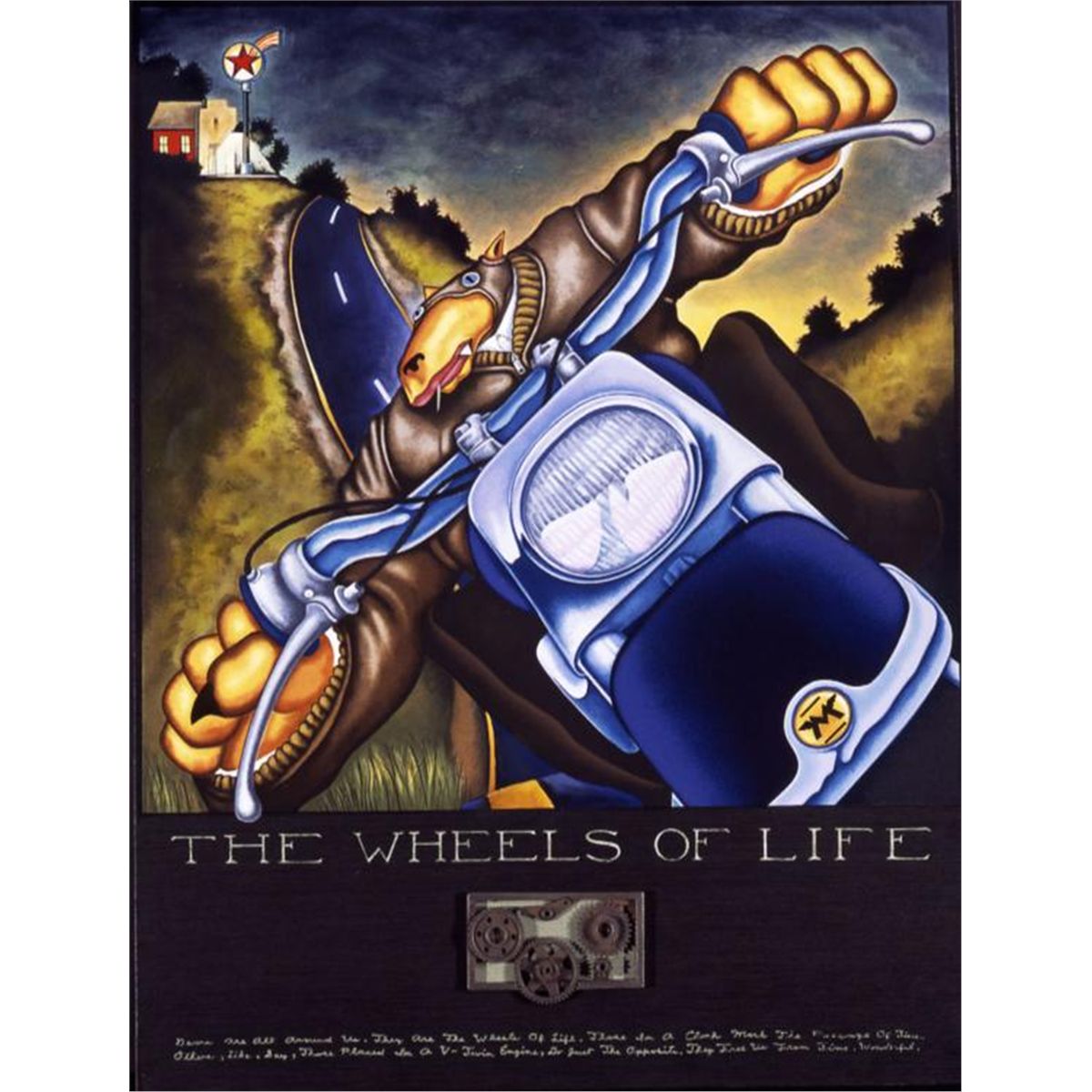 Artist: Markus PiersonTitle: Wheels of LifeMedium: Serigraph on PanelOrientation: verticalImage Size: 24.5 x 32.25 inchesPaper Size: 24.5 x 32.25 inchesEdition Size: 195: Signed by the artist, individually numbered, accompanied by certificate of authenticity signed by the publisher.Markus Pierson: Original Stories * * Wheels of Life * * Gears are all around us. They are the wheels of life. Those in a clock mark the passage of time. Others, like, say, those placed in a v-twin engine, do just the opposite. They free us from time. Wonderful. * Biography * * Markus Pierson was born in 1961 and raised in the small farming town of Grand Ledge, Michigan, where his father owned a popular restaurant. A self-proclaimed reckless "racer", Markus was the youngest and most challenging of the four Pierson children. * * While a student, an encouraging art teacher swung wide the door to Markus' talent and profoundly moved him. However, the Grand Ledge art scene was somewhat lacking, leading Markus to take on a number of odd jobs before accidentally stumbling upon accounting as a means to making a living. After a near-fatal bout with Crohn's Disease in early 1985, he declared that the accountant was "dead" and in his place was a man pursuing his dream of becoming a successful artist. * * The Coyote Series was born in June of 1986, after Markus heard the Joni Mitchell song, "Coyote." He loved it, played it often and memorized the words. The focus of the song, a guy referred to as "Coyote," is a reckless, footloose Casanova type fellow - Pierson aspired to be the carefree romancer described in those lyrics. Then he did something he'd never done before or since: Markus made a drawing of a song. * * Over the next six months Markus painted billboards by day for a living and drew his Coyotes into the night. To the wall above his desk he taped these words, "No one works this hard and this smart - and has it come to nothing." Within a year, he walked out of Artexpo in New York City with commitments from 110 art galleries who sought to represent his work. * * In the decades that followed, Pierson's work has evolved to include a vast array of paintings, drawings, sculpture, hand-pulled serigraphs and original found-object works. Over time, the metaphor of the Coyote has taken on a more poignant and profound purpose. At its essence, the work urges us to pursue our dreams, wear our hearts on our sleeves, and to celebrate all of life's ups and downs. He has had nearly one hundred solo exhibitions in galleries across America, Australia and New Zealand, while also being featured at various prestigious international fairs including Art Miami, Artexpo New York, Sofa Chicago, Chicago Contemporary & Classic, and palmbeach3. Markus has amassed a collector base which includes Heads of State, major corporations and celebrities worldwide. * * Markus' wife and muse is artist, Sheryl Pierson. The two live and work in a converted loft in Kansas City, Missouri. * * "There's no doubt in my mind that my success has more to do with luck than talent, more to do with stubbornness than vision, more to do with ignorance than insight, but the fact remains that I pursued my dream and attained it against staggering odds. I say this now to anyone who will listen: even if I had failed, it would have been worth it. Better to face a brutal truth than to grow old wondering what might have been. " Markus Pierson *