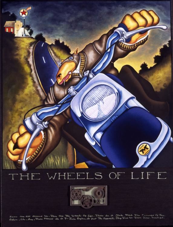 Artist: Markus PiersonTitle: Wheels of LifeMedium: Serigraph on PanelOrientation: verticalImage Size: 24.5 x 32.25 inchesPaper Size: 24.5 x 32.25 inchesEdition Size: 195: Signed by the artist, individually numbered, accompanied by certificate of authenticity signed by the publisher.Markus Pierson: Original Stories Wheels of Life Gears are all around us. They are the wheels of life. Those in a clock mark the passage of time. Others, like, say, those placed in a v-twin engine, do just the opposite. They free us from time. Wonderful.Biography Markus Pierson was born in 1961 and raised in the small farming town of Grand Ledge, Michigan, where his father owned a popular restaurant. A self-proclaimed reckless "racer", Markus was the youngest and most challenging of the four Pierson children. While a student, an encouraging art teacher swung wide the door to Markus' talent and profoundly moved him. However, the Grand Ledge art scene was somewhat lacking, leading Markus to take on a number of odd jobs before accidentally stumbling upon accounting as a means to making a living. After a near-fatal bout with Crohn's Disease in early 1985, he declared that the accountant was "dead" and in his place was a man pursuing his dream of becoming a successful artist. The Coyote Series was born in June of 1986, after Markus heard the Joni Mitchell song, "Coyote." He loved it, played it often and memorized the words. The focus of the song, a guy referred to as "Coyote," is a reckless, footloose Casanova type fellow - Pierson aspired to be the carefree romancer described in those lyrics. Then he did something he'd never done before or since: Markus made a drawing of a song. Over the next six months Markus painted billboards by day for a living and drew his Coyotes into the night. To the wall above his desk he taped these words, "No one works this hard and this smart - and has it come to nothing." Within a year, he walked out of Artexpo in New York City with commitments from 110 art galleries who sought to represent his work. In the decades that followed, Pierson's work has evolved to include a vast array of paintings, drawings, sculpture, hand-pulled serigraphs and original found-object works. Over time, the metaphor of the Coyote has taken on a more poignant and profound purpose. At its essence, the work urges us to pursue our dreams, wear our hearts on our sleeves, and to celebrate all of life's ups and downs. He has had nearly one hundred solo exhibitions in galleries across America, Australia and New Zealand, while also being featured at various prestigious international fairs including Art Miami, Artexpo New York, Sofa Chicago, Chicago Contemporary & Classic, and palmbeach3. Markus has amassed a collector base which includes Heads of State, major corporations and celebrities worldwide. Markus' wife and muse is artist, Sheryl Pierson. The two live and work in a converted loft in Kansas City, Missouri. "There's no doubt in my mind that my success has more to do with luck than talent, more to do with stubbornness than vision, more to do with ignorance than insight, but the fact remains that I pursued my dream and attained it against staggering odds. I say this now to anyone who will listen: even if I had failed, it would have been worth it. Better to face a brutal truth than to grow old wondering what might have been. " Markus Pierson