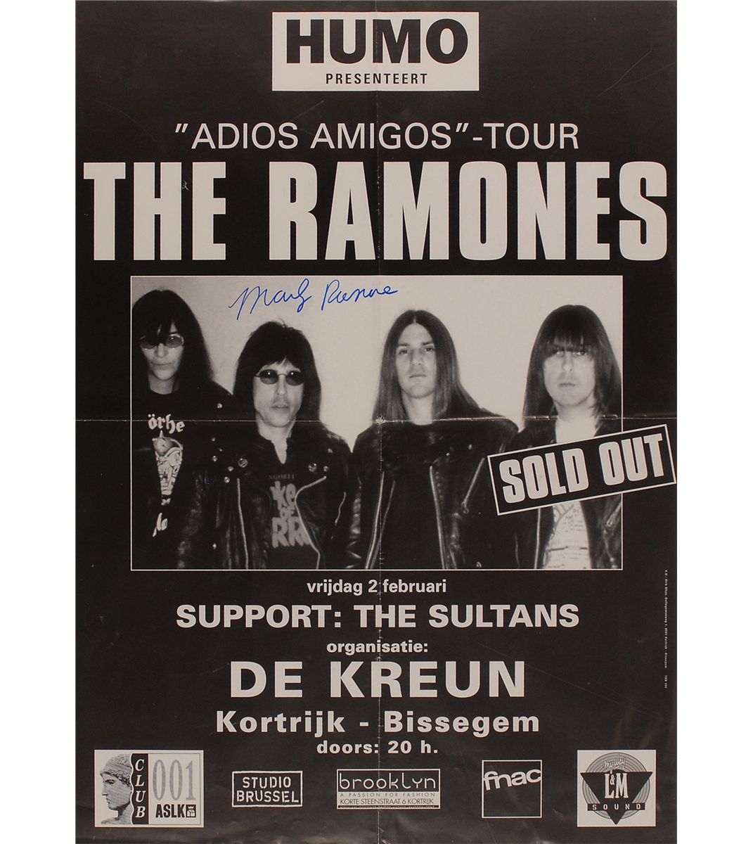 Rare poster for the Ramones’ 1995 ‘Adios Amigos’ sold out tour in Belgium, 19.5 x 27.5, signed in blue felt tip by Marky Ramone. In fine condition, with standard distributor's folds.