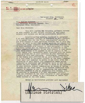Nice contract signed ''Marlene Dietrich'' between the actress and Universal Studios, dated 30 December 1939, the year Dietrich denounced her German citizenship and became an American citizen. Two page contract is signed on the second page by Dietrich and countersigned by two representatives of Universal Pictures Co., Inc. Second page also features blindstamped embossed seal for Universal. 8.5'' x 11'' document on rice paper is in near fine condition with only light creasing and staples at top.