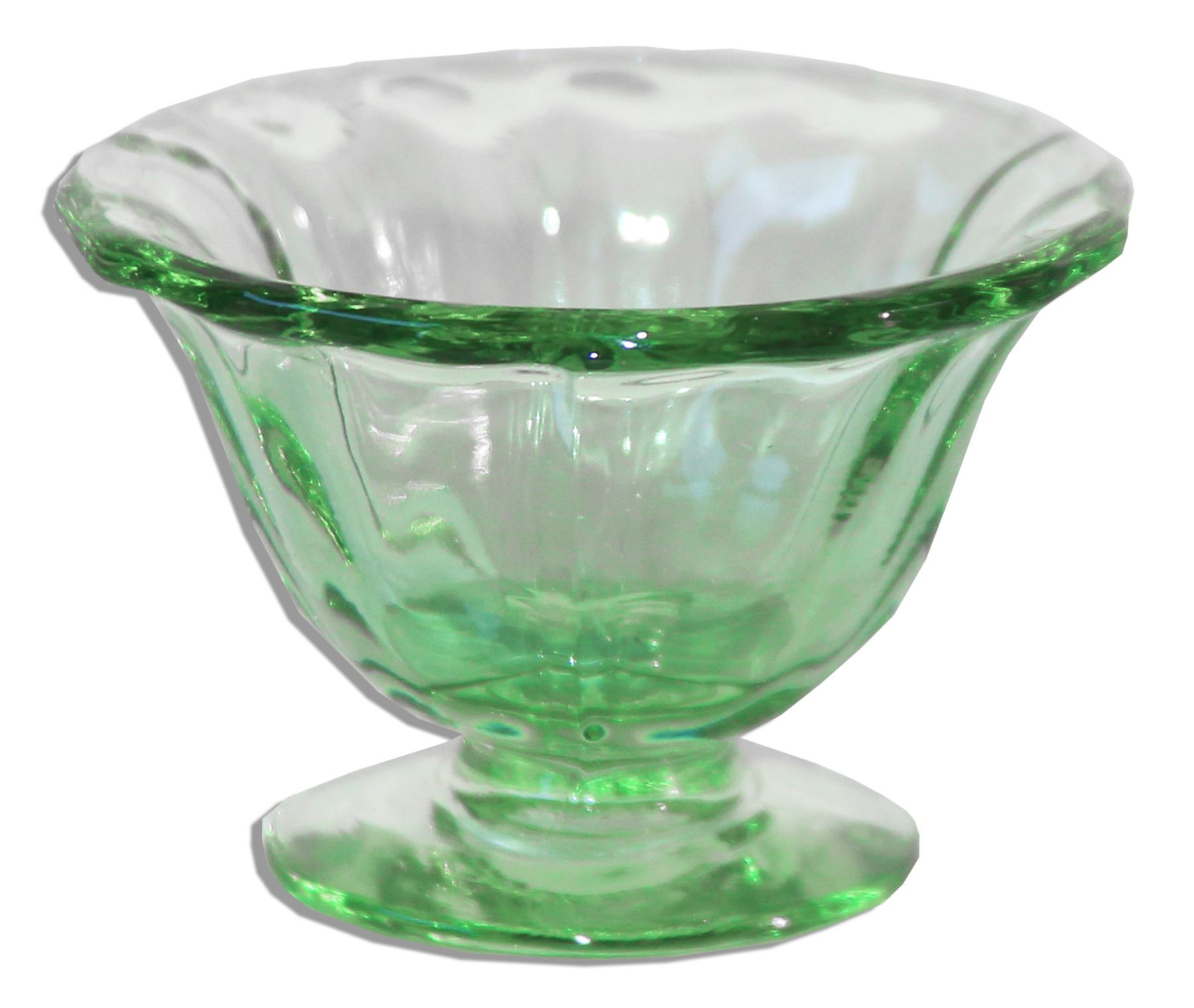 Marlene Dietrich cordial glass. Petite green glass features a fluted bowl on a very short stem and plain slightly domed foot. Rim is slightly scalloped in keeping with the fluting on the sides. Dates to circa 1970 and is likely an example of Bohemian glass. Measures 1.5'' in height and 2.25'' across the mouth. Fine. From the estate of Marlene Dietrich.