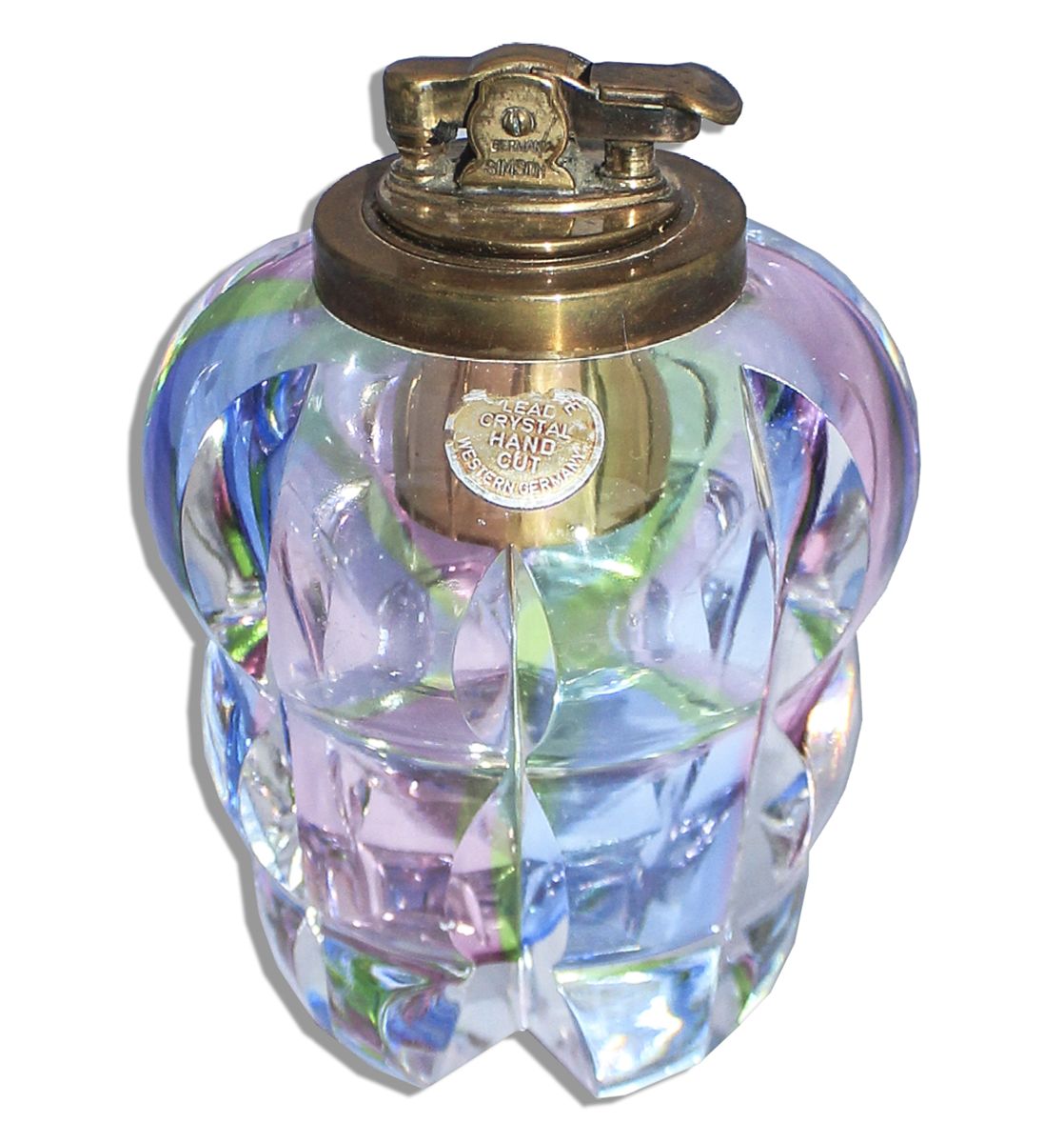 Marlene Dietrich's own crystal table lighter. Beautiful piece is made of hand cut lead crystal by Simson of West Germany. Lighter features a multicolor body with a petrol and flint mechanism on the top and dates to circa 1950-1964. Maker's marks are present on the mechanism. Measures 4.5'' in height and 3.25'' in diameter at its widest. Weighs 1 pound 4 ounces. Near fine. From the estate of Marlene Dietrich.