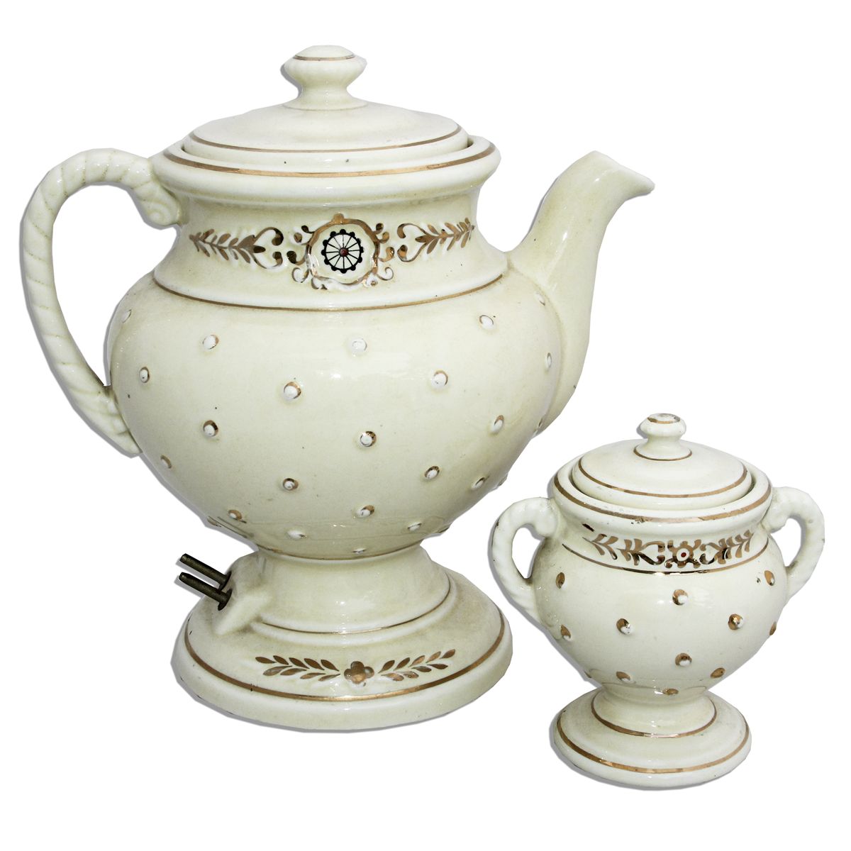 Marlene Dietrich's percolator coffee set. Two-piece set comprises a percolator coffee pot and matching lidded sugar bowl in butter-cream color glazed porcelain with gilt accents; the so-called Barock Gold Dot pattern by vintage maker Porcelier. Pot features a metal brew basket. Metal underside is engraved with maker's name. Partial set dates from the 1930's to the 1970's. Percolator pot measures 10.25'' in height, 9.25'' from spout to handle and 7'' across the widest portion of body. Double-handled sugar bowl measures 5.5'' in height, 5'' across including handles and 3.75'' across the body. Cord is absent and electrical mechanism is unknown condition and some loss to gilt decoration, else near fine. From the estate of Marlene Dietrich.