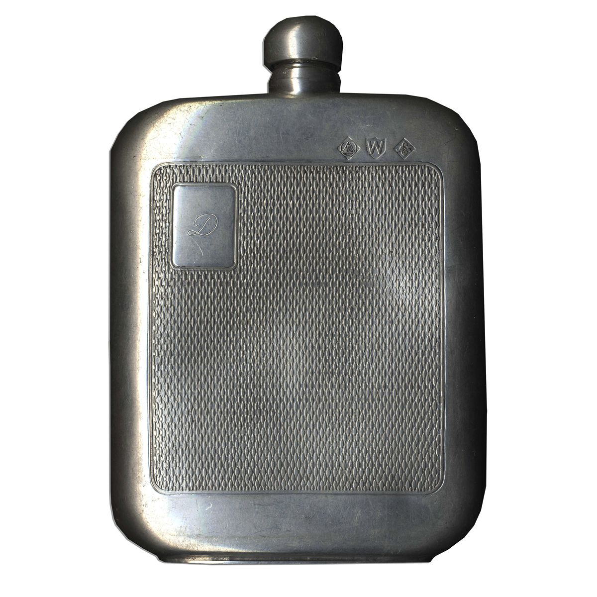 Marlene Dietrich's flask. English pewter flask features a rounded rectangular body and a cameo monogrammed ''D''. Marked ''Sheffield, England'', possibly Wentworth Pewter. Other marks include the logo and seahorse of the Association Of British Pewter Craftsmen. Measures 3.5'' x 5.25'' x 0.75''. Weighs 6 ounces. Denting to the front and some tarnish to the mouth, else near fine. From the estate of Marlene Dietrich.