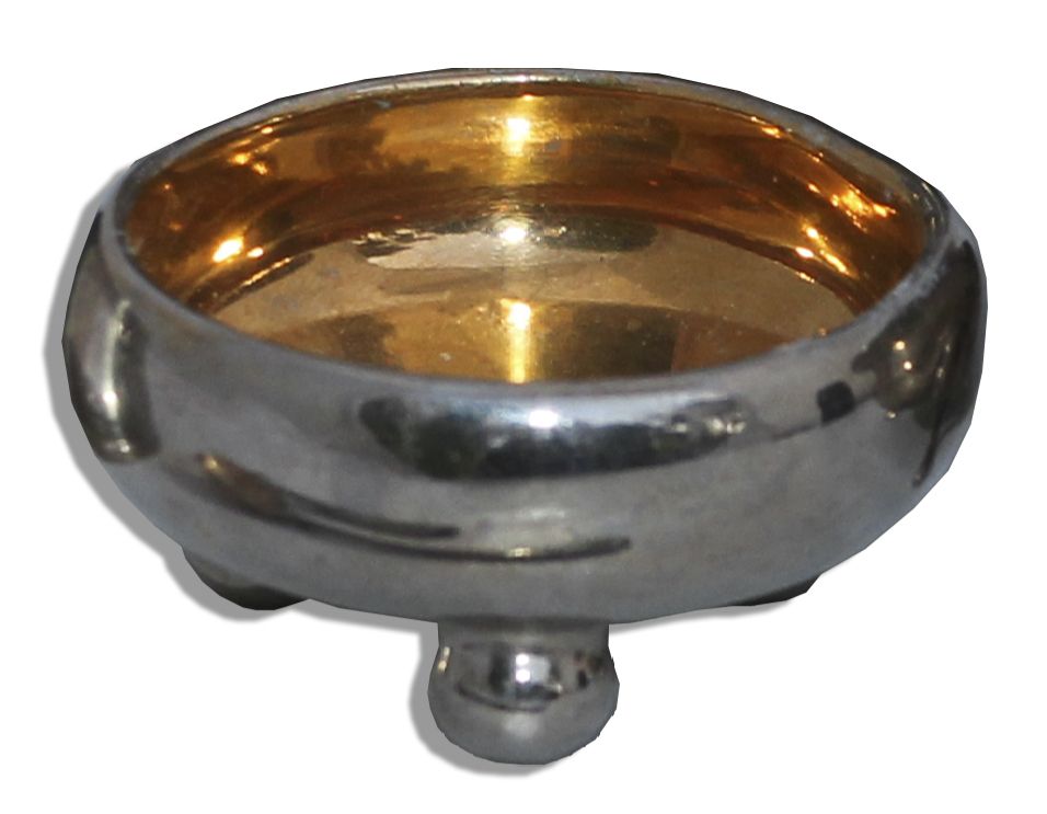 Marlene Dietrich's salt cellar. Shallow cellar on three small feet features a silver tone metal exterior and gilt interior. Measures 0.75'' in height and 1.75'' across the mouth. Light scratching, else near fine. From the estate of Marlene Dietrich.
