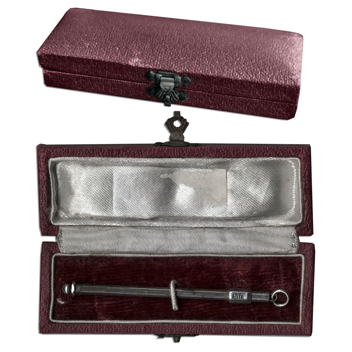 Hollywood icon Marlene Dietrich personally owned silver swizzle stick. Slider is engraved ''SIL'' and is most likely a Chinese or Colonial export circa 1920's. Stick measures 3'' with a plain hexagonal shaft and slider, and suspension ring at the end. Housed in original maroon case measuring 3.75'' x 1.5''. Minor tarnishing, else very good. From the estate of Marlene Dietrich.