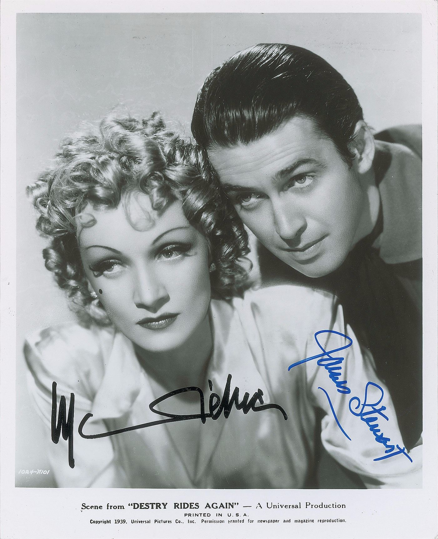 Glossy 8 x 10 photo of the pair as they appeared in Destry Rides Again, signed in black felt tip by Dietrich and blue felt tip by Stewart. In fine condition. From the Harvey and Rhoda Kuflik Collection.
