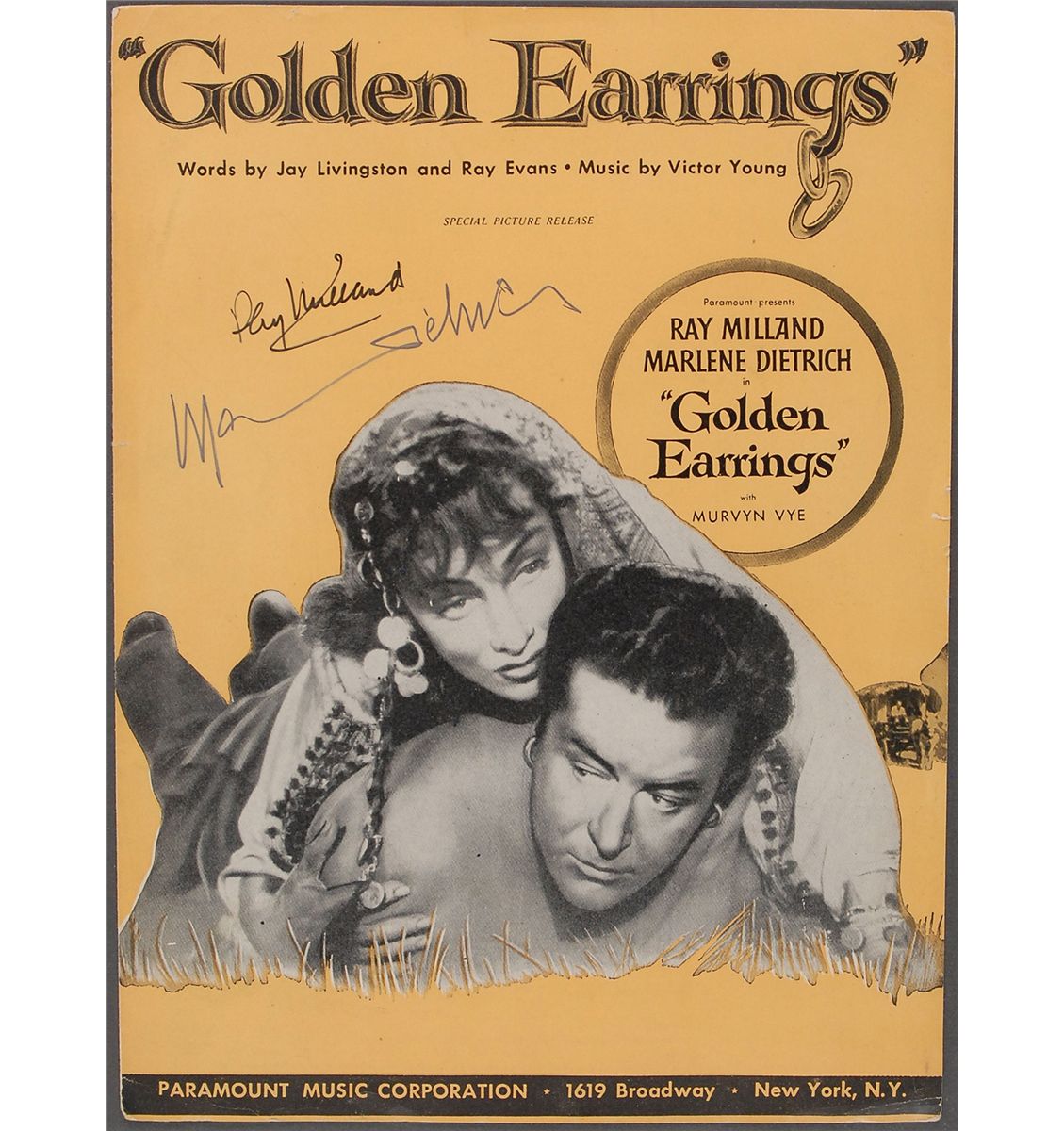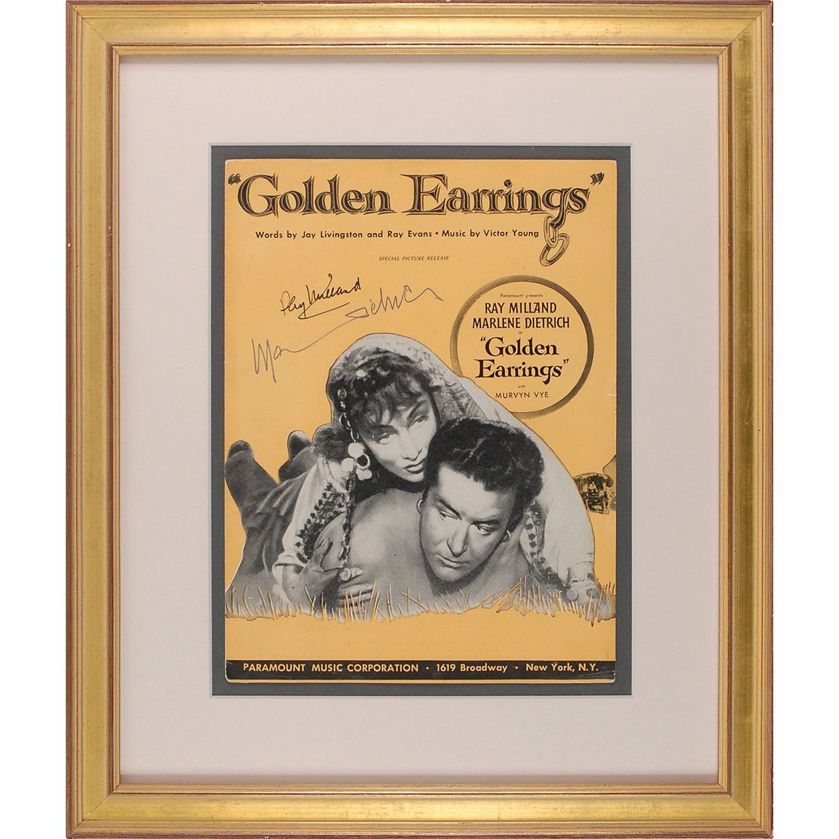 Sheet music for ‘Golden Earrings’ from the 1947 film of the same name, 9 x 12, signed on the front cover in black felt tip by Marlene Dietrich and Ray Milland. Matted and framed to an overall size of 16 x 19. In fine condition, with a few unobtrusive creases.