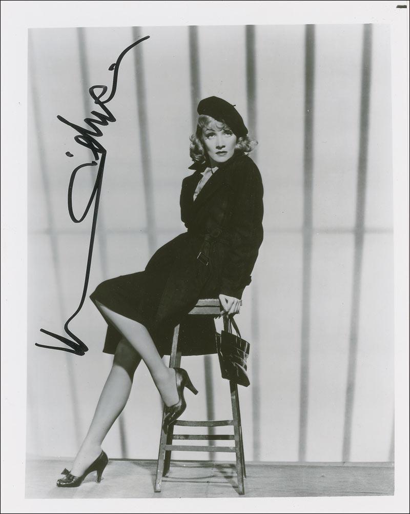 Glossy 8 x 10 photo of Dietrich perched on a stool, signed in black felt tip. In fine condition, with a few light bends.