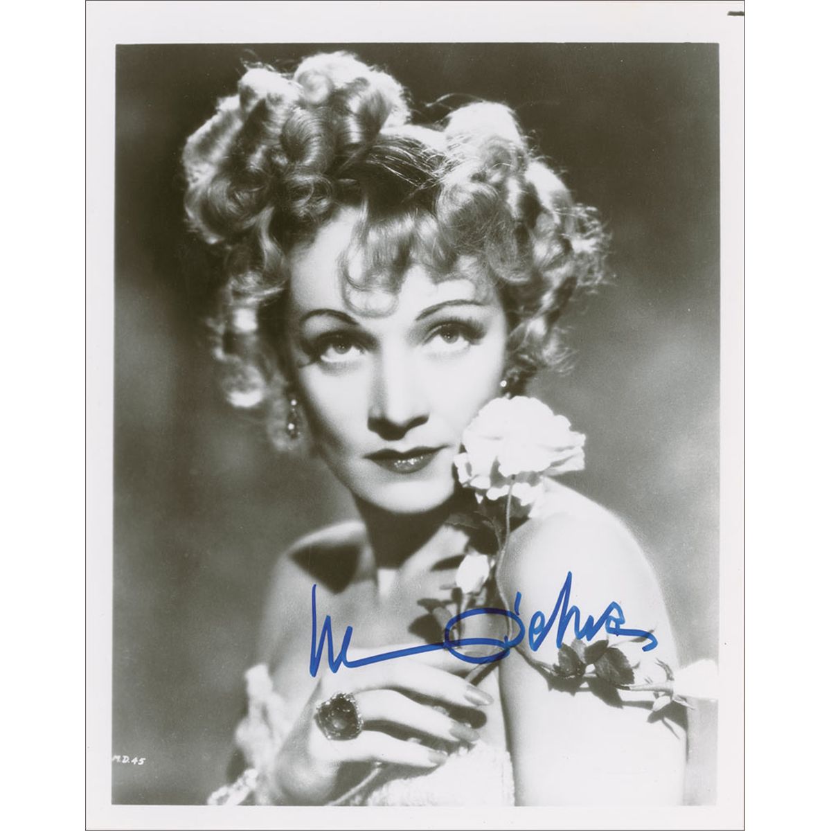 Glossy 8 x 10 photo of Dietrich holding a rose to her cheek, signed in blue felt tip. In fine condition.