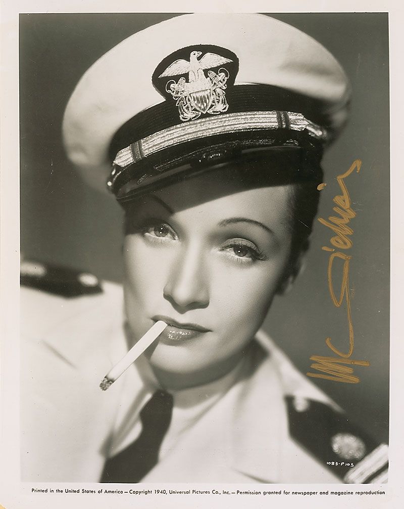 Glossy 8 x 10 Universal publicity photo of Dietrich in a naval uniform with a cigarette dangling from her mouth, signed vertically in gold ink. In fine condition.