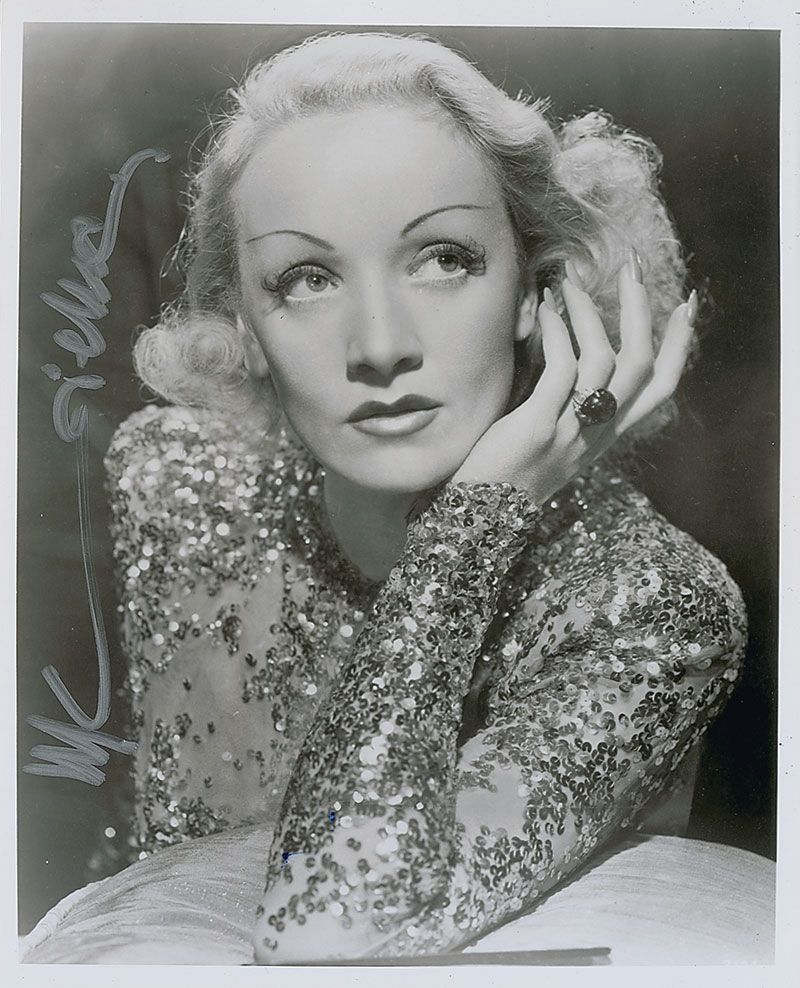 Glossy 8 x 10 photo of Dietrich in a dazzling sequined shirt, signed vertically in silver ink. In fine condition.