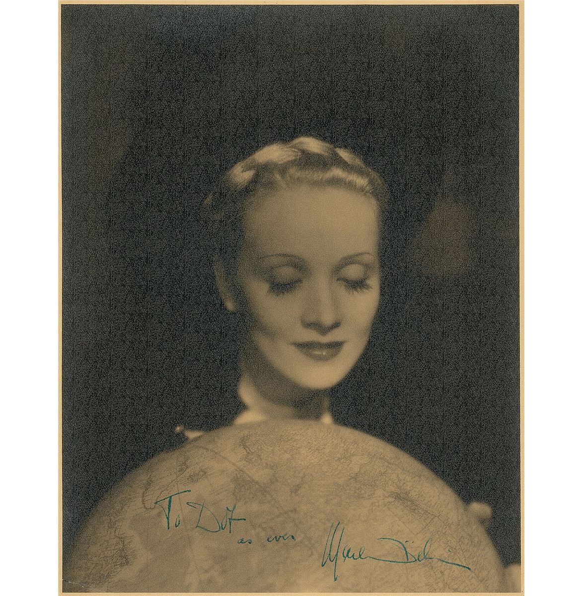 Captivating vintage matte-finish 11 x 14 photo of Dietrich gazing upon a globe, signed and inscribed in green fountain pen, “To Dot, as ever, Marlene Dietrich.” In fine condition, with a trivial tear and ding to top edge, and a single crease to lower left corner tip. The recipient of the photo was Dorothy Ponedel, Dietrich’s make-up person at Paramount, who also worked with Carole Lombard, Clara Bow, Judy Garland, and Mae West.