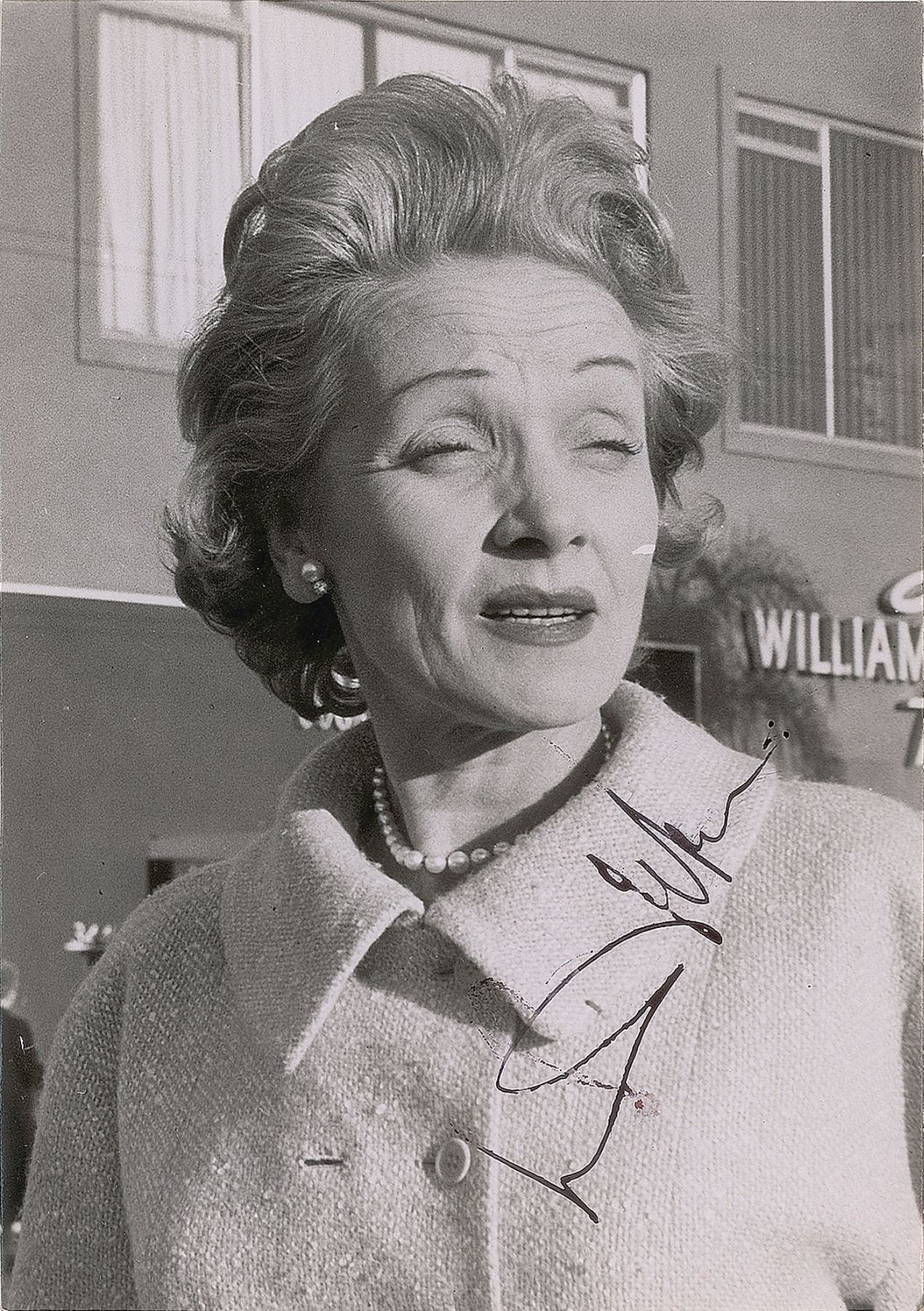 Vintage semi-glossy 3.5 x 4.75 head-and-shoulders photo of Marlene Dietrich squinting and wearing a warm coat, signed in fountain pen. In fine condition.