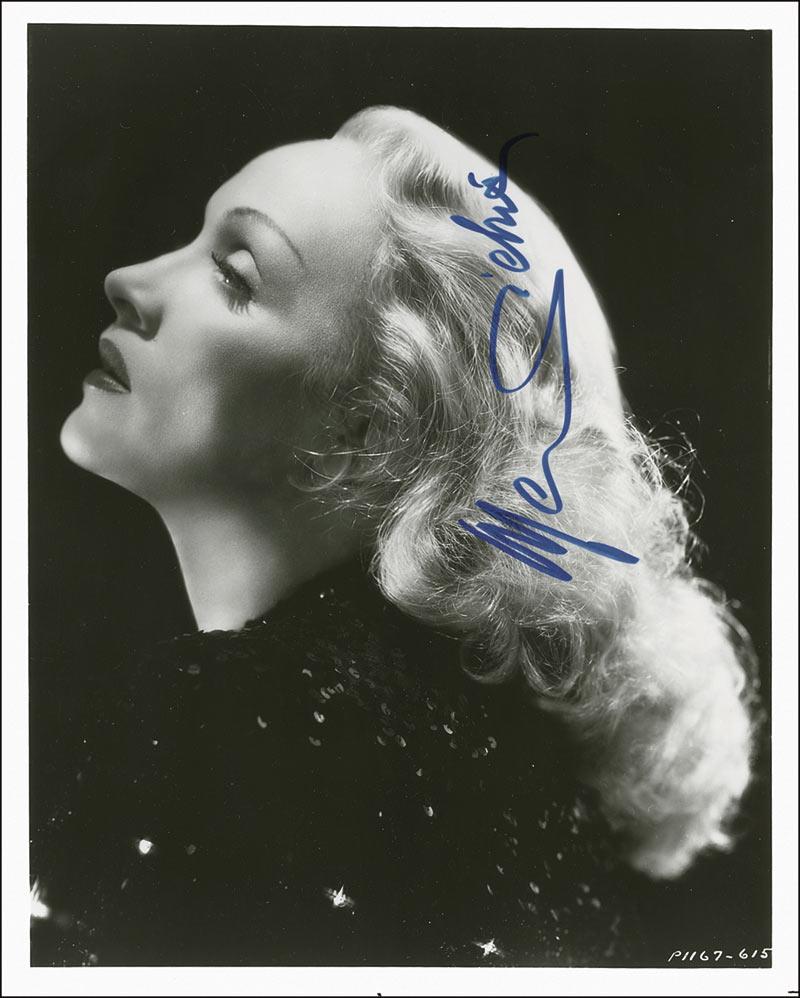 Lovely glossy 8 x 10 photo of Dietrich with her head thrown back, signed vertically in blue felt tip. In very fine condition. Pre-certified PSA/DNA and RRAuction COA.